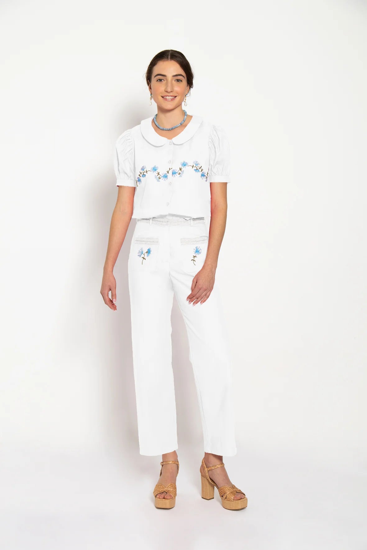 - Top: Cropped short-sleeve button-front shirt with a rounded collar and puffed sleeves. Embroidered with light blue and soft lavender daisies with green stems across the chest.