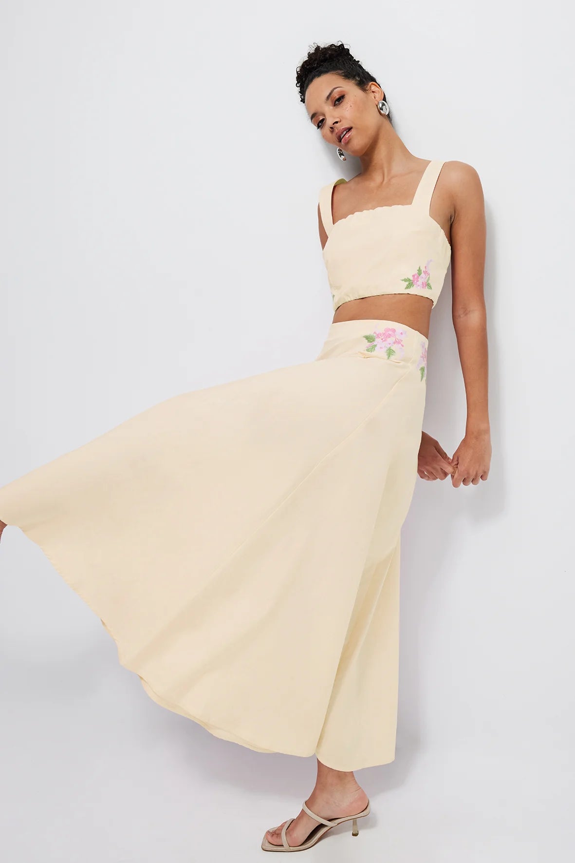 Soft and romantic, this two-piece set brings a delicate touch to modern femininity. The embroidered spring daisy floral details and flowing silhouette create an effortlessly graceful look, perfect for warm-weather moments.