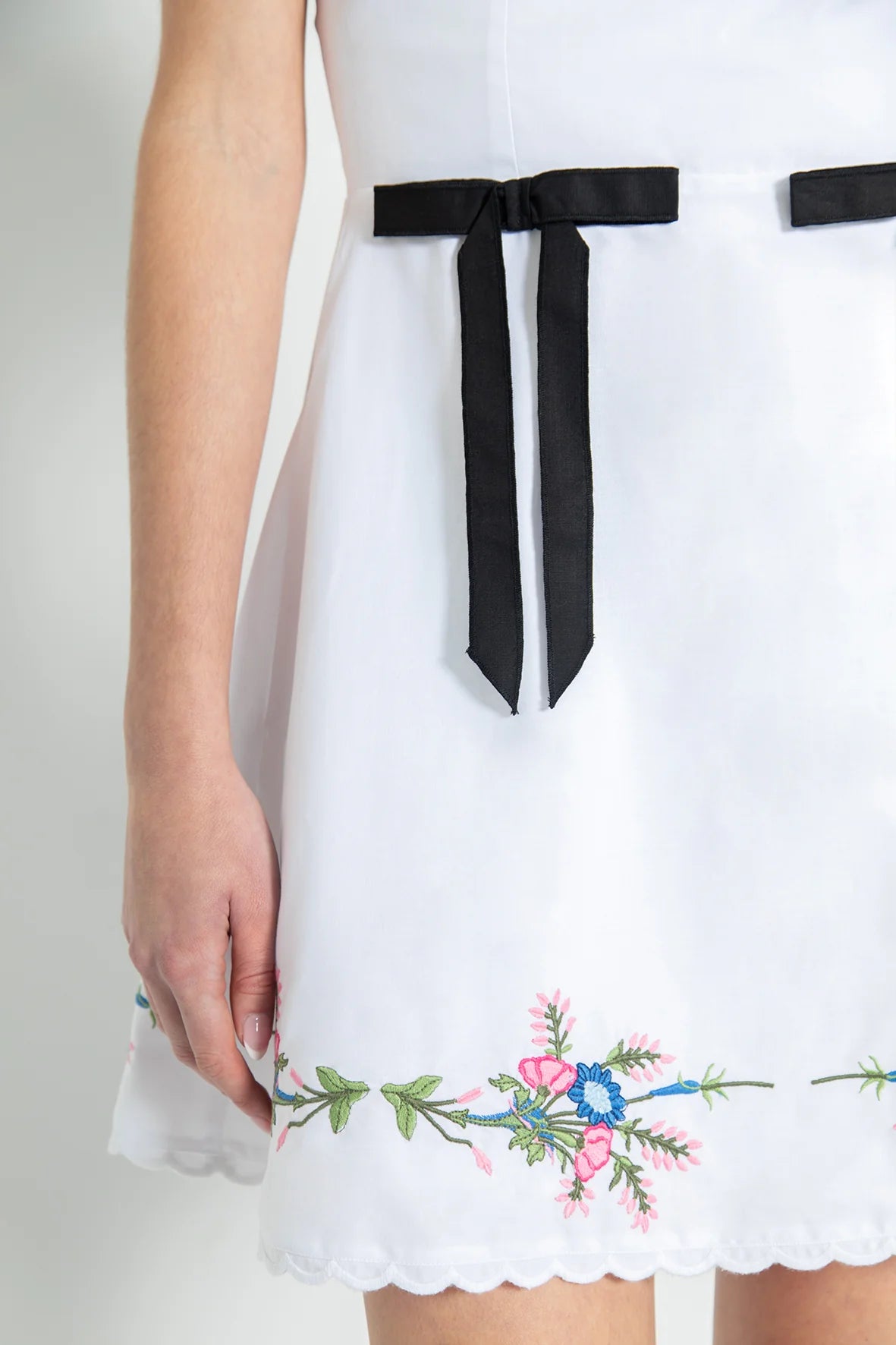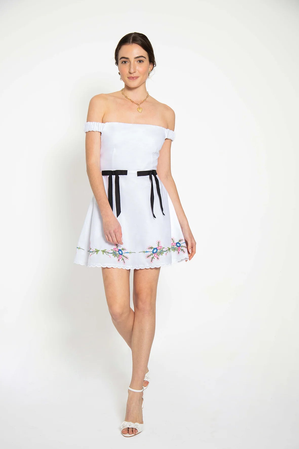 This off-the-shoulder mini dress blends playful charm with timeless elegance. Delicate embroidery and bow details make it a standout for any special occasion.