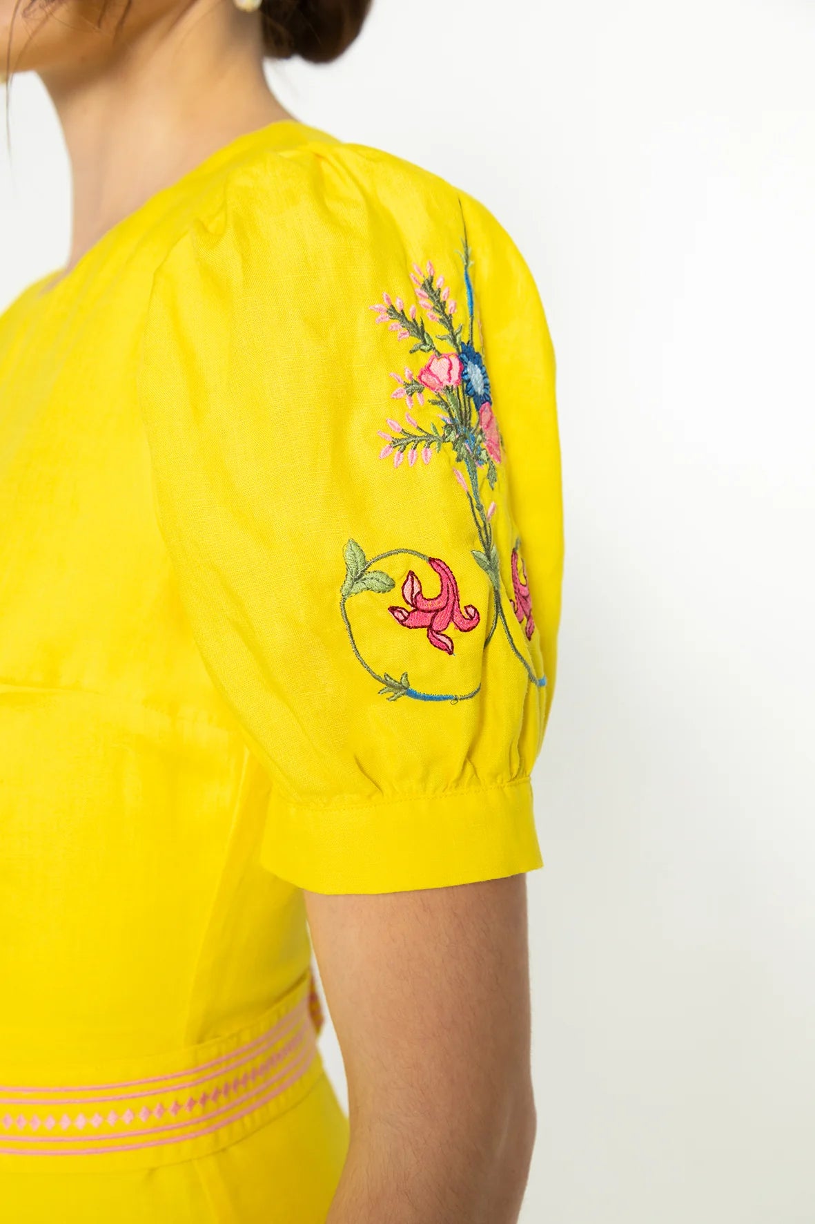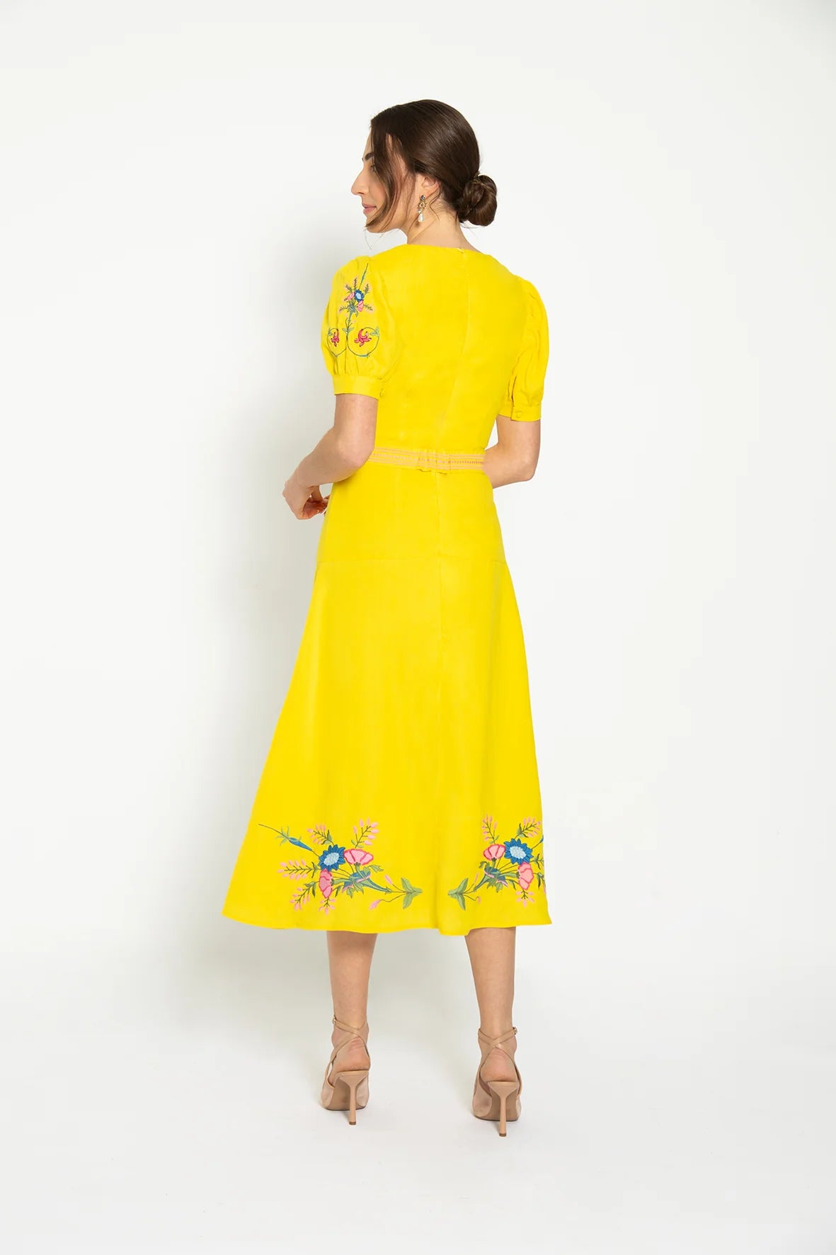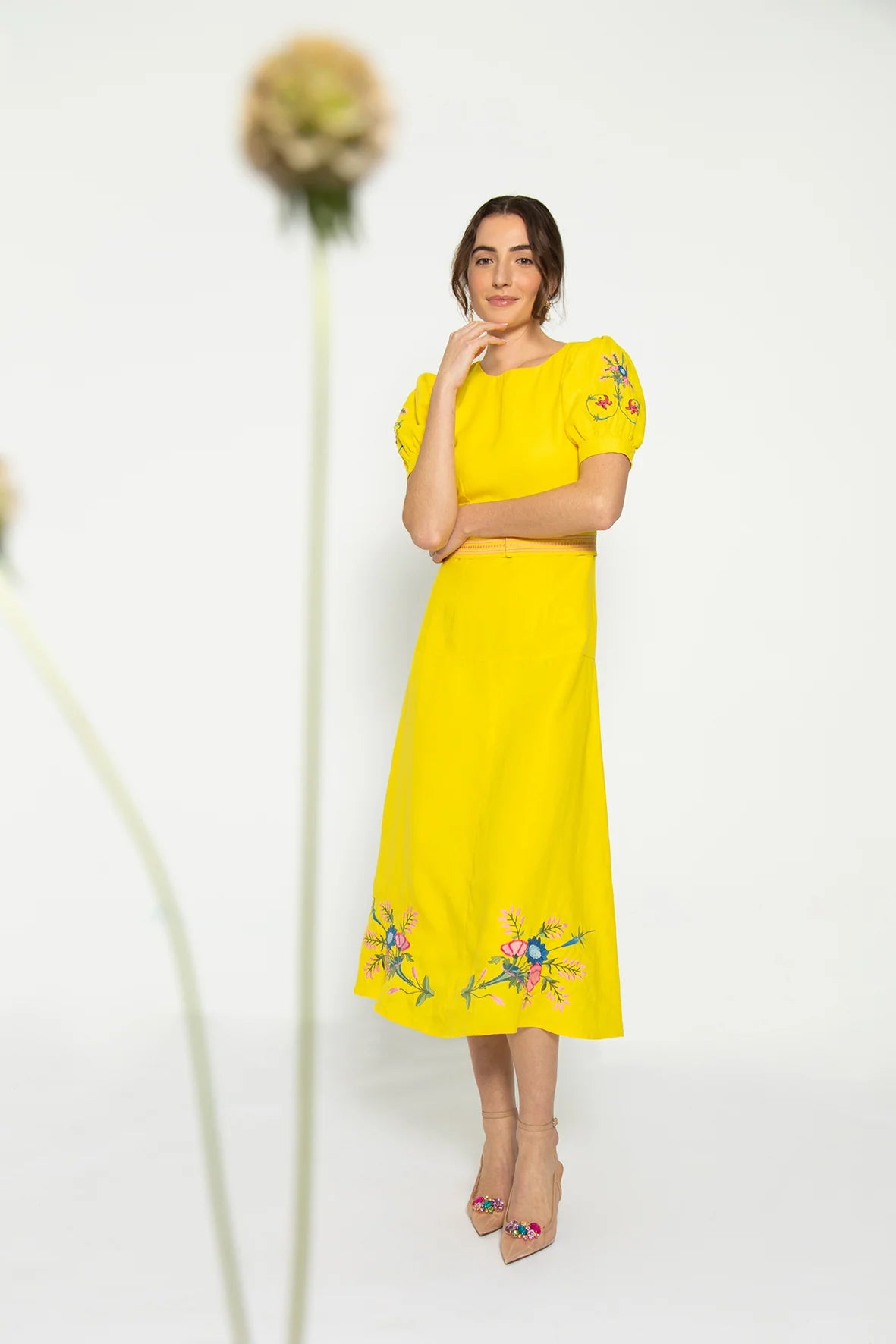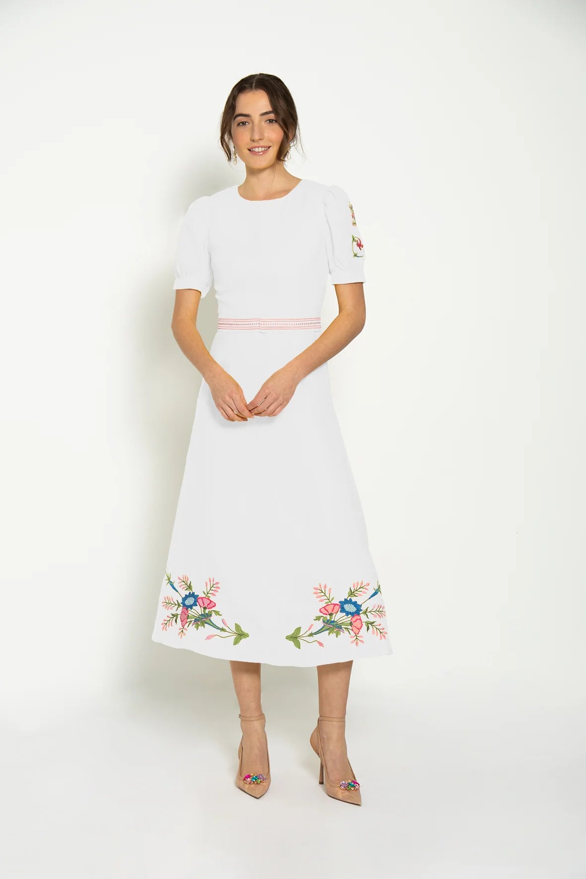 This midi dress brings elegance to every occasion. With its classic silhouette, bright floral embroidery, and flattering fit, it’s a perfect choice for anything from weddings to weekend brunches.