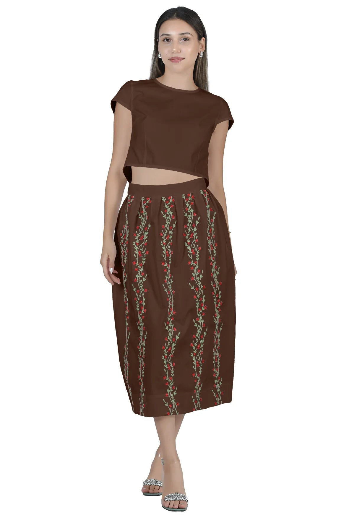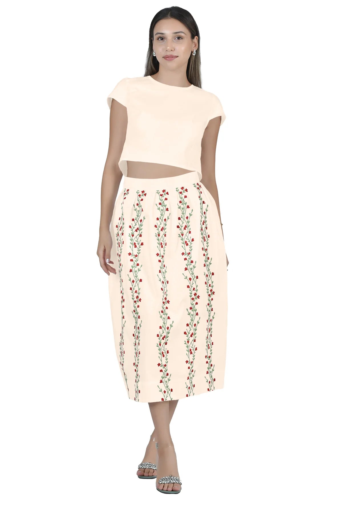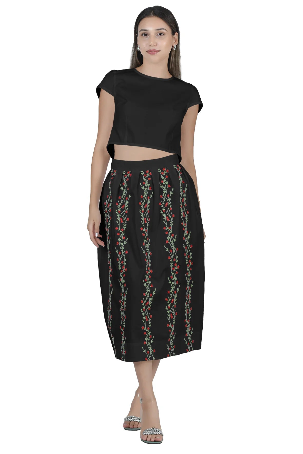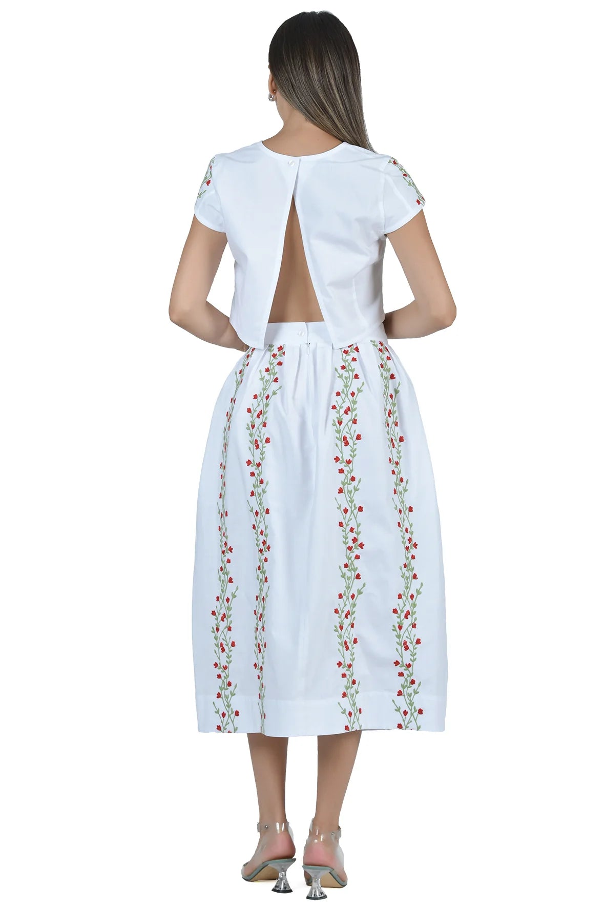 This set embodies a chic yet playful style that is perfect for any occasion. It features a cropped top with a stunning open back and a delightful midi-length skirt adorned with exquisite floral vine embroidery, creating a look that effortlessly blends sophistication and fun.