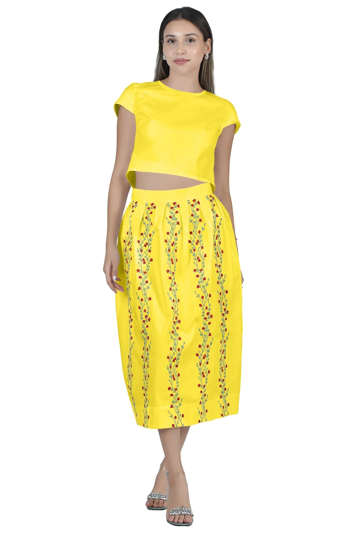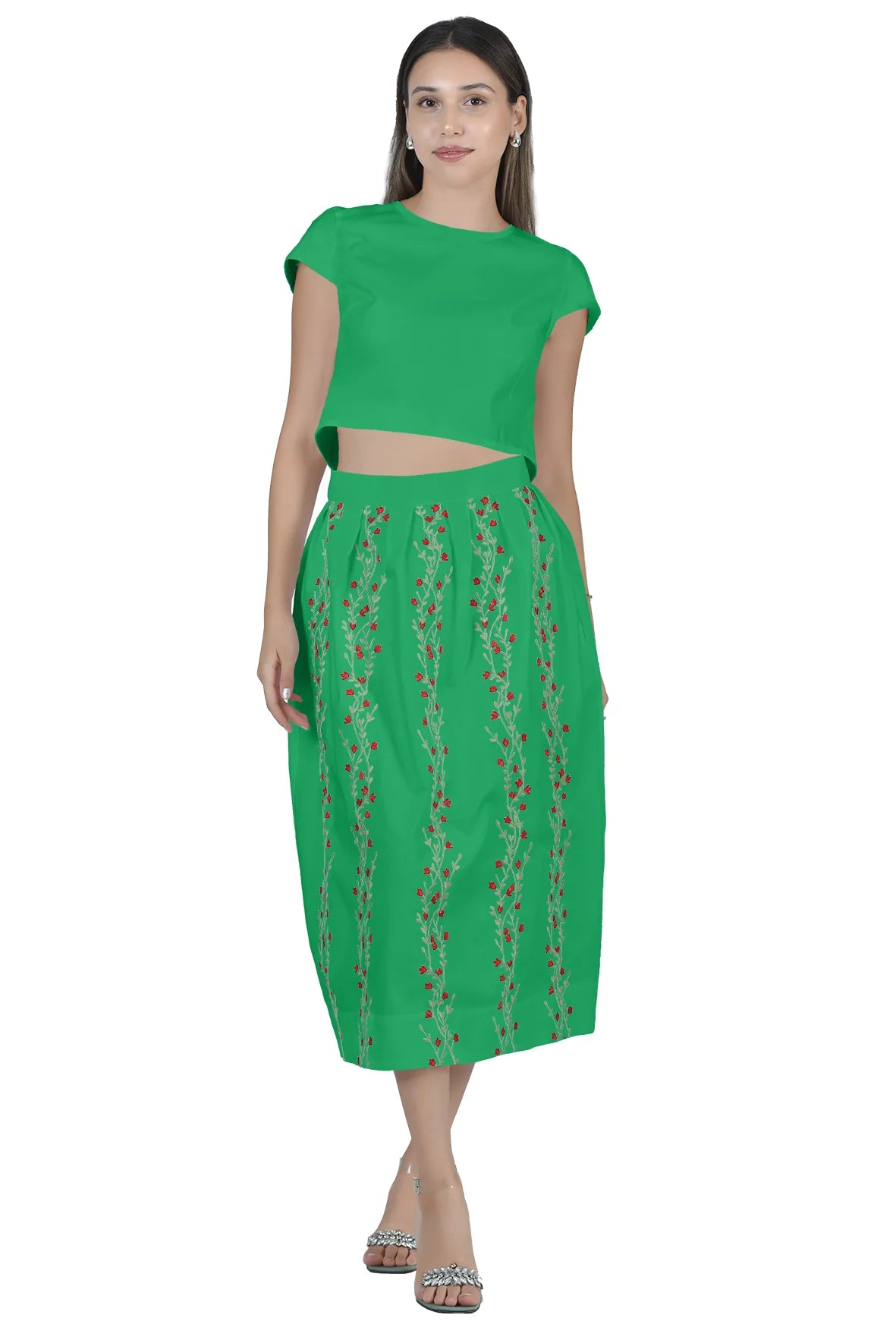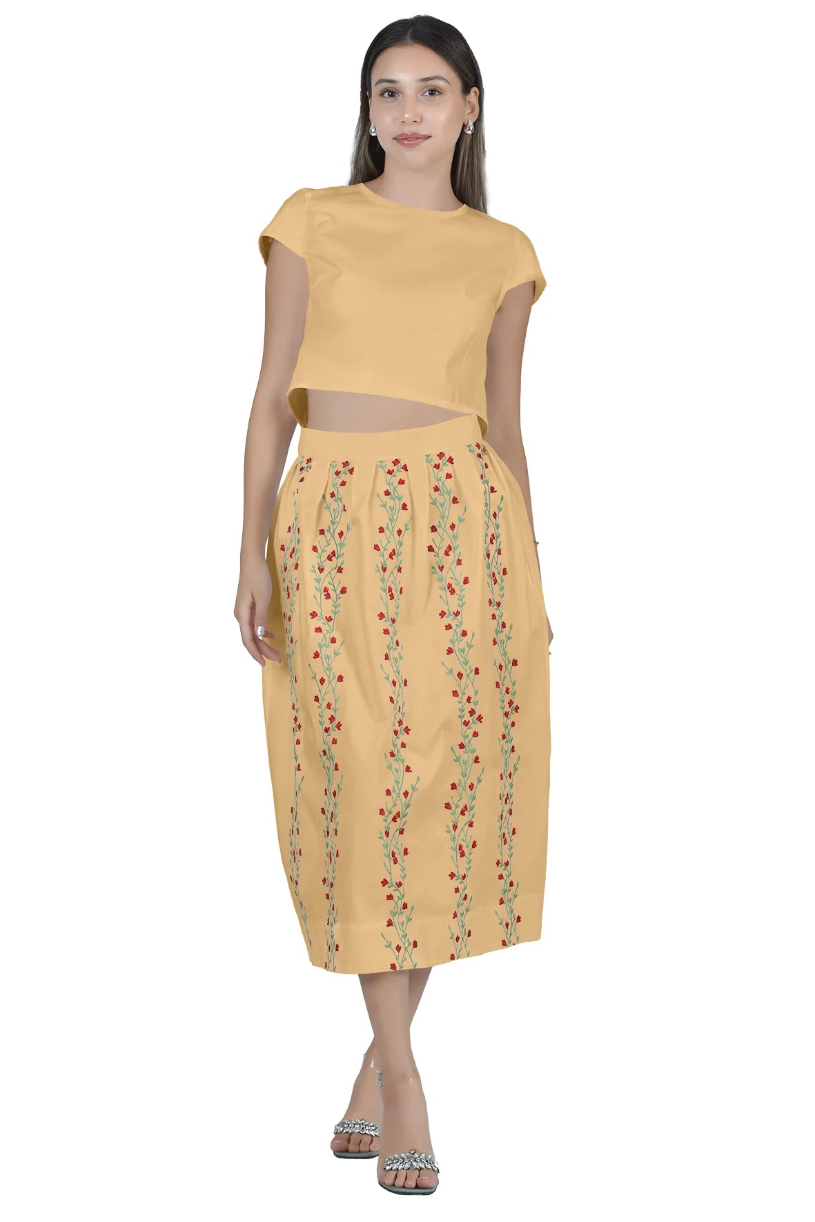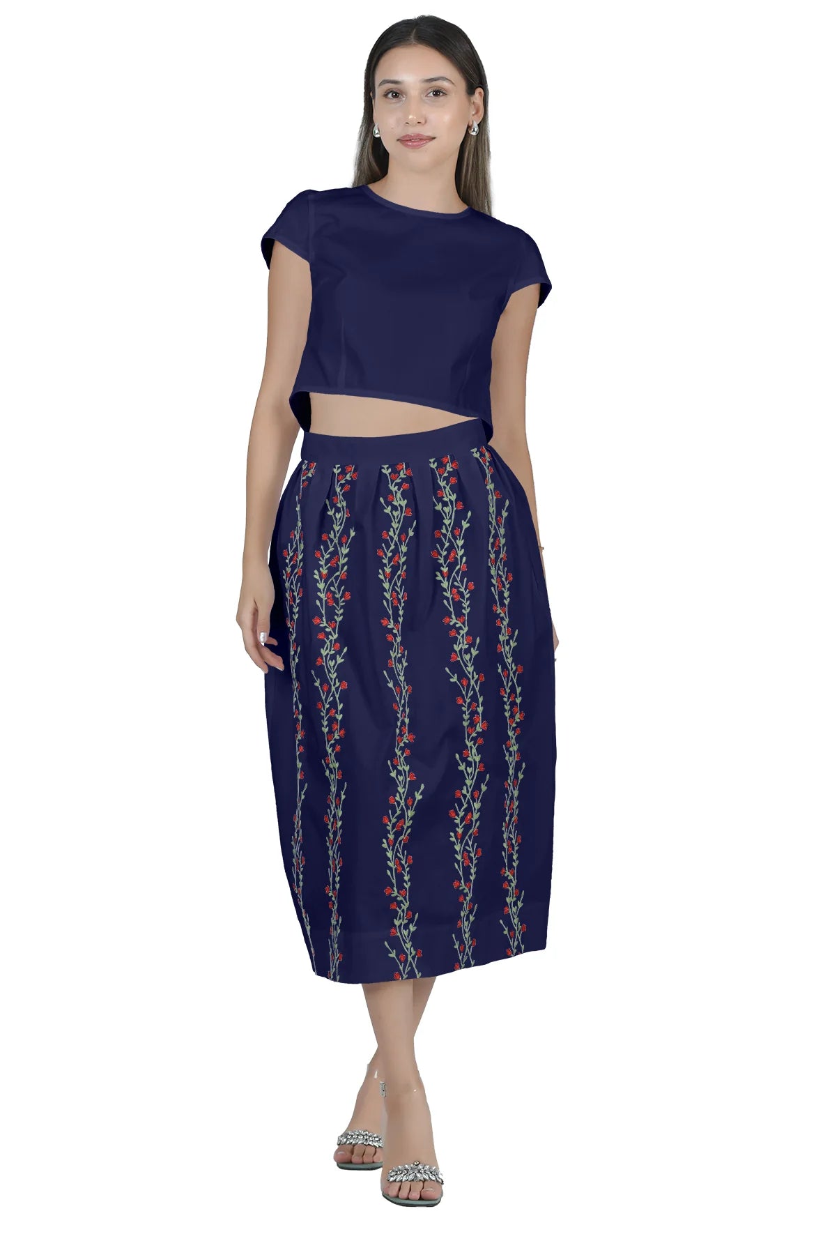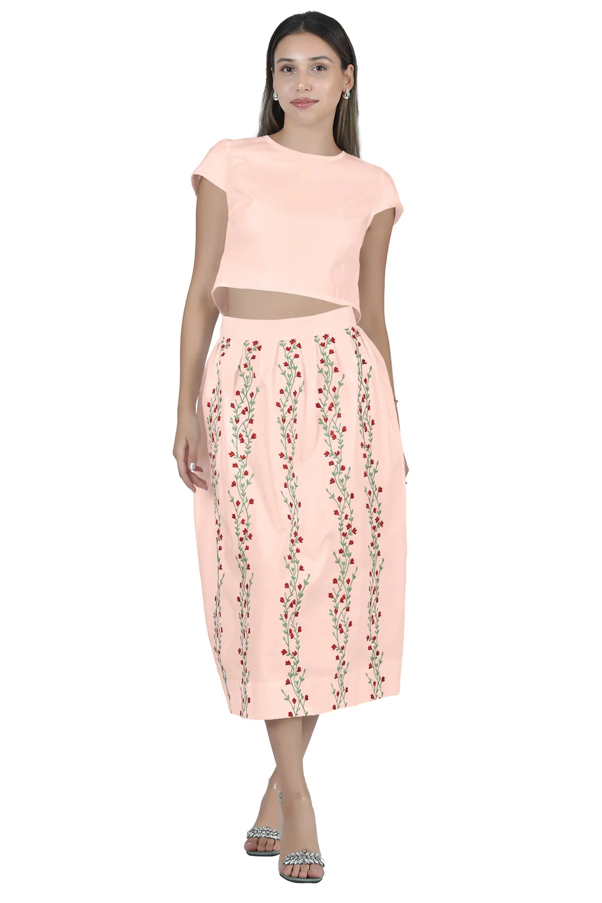 This set embodies a chic yet playful style that is perfect for any occasion. It features a cropped top with a stunning open back and a delightful midi-length skirt adorned with exquisite floral vine embroidery, creating a look that effortlessly blends sophistication and fun.