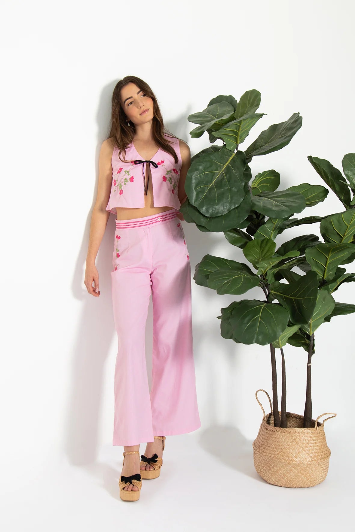 - Top: Sleeveless, V-neck, and tie-front cropped design, featuring pink floral embroidery that climbs from the hemline, intertwined with delicate green vines.