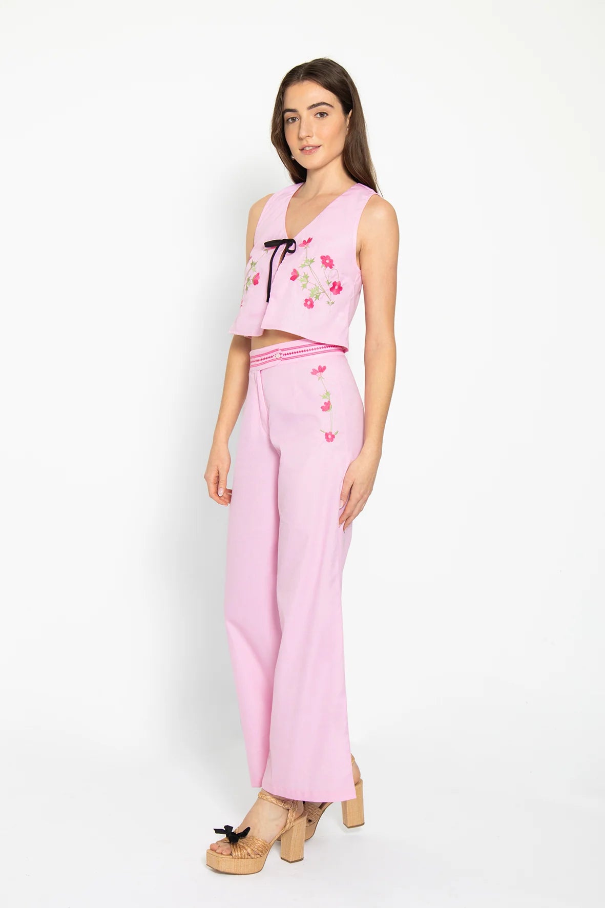 This two-piece set features a tie-front cropped top and flare-leg pants in textured pink and white cotton with a subtle dot pattern. Floral embroidery climbs from the top’s hem, while the pants are finished with geometric waistband details and matching side seam florals.