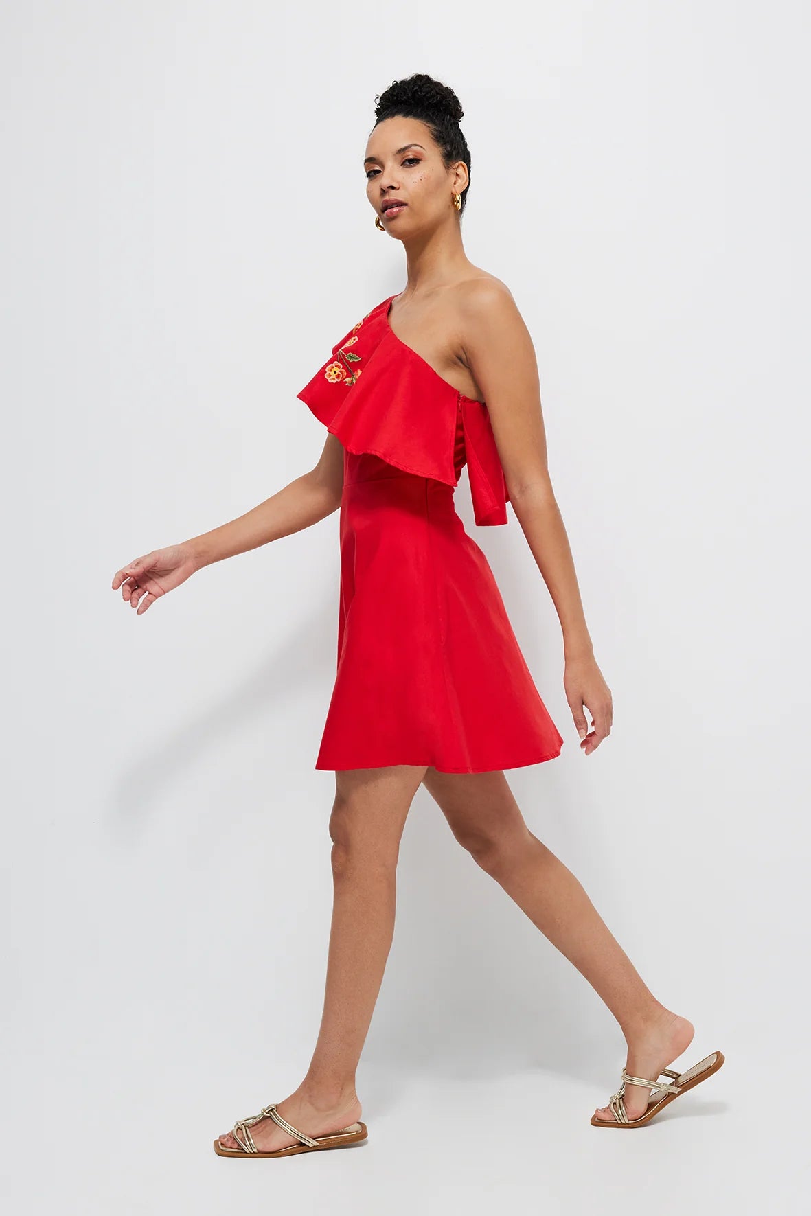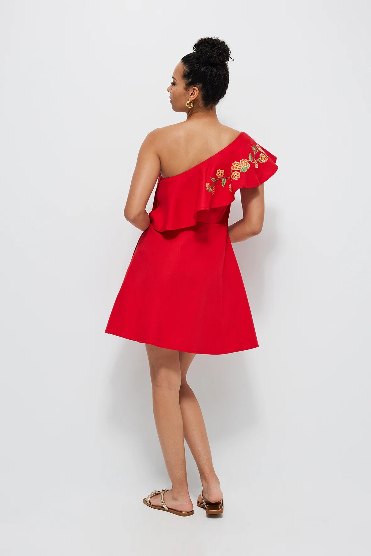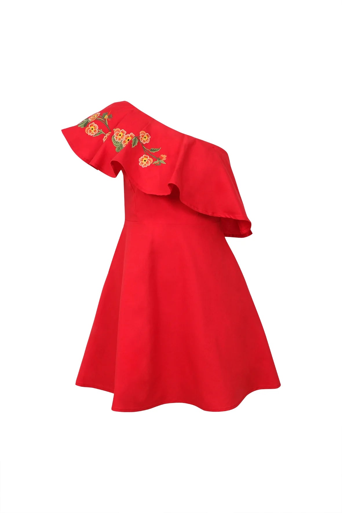 Make a statement with this effortlessly chic one-shoulder dress, designed with feminine ruffle details and delicate floral embroidery. Whether you're heading to a cocktail party or packing for a getaway, this timeless silhouette ensures elegance with ease.