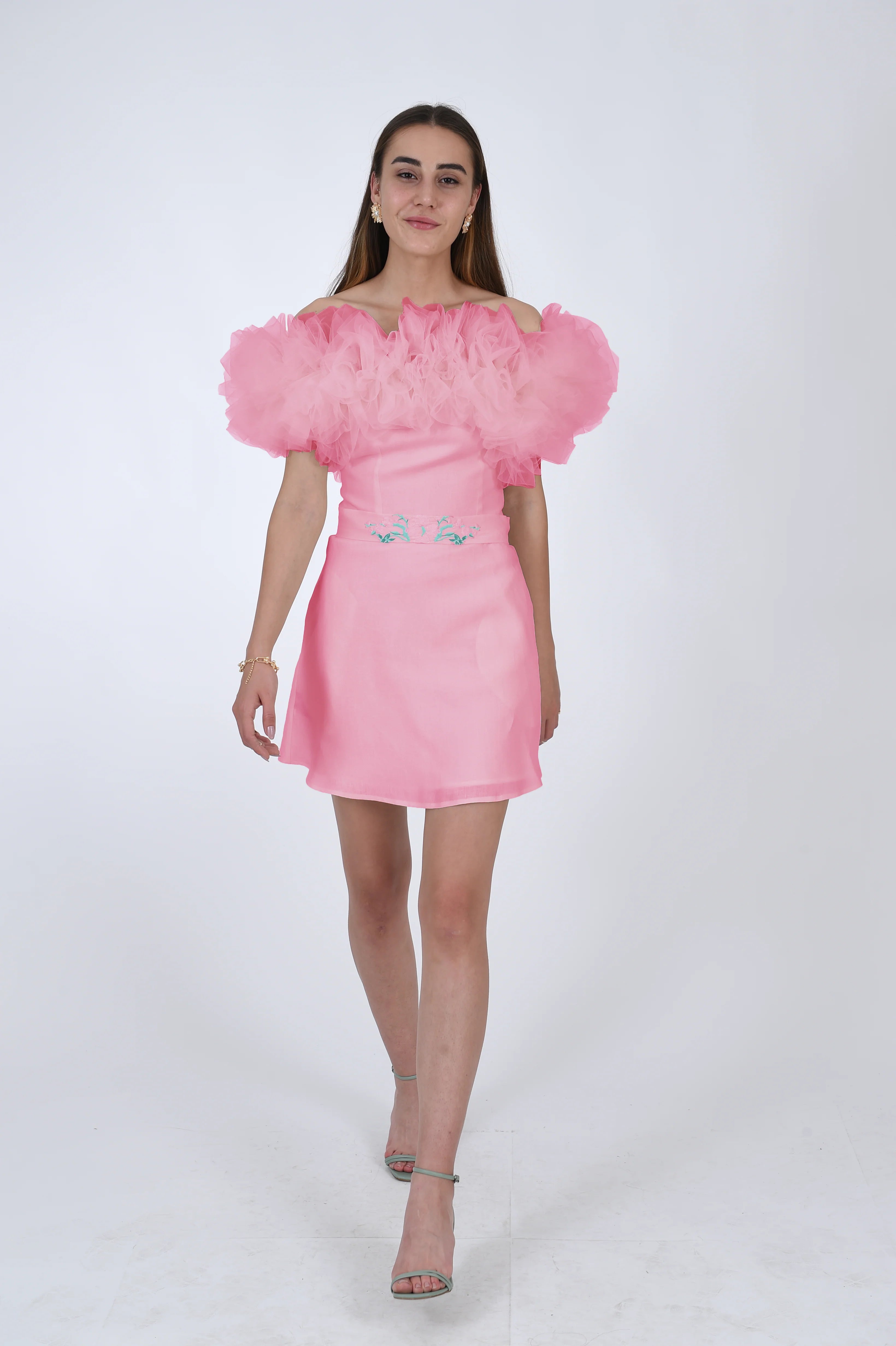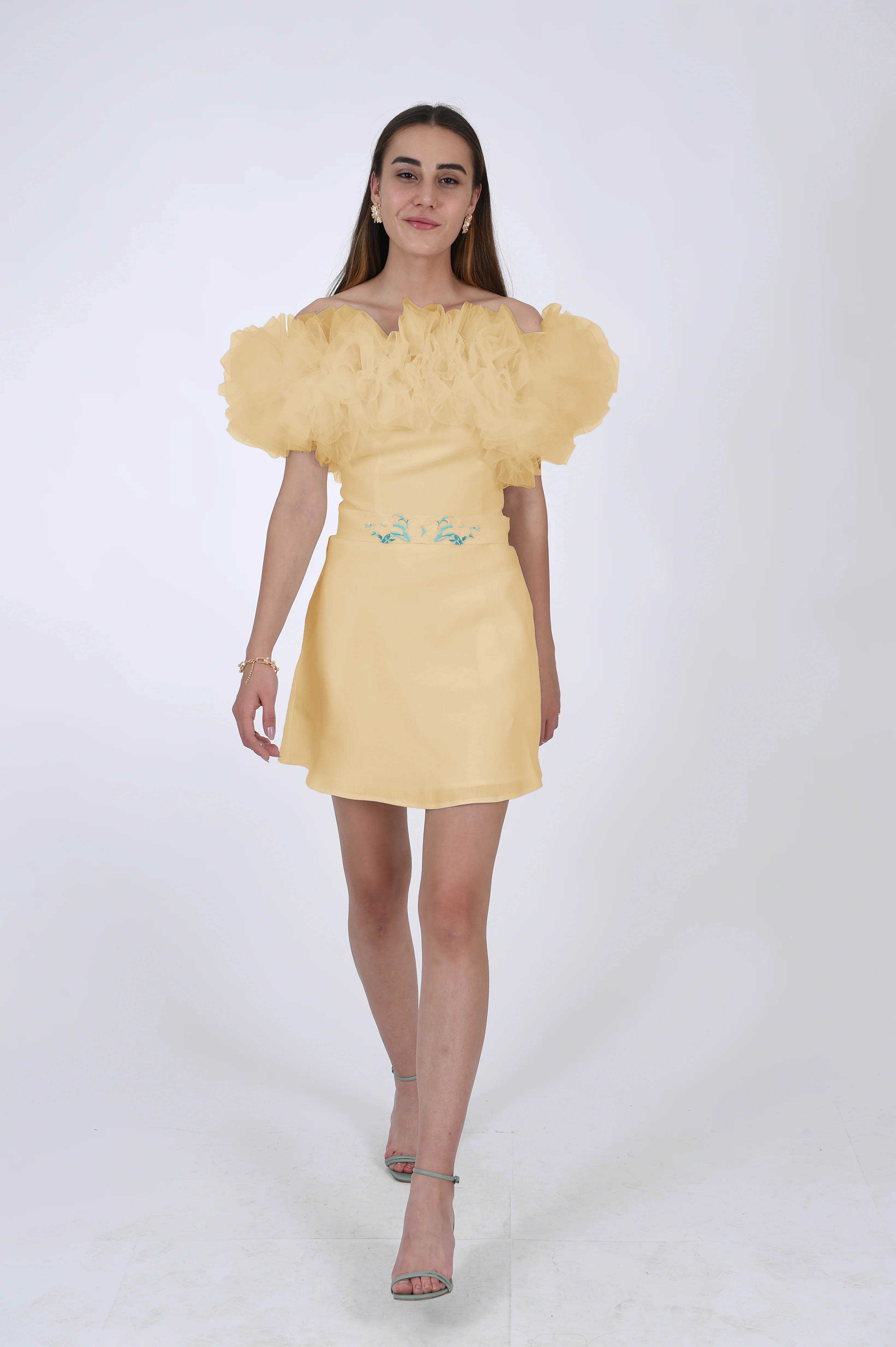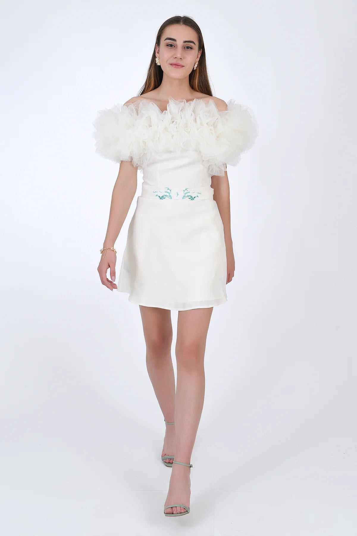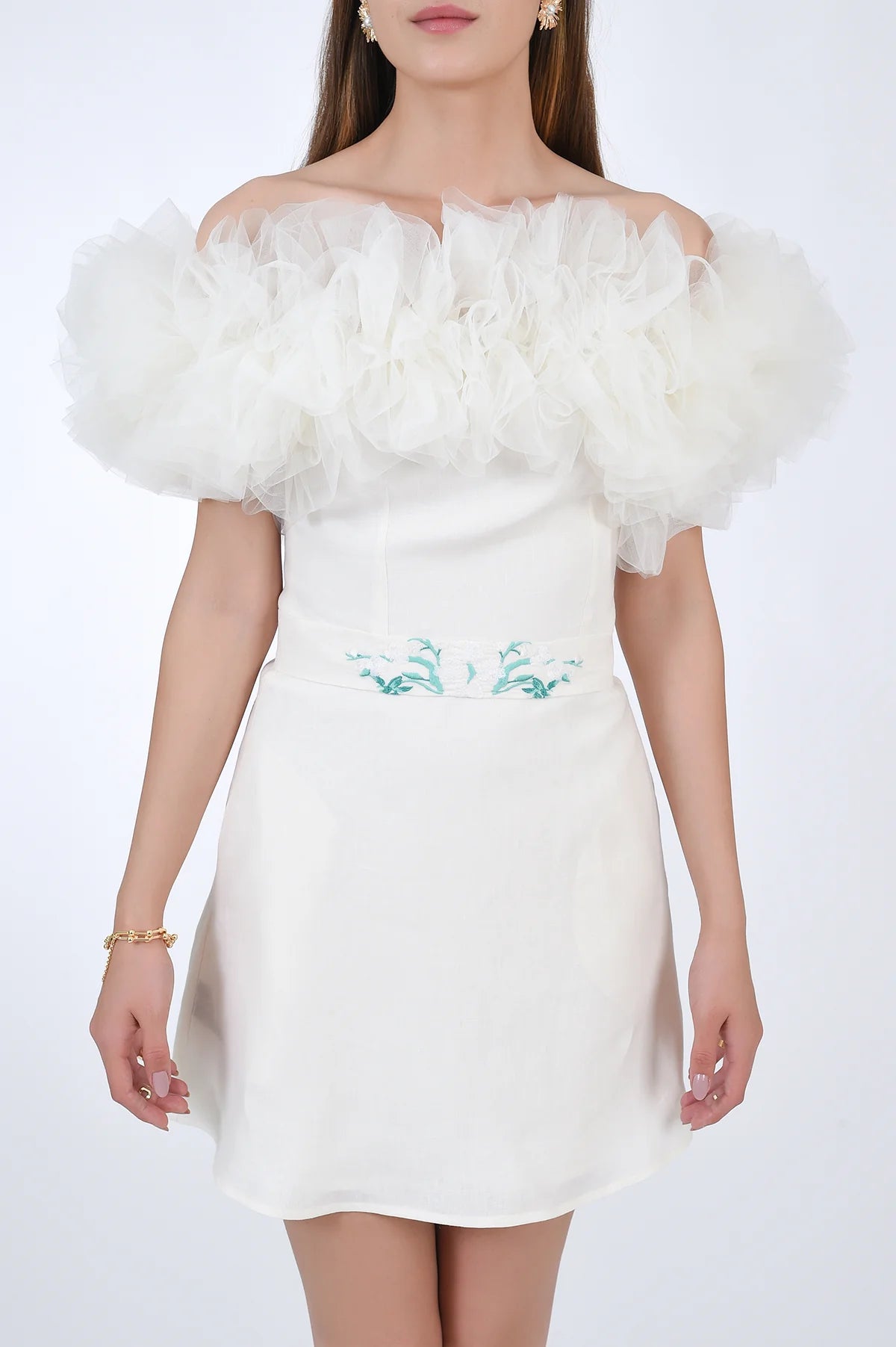 Stunning mini dress crafted from 100% lightweight, breathable cotton poplin. This A-line dress features off-the-shoulder tulle sleeves and delicate embroidery on the body, with a detachable belt and side pockets for added functionality
