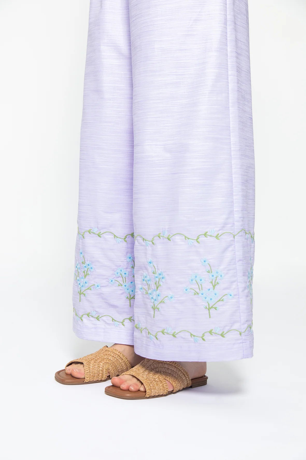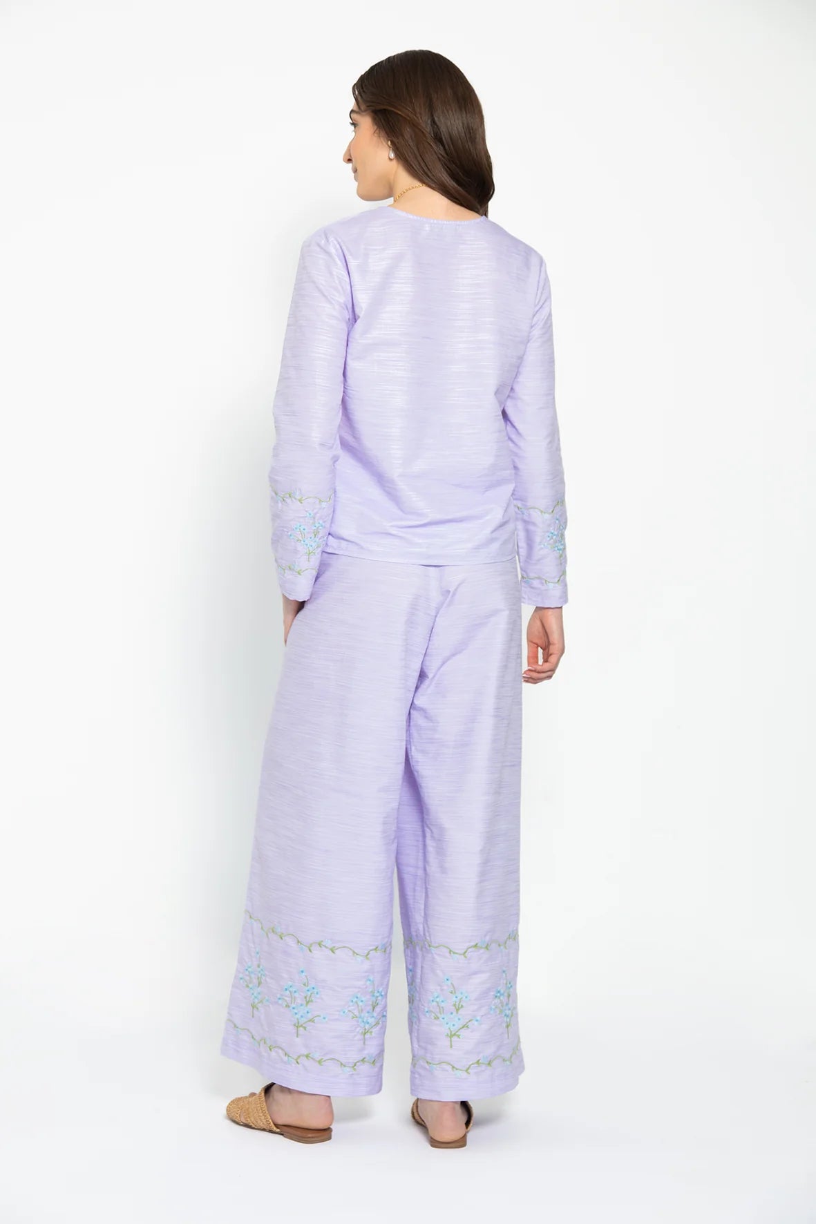 - Pant: Wide-leg pants with an elastic waistband for effortless comfort, finished with coordinating blue floral embroidery along the hem for a cohesive, coordinating touch.