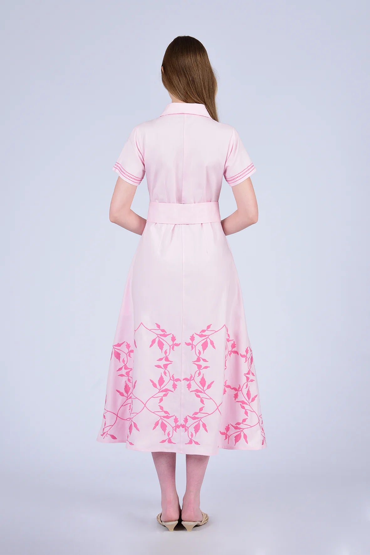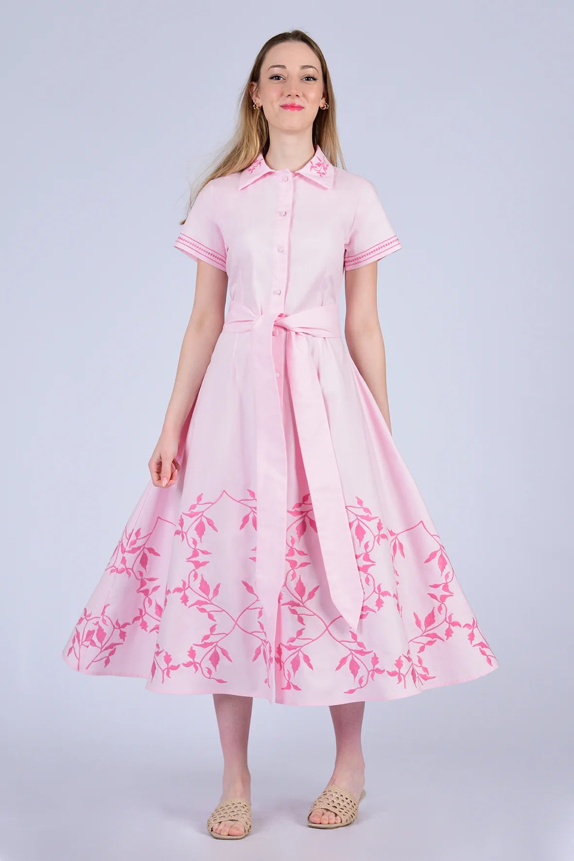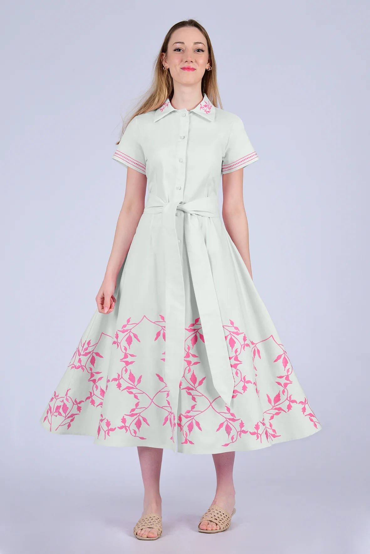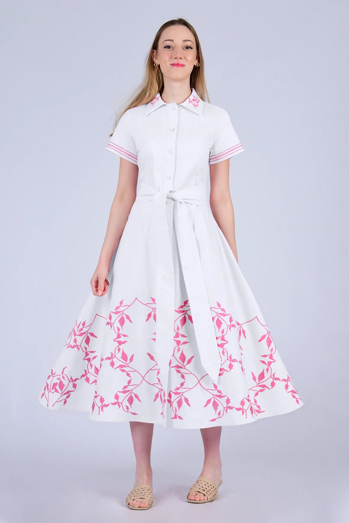 Created in collaboration with Monica Lavin, this feminine take on a classic shirt dress features delicately embroidered florals that climb from hem, bringing effortless romance to everyday dressing.