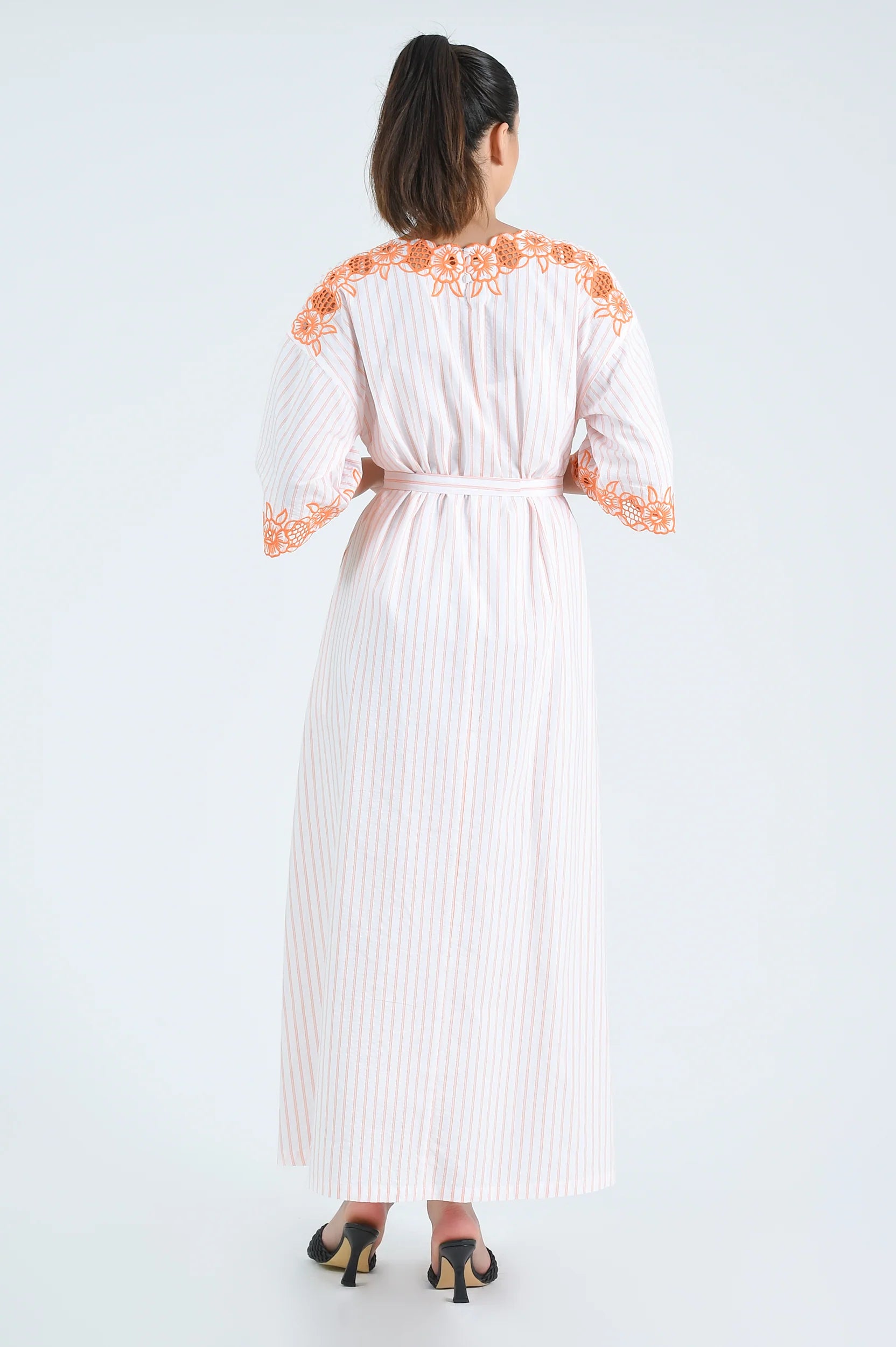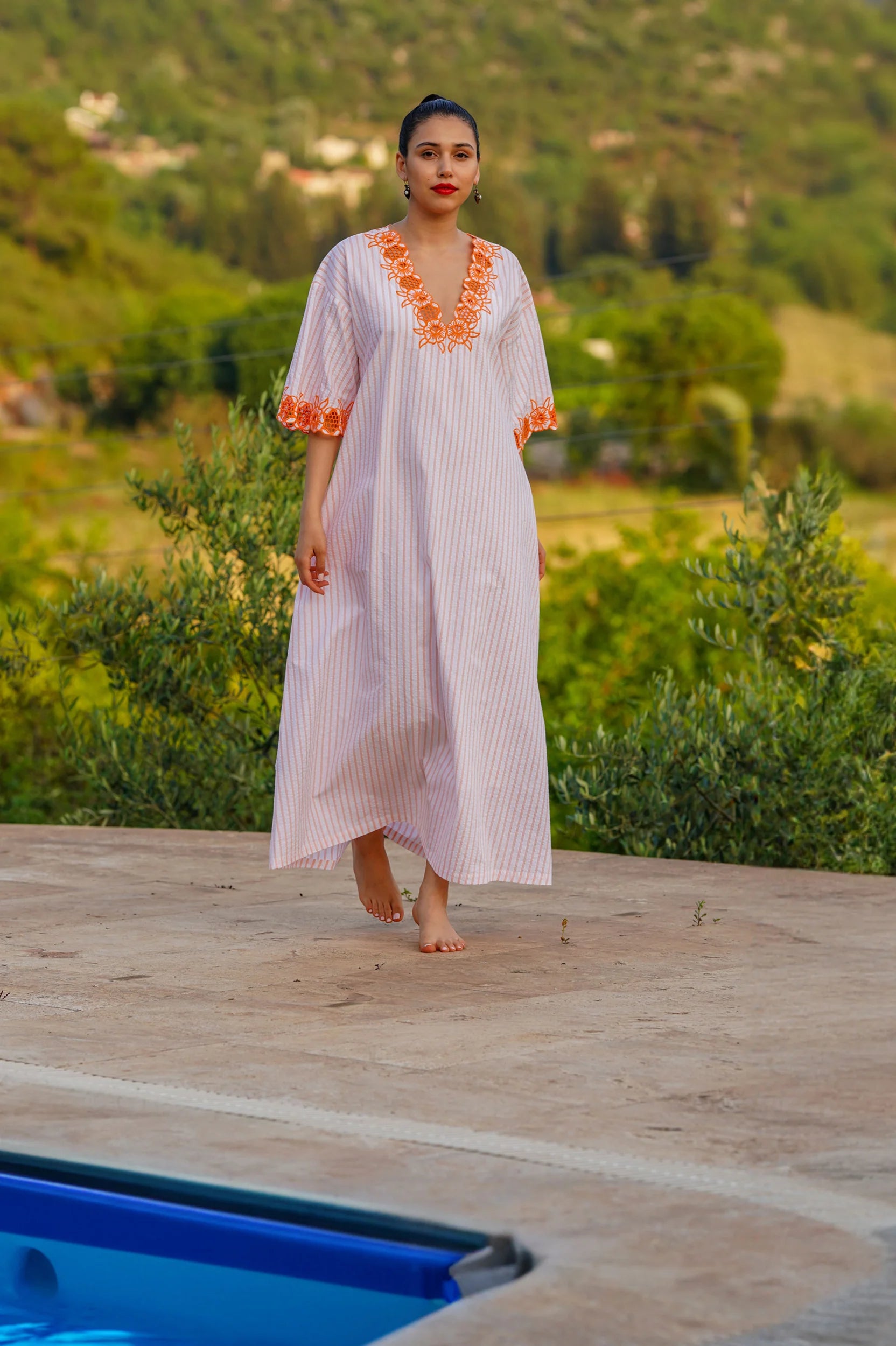 Effortlessly chic, our Kaftan Dress boasts exquisite embroidery, a V-neck design, an optional tie belt, and convenient side pockets for added functionality.