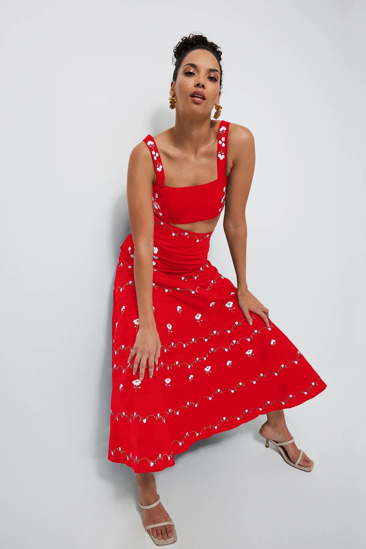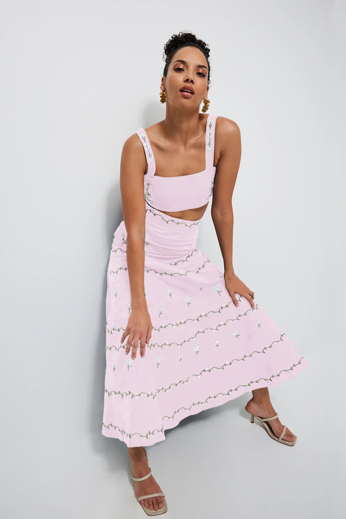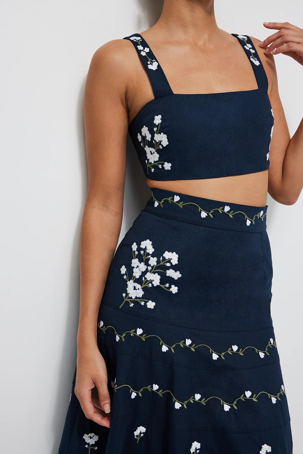 Effortlessly romantic, this 100% cotton two-piece set features a floral-embroidered bralette top and a flowing maxi skirt adorned with wild white flowers and delicate vines.