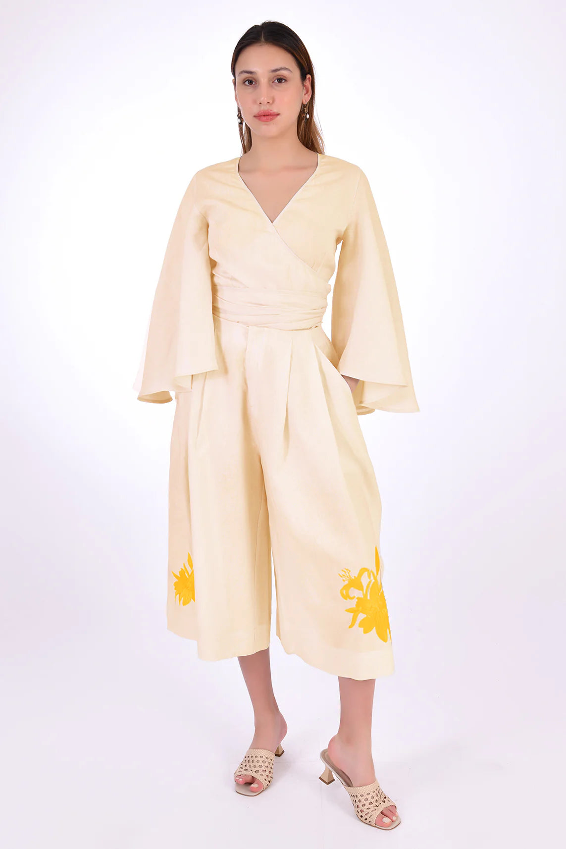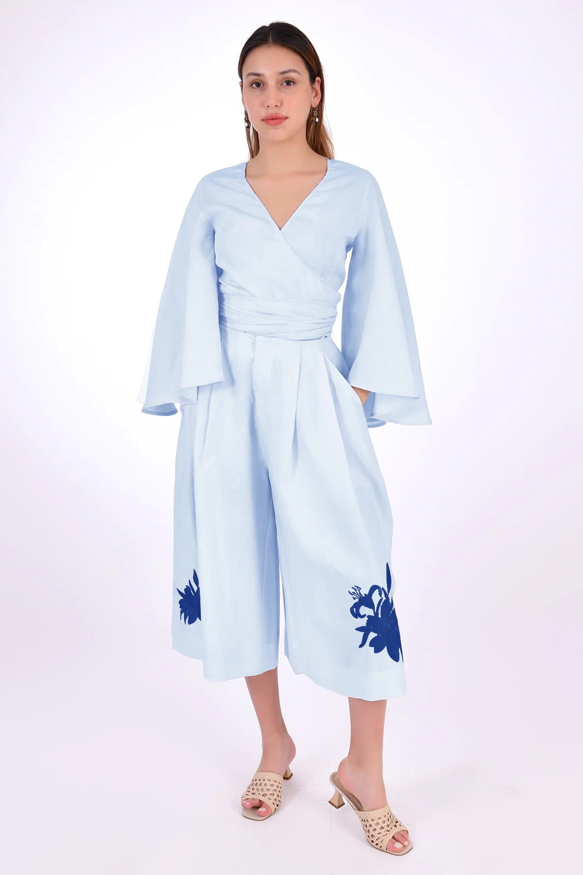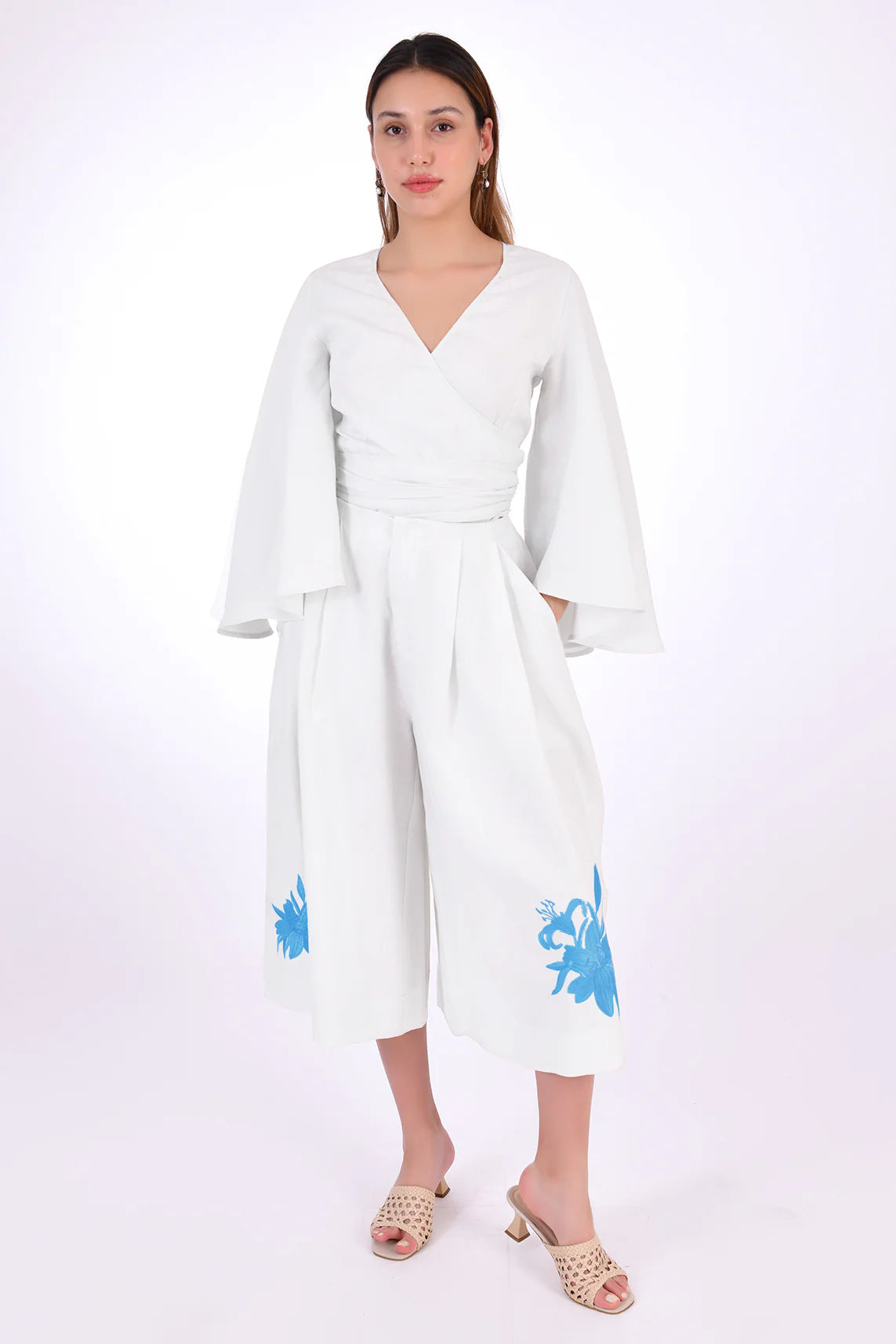 2-Piece Cotton Shorts & Top Set. Featuring a wrap top with wide long sleeves and long pleated shorts with embroidery.