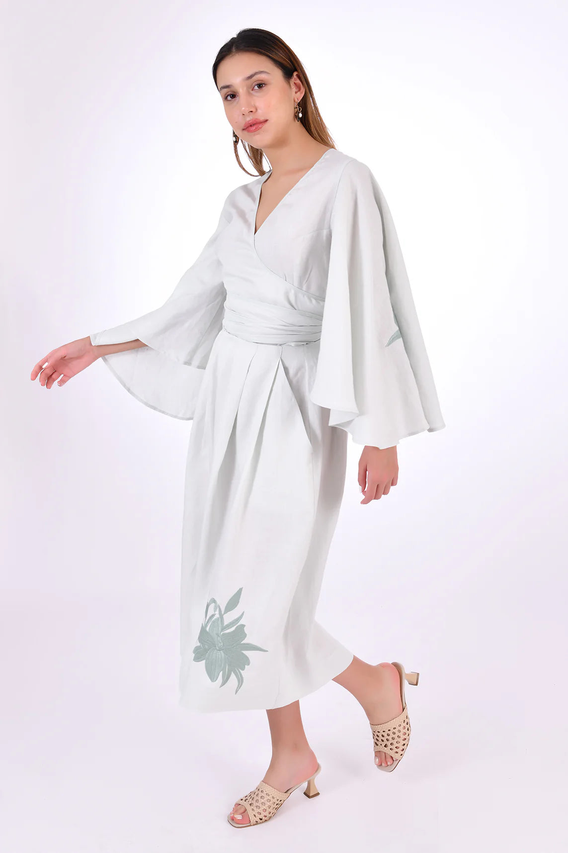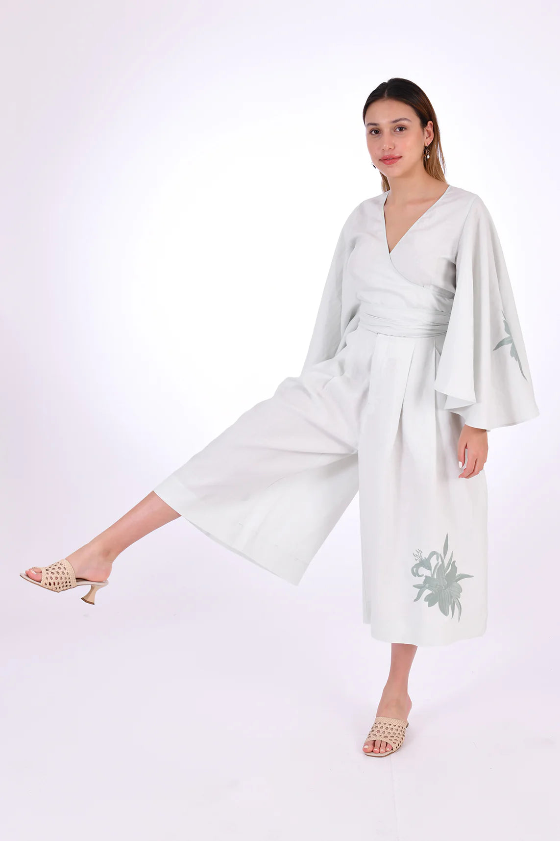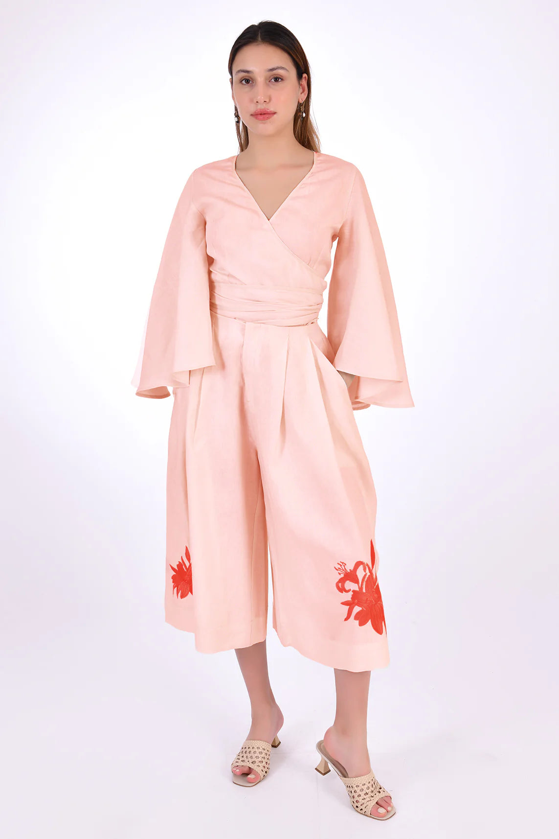 2-Piece Cotton Shorts & Top Set. Featuring a wrap top with wide long sleeves and long pleated shorts with embroidery.