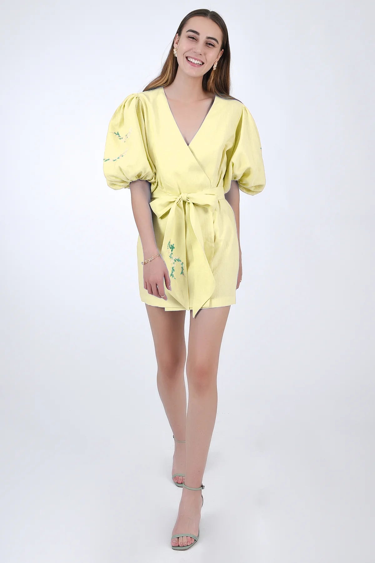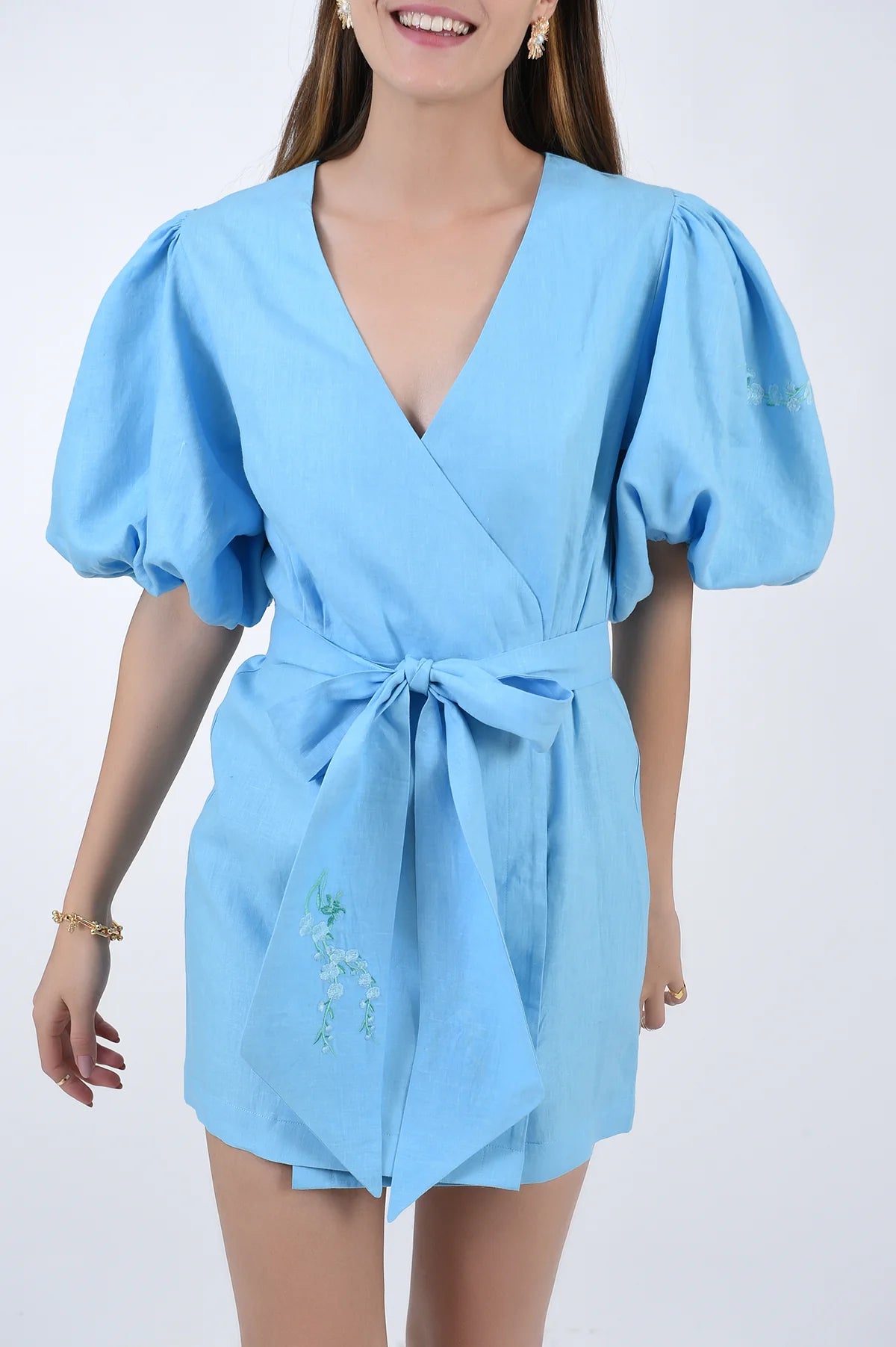 Lightweight, breathable cotton poplin short-sleeve wrap dress, adorned with sophisticated floral embroidery and a delicately tied sash bow to flatteringly cinch the waist.