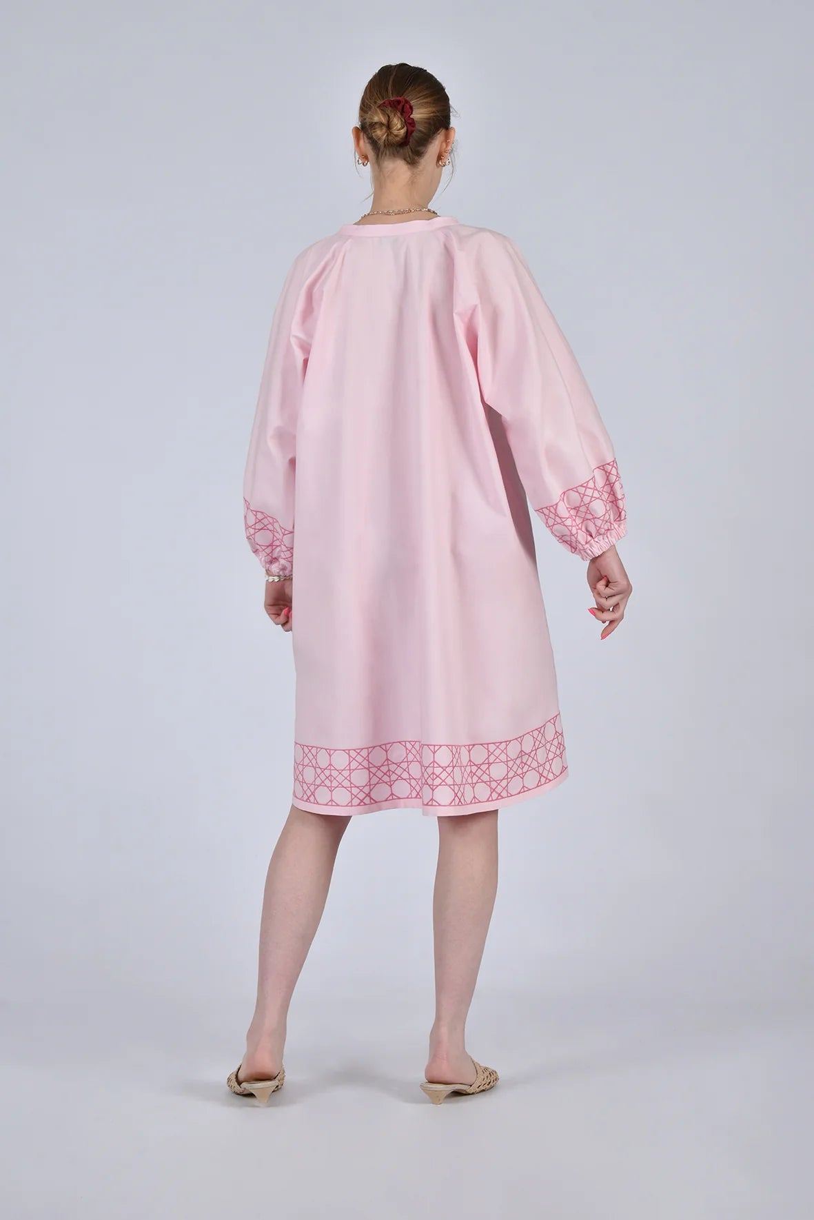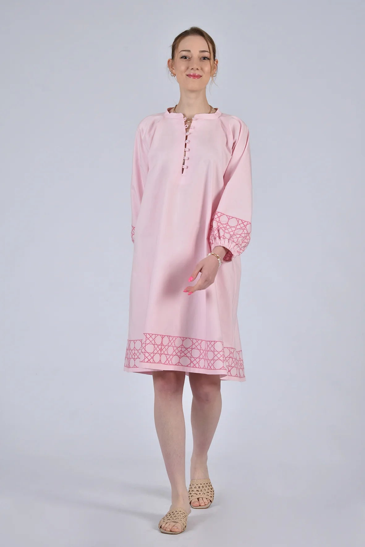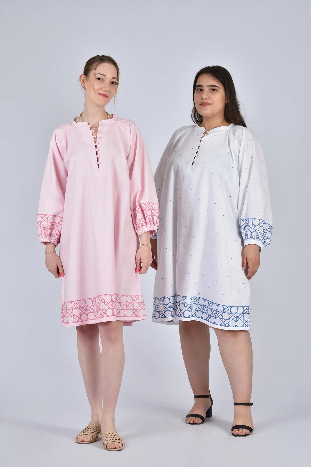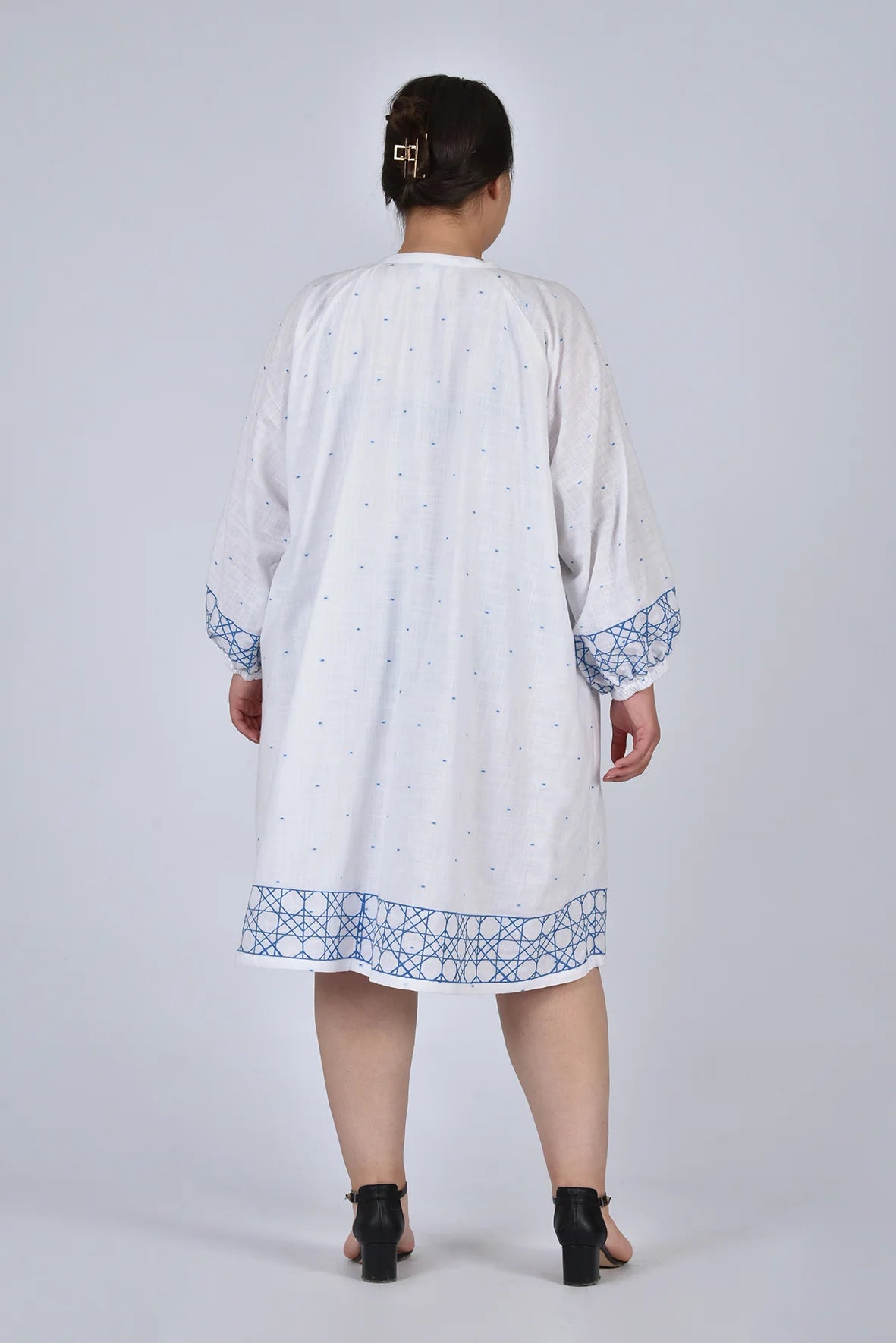 Created in collaboration with Sabrina Chazen & Grace Hamlin, this 100% cotton mini dress features a swingy A-line silhouette and rattan-inspired embroidery. An easy, breezy piece perfect for warm days and sun-soaked getaways.