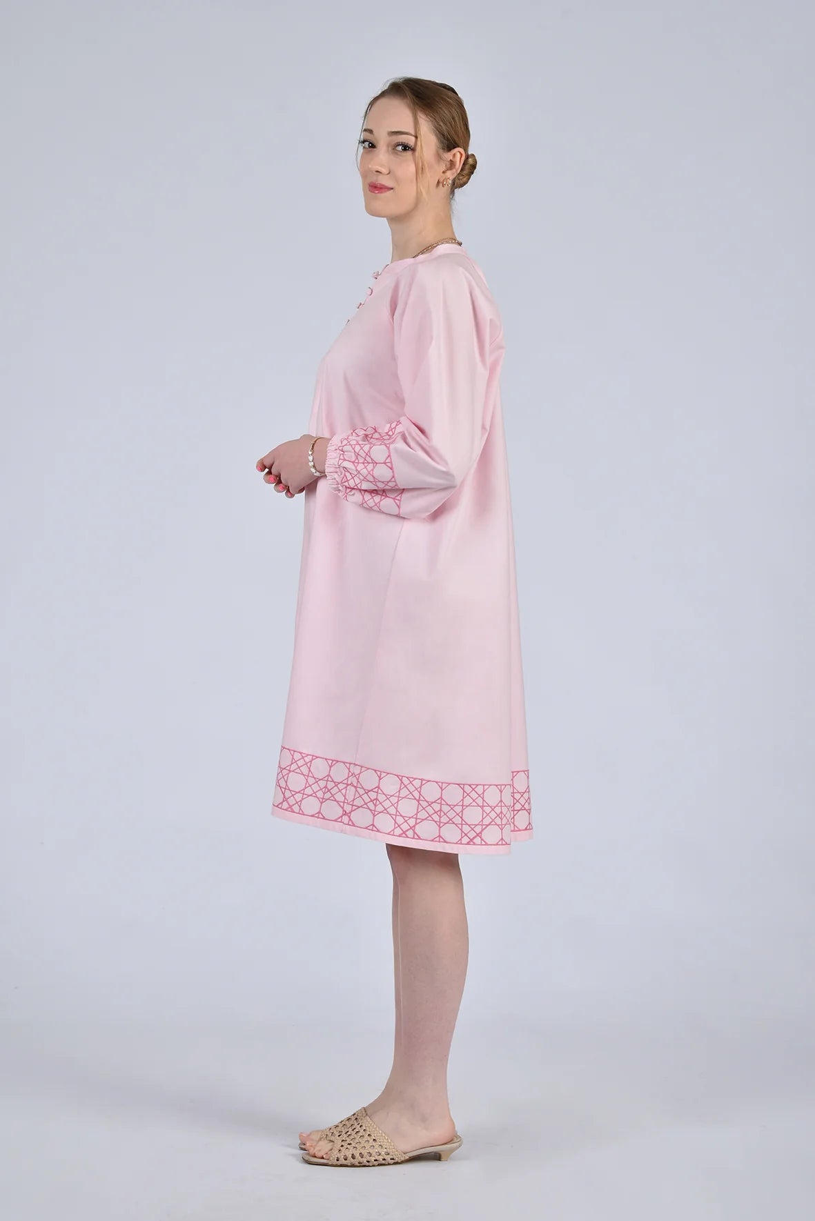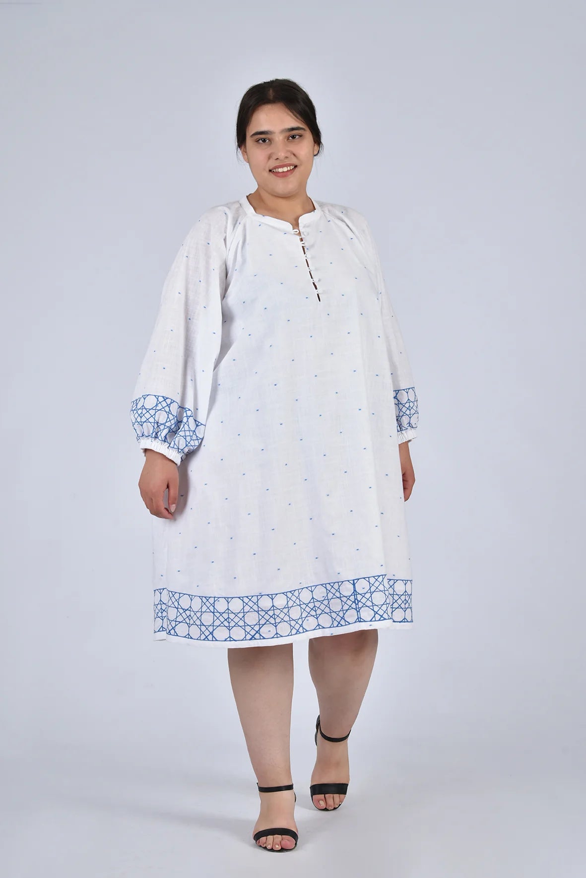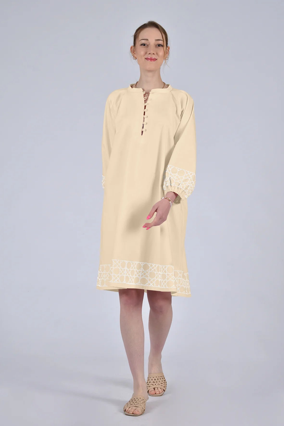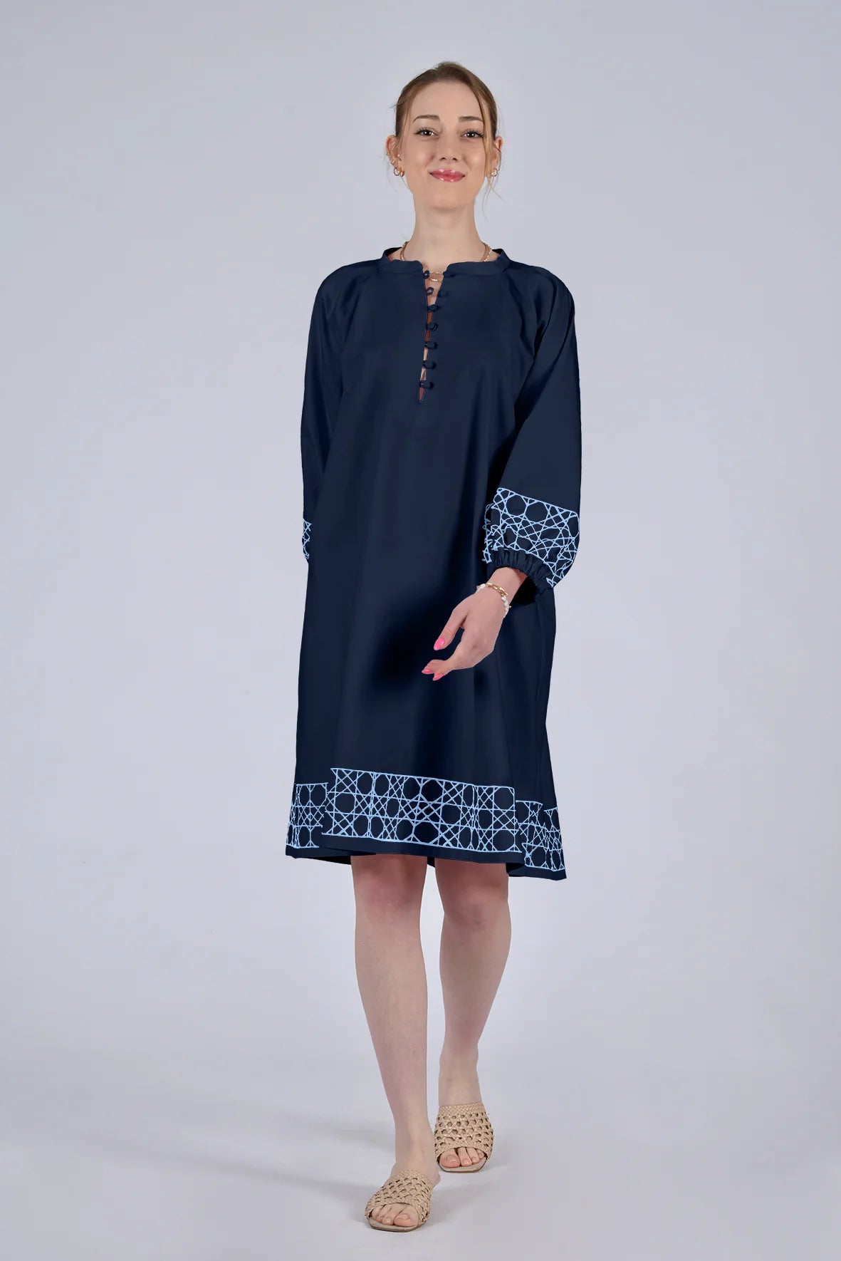 Created in collaboration with Sabrina Chazen & Grace Hamlin, this 100% cotton mini dress features a swingy A-line silhouette and rattan-inspired embroidery. An easy, breezy piece perfect for warm days and sun-soaked getaways.