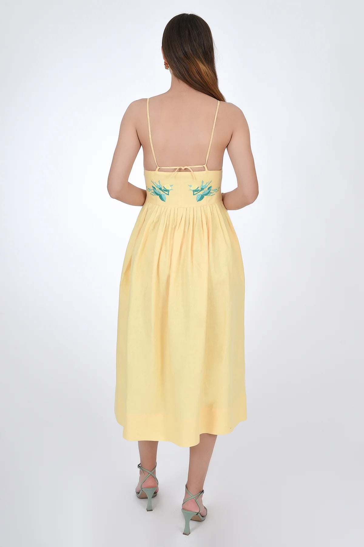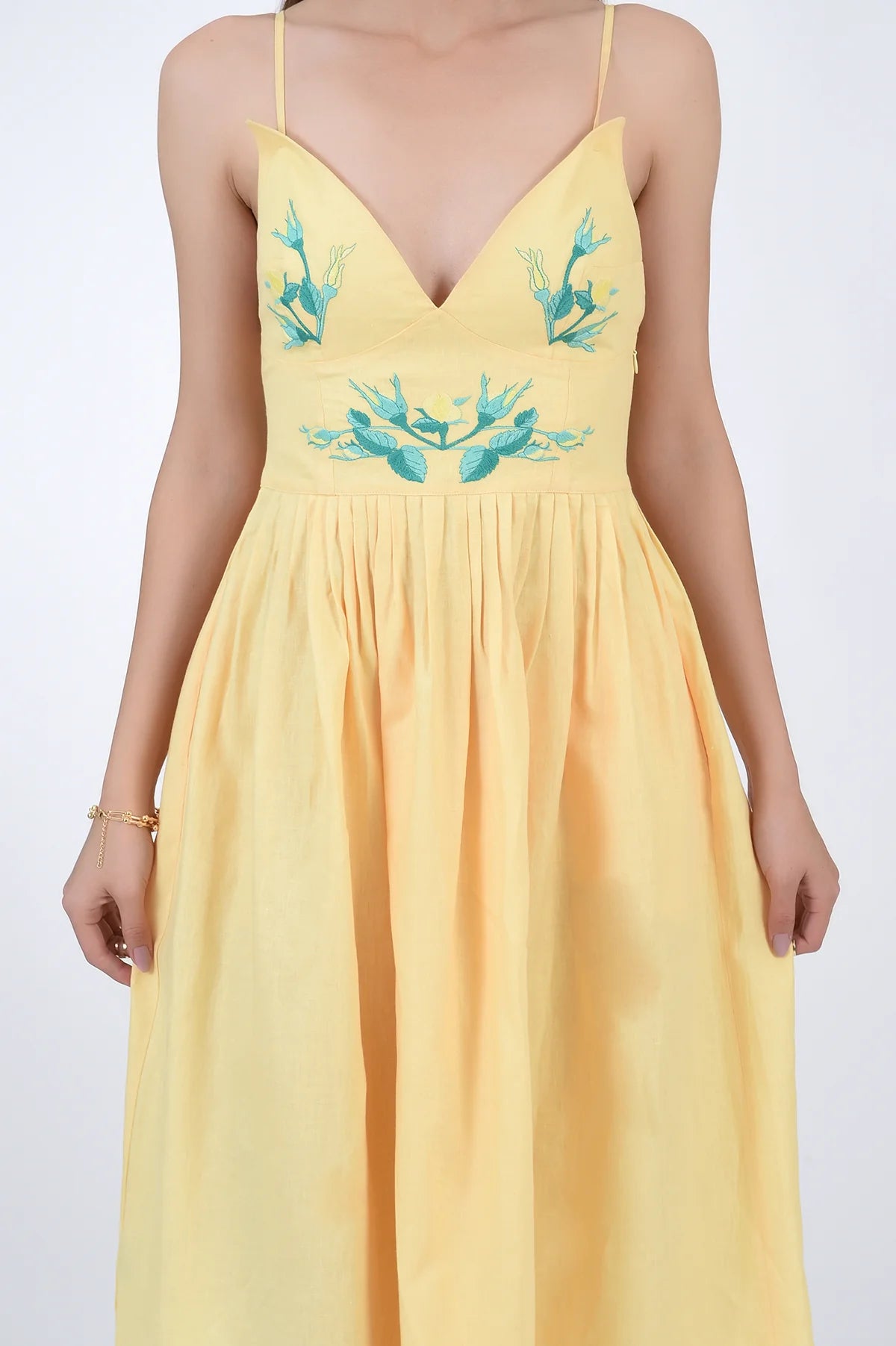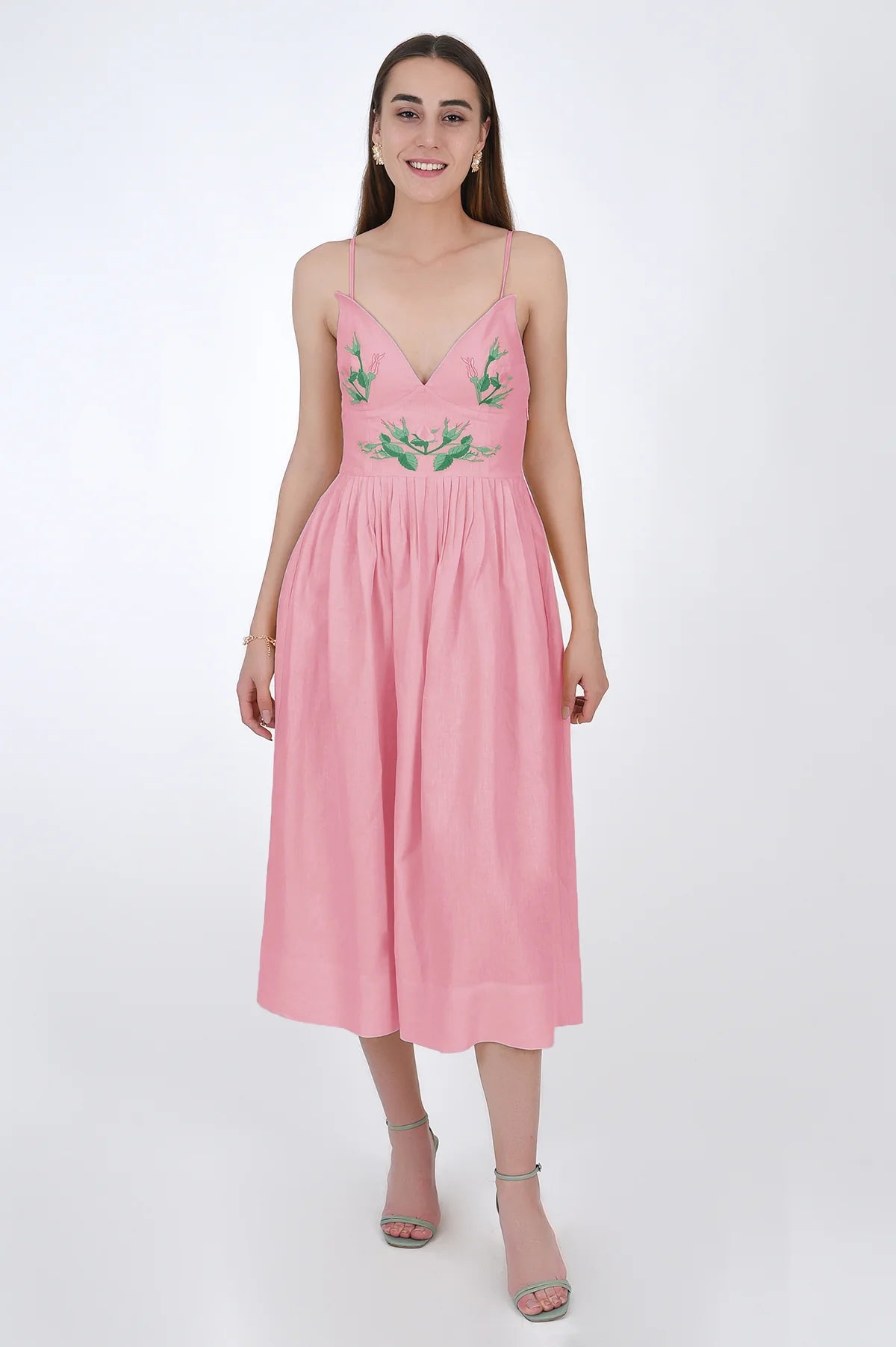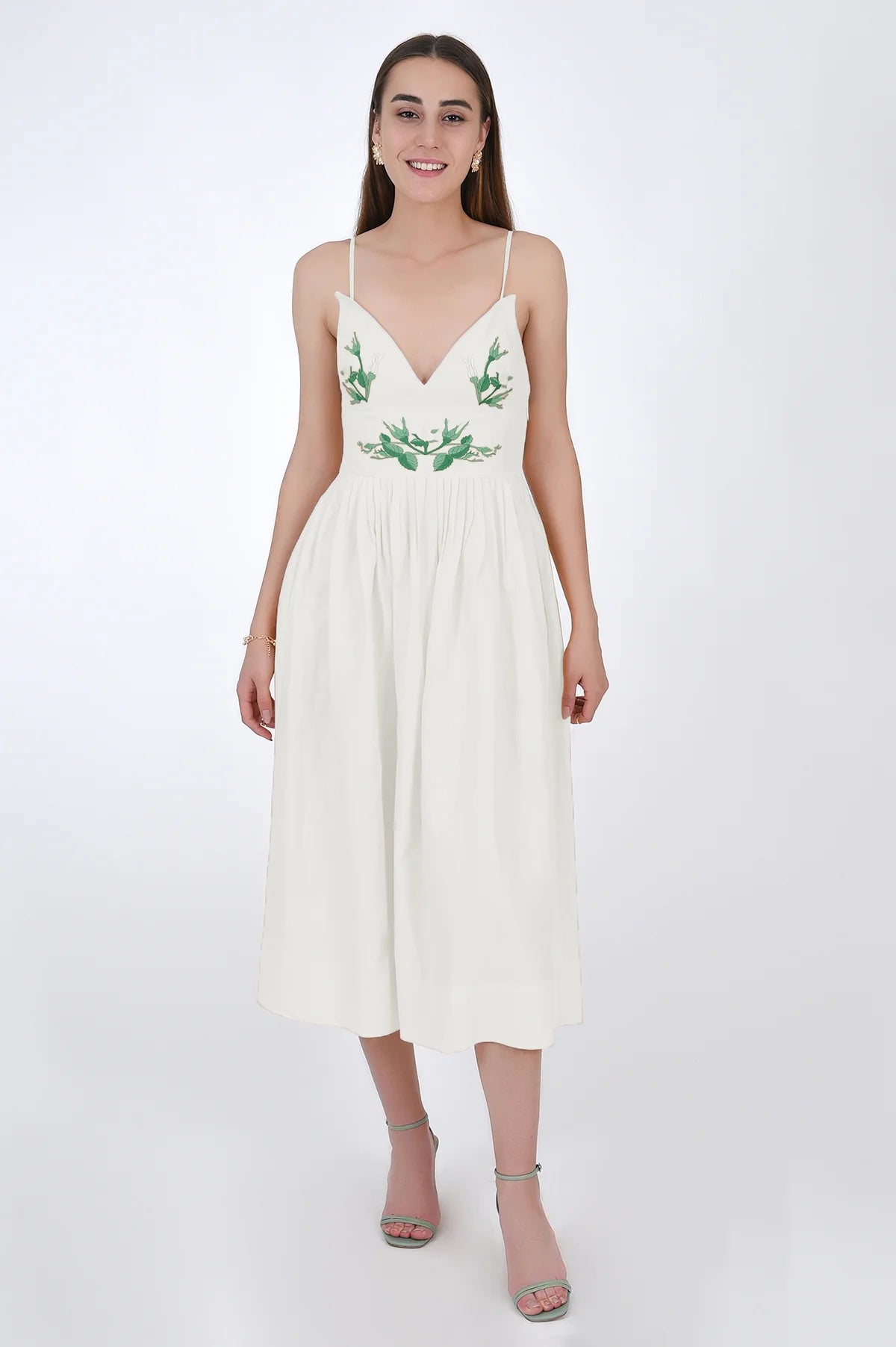 Midi-length dress with a flattering silhouette, featuring spaghetti straps, an elegant V-neckline, and a pleated A-line skirt. The front, waist, and back are adorned with beautiful floral embroidery, giving it a sophisticated finish.