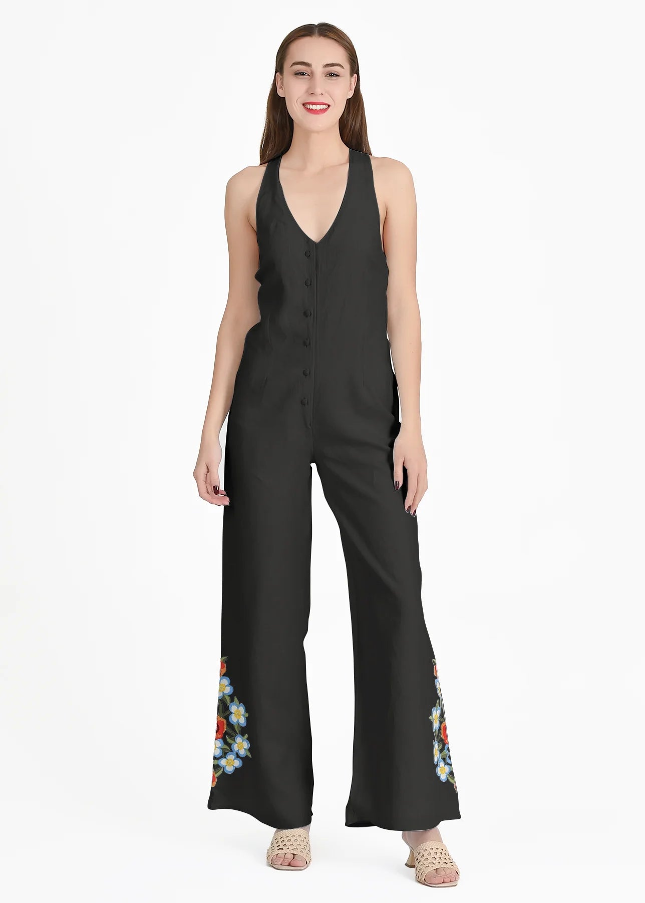 This 100% cotton jumpsuit is a summer staple that combines comfort and captivating style. The plunging V-neckline with a button front adds a touch of sophistication, while the sleeveless design with crisscross back straps keeps you cool and breezy.
