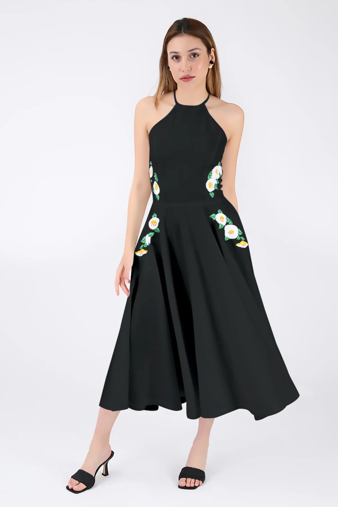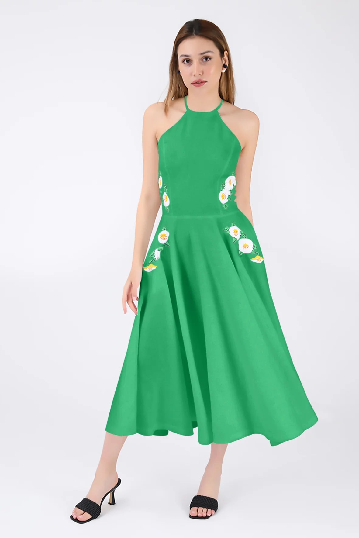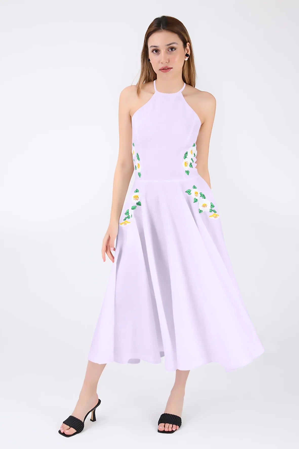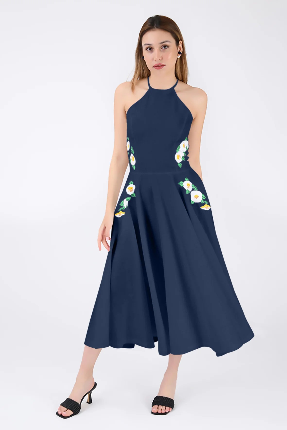 A-Line Halter Linen Dress with side pockets, back zipper closure, tie back at the neck with sophisticated floral-inspired embroidery details.