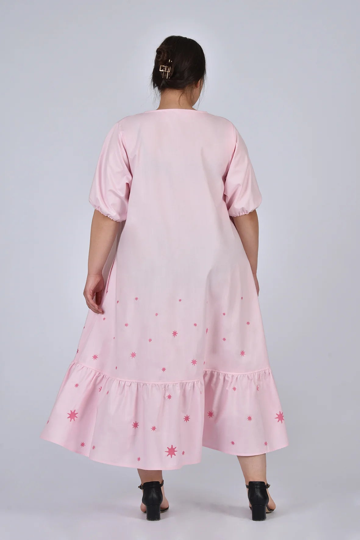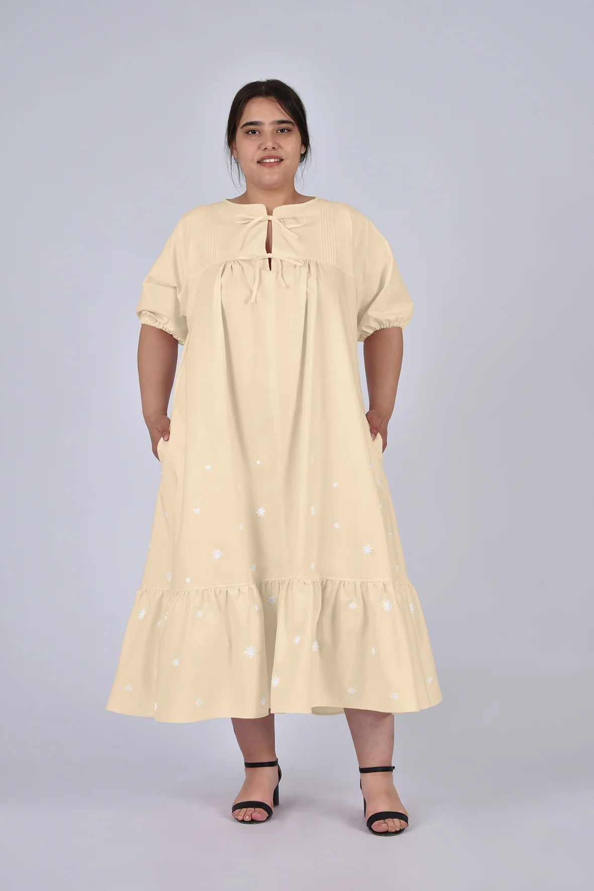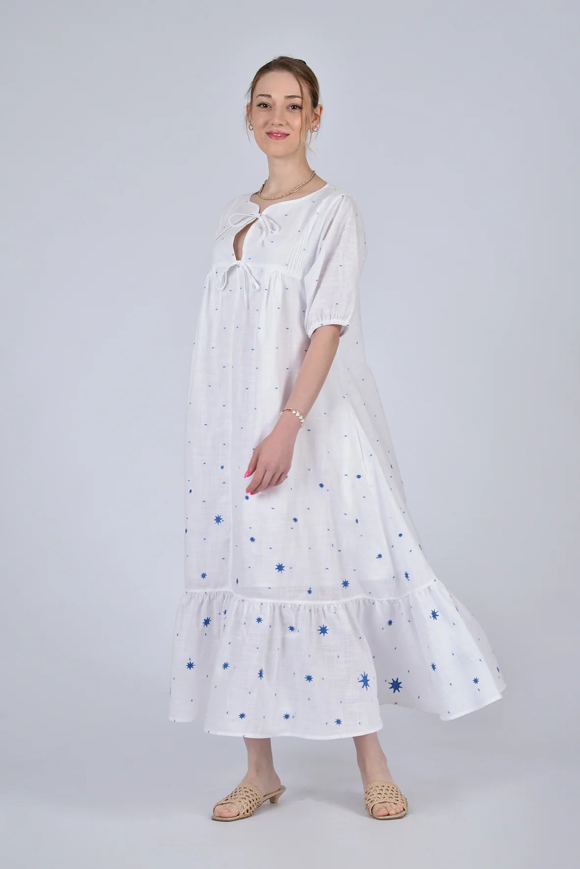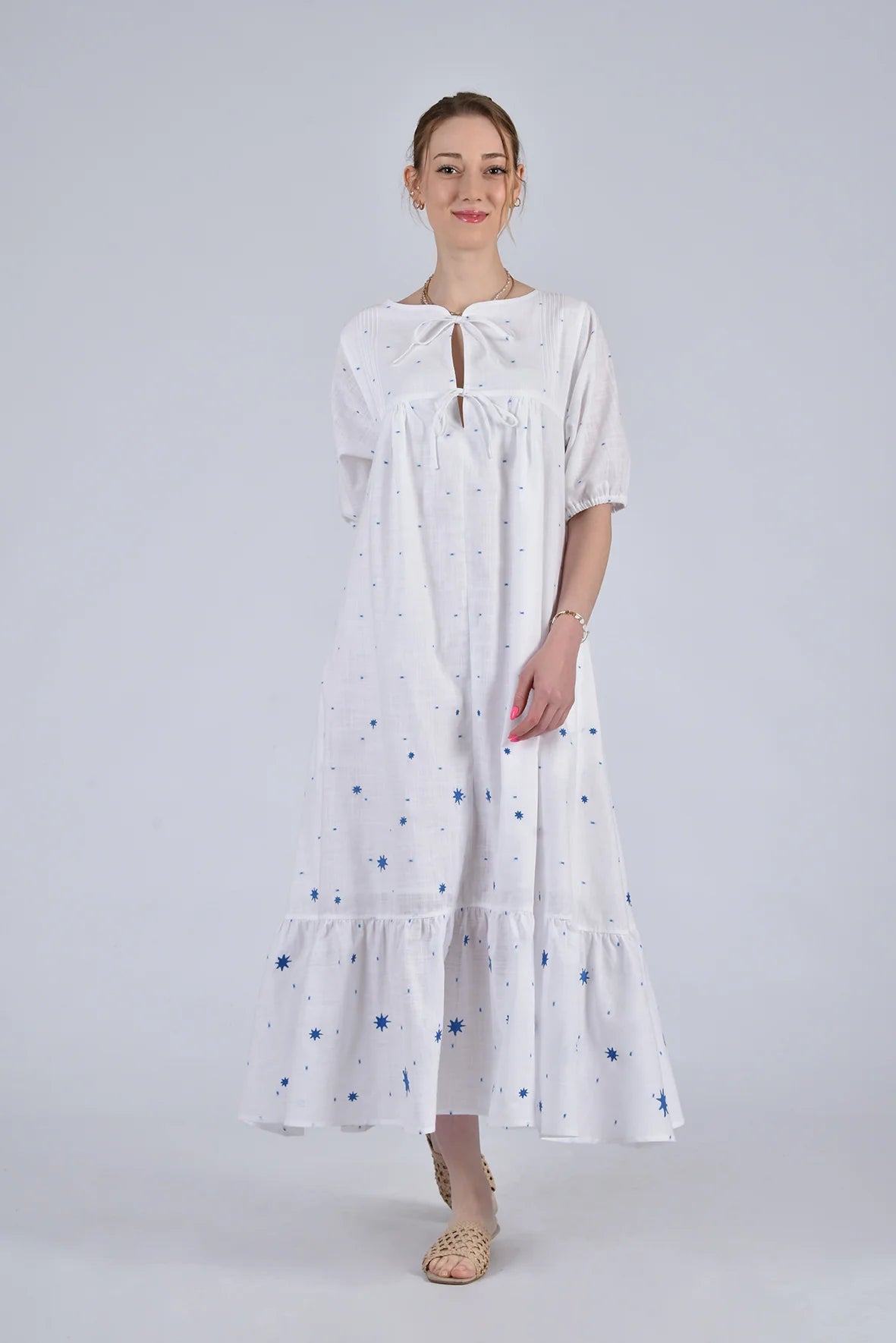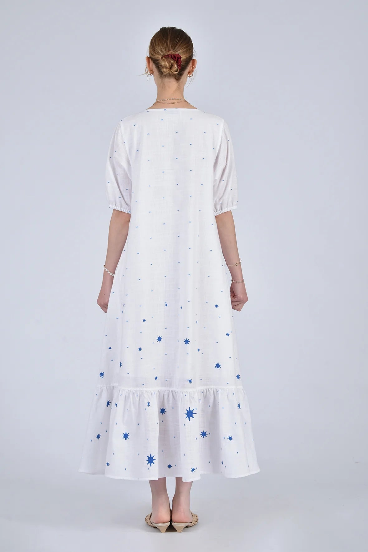Created in collaboration with Sabrina Chazen & Grace Hamlin, this dress features a full skirt, scalloped hem, and celestial embroidery—bringing a dreamy, starlit vibe to warm days and easy evenings.
