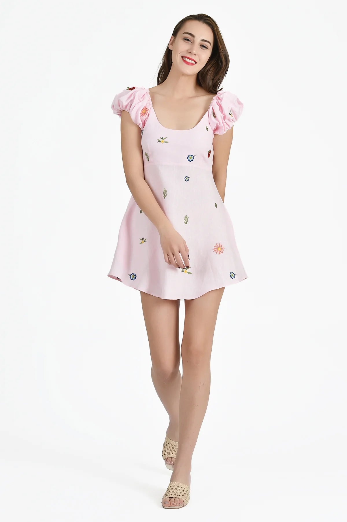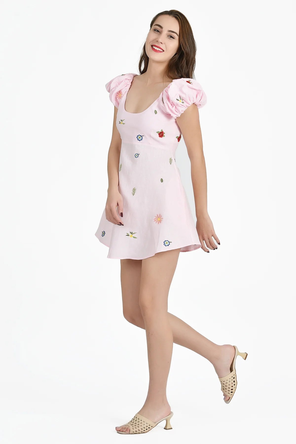 This delightful dress features a flattering scoop neckline and playful puff sleeves, adding a touch of whimsy to your look. The all-over floral embroidery brings a vibrant burst of color.