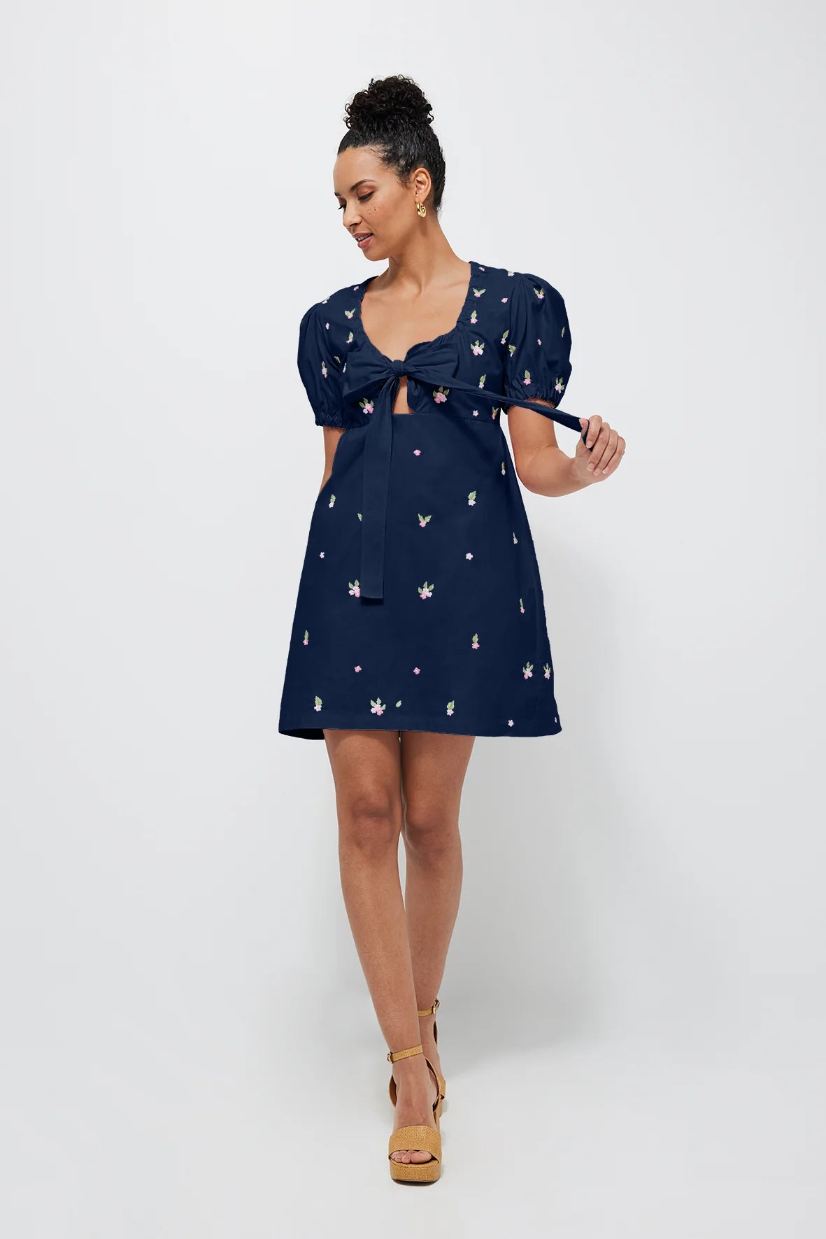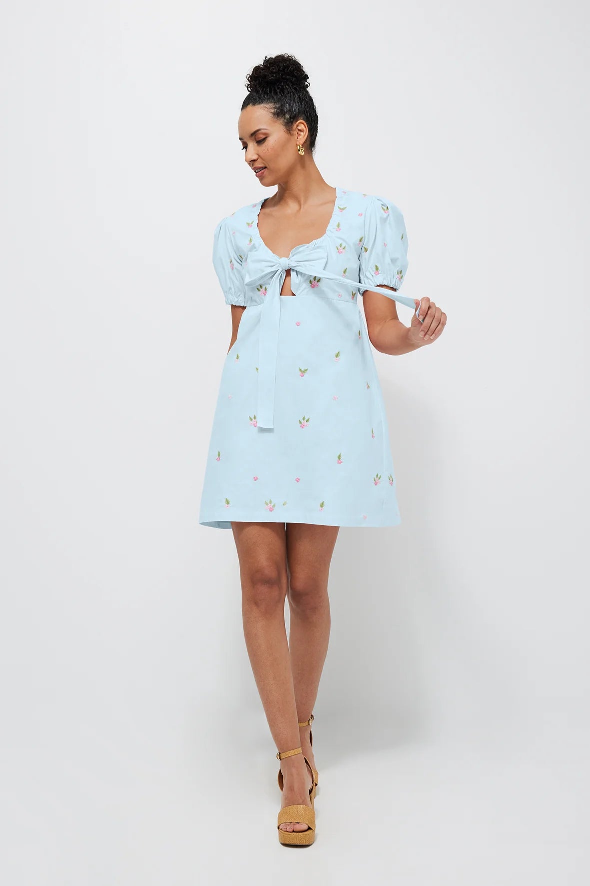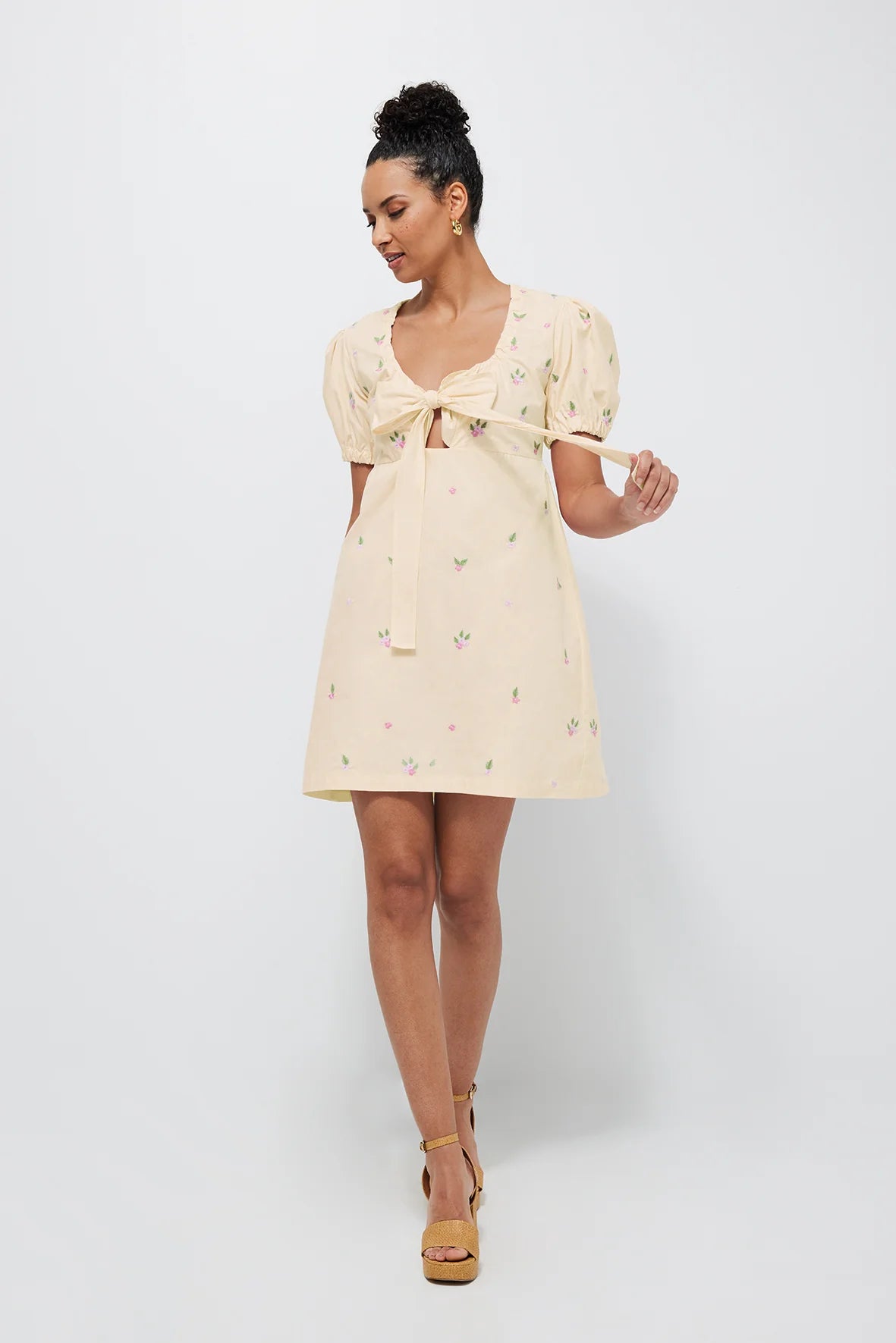 This charming mini dress blends vintage-inspired details with delicate floral embroidery, creating an effortlessly feminine look. The babydoll silhouette and tie-front bow add a touch of whimsy, making it an easy yet refined choice for warm days and special moments.