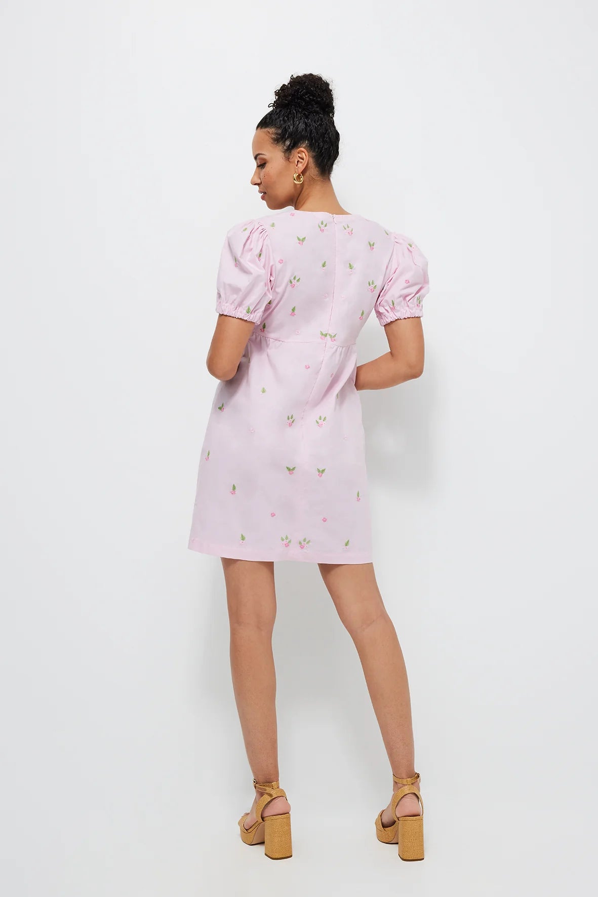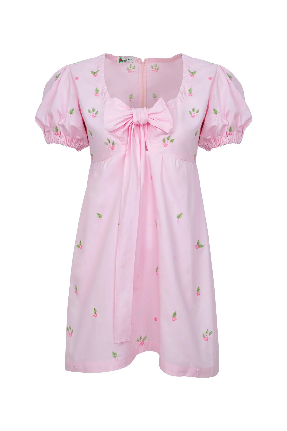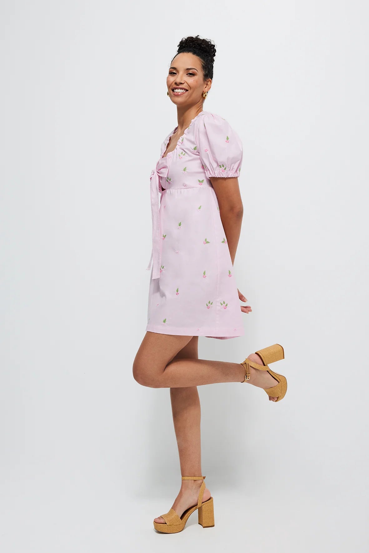 This charming mini dress blends vintage-inspired details with delicate floral embroidery, creating an effortlessly feminine look. The babydoll silhouette and tie-front bow add a touch of whimsy, making it an easy yet refined choice for warm days and special moments.