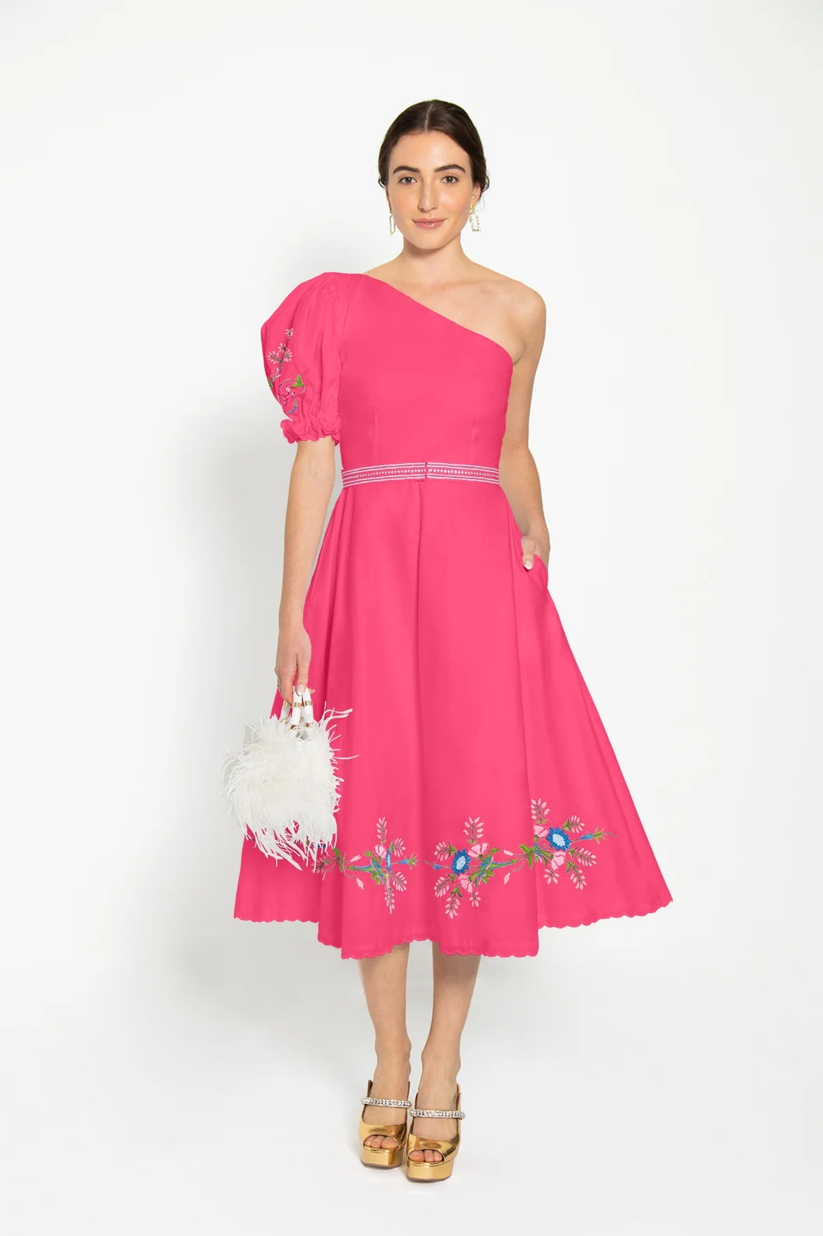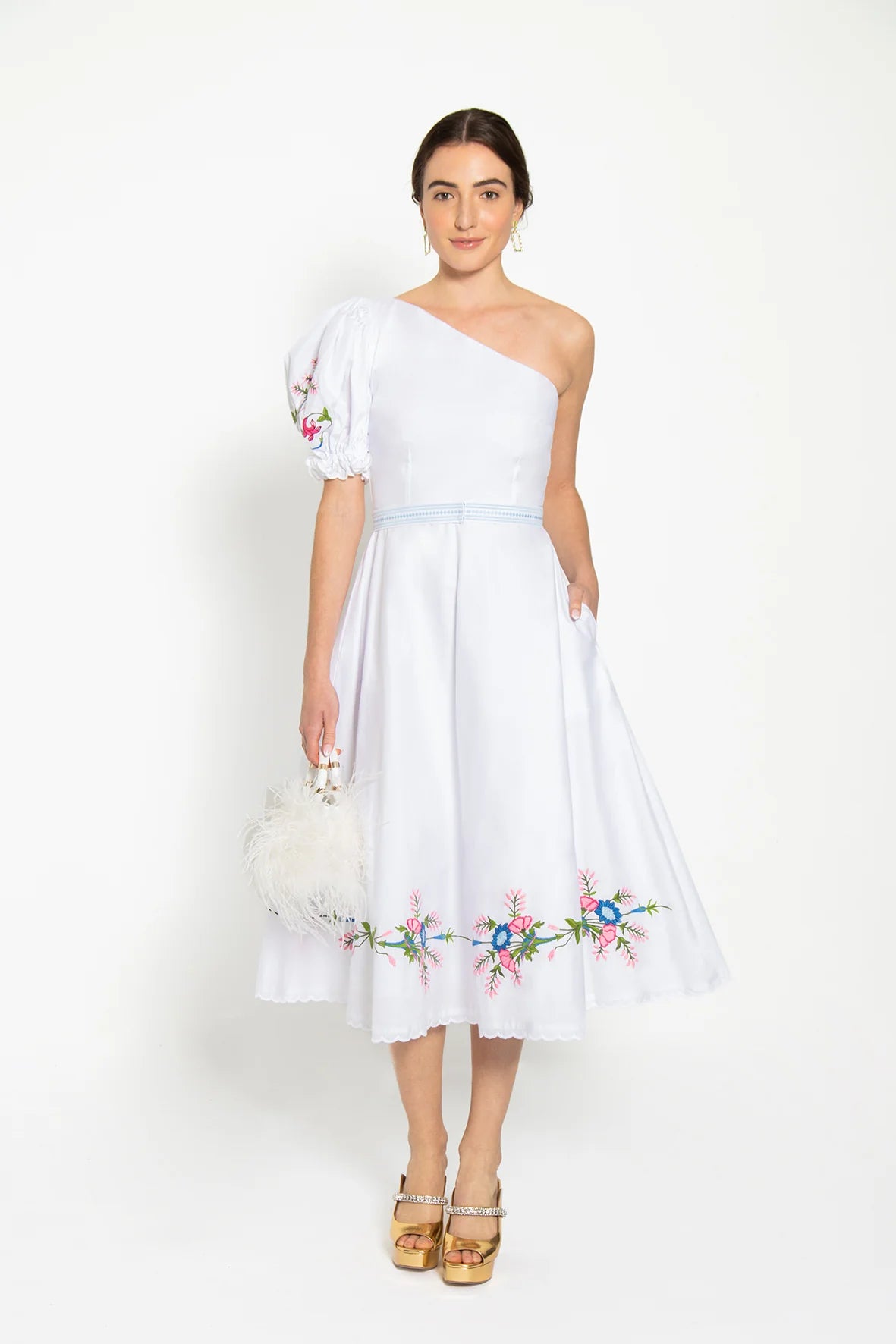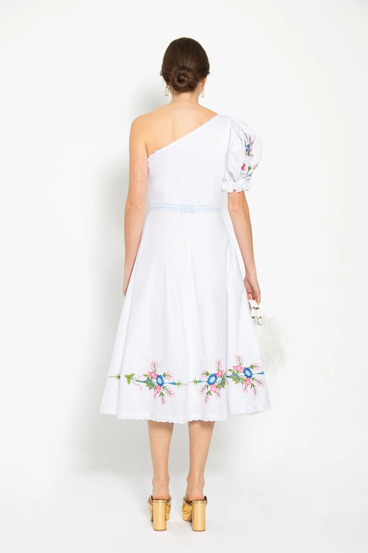 This enchanting midi dress features a sophisticated one-shoulder silhouette and a gracefully flared skirt. The hemline is adorned with intricate floral embroidery, showcasing a vibrant array of blossoming motifs in delicate hues.
