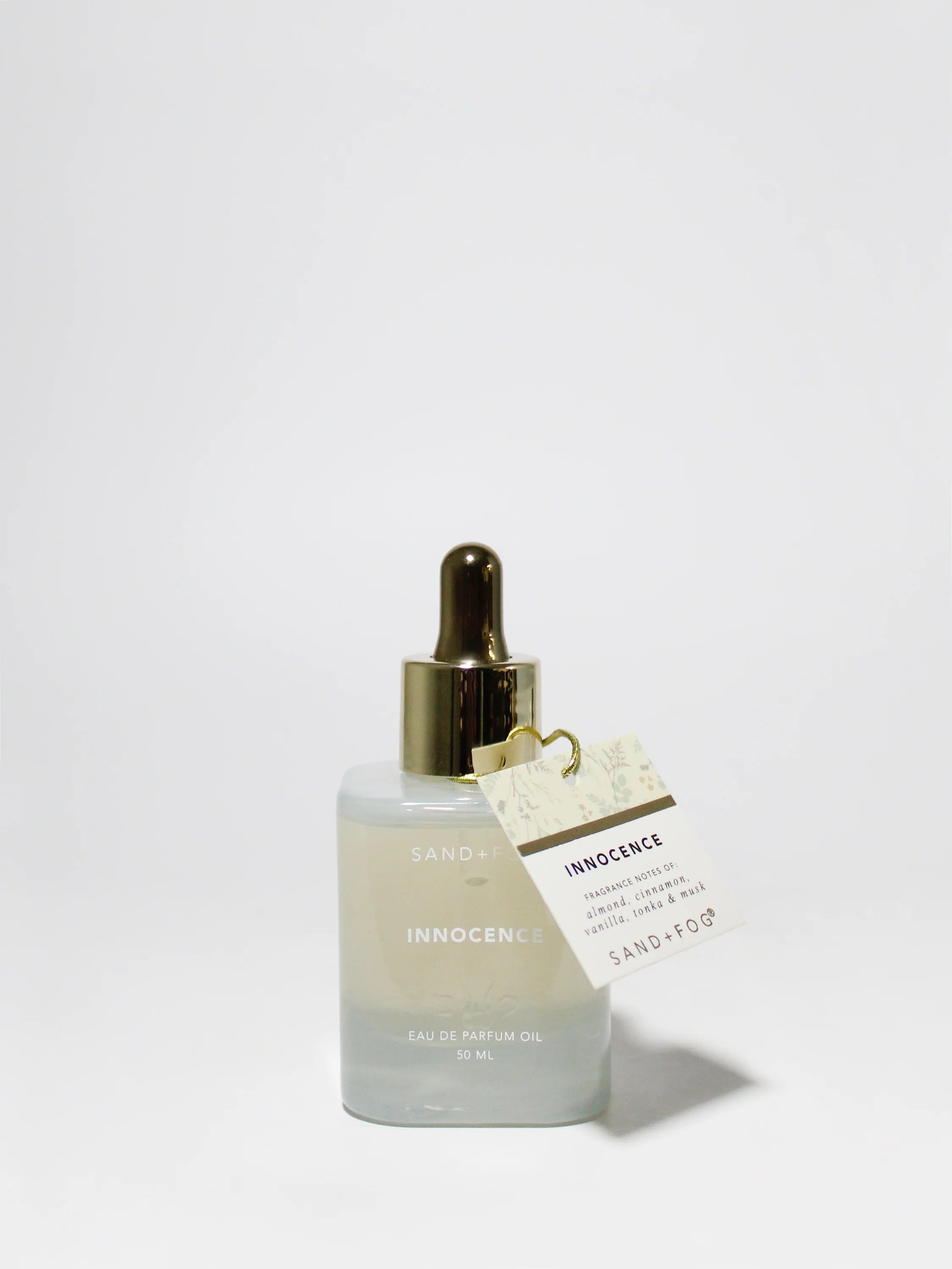 Embrace simpler times with the pure and delicate allure of Innocence, a captivating perfume oil that wraps you in a warm, sweet embrace. Soft almond and a whisper of anise create a gentle introduction, while a hint of cinnamon adds an unexpected spice. The rich, velvety base of amber, vanilla, and musk lingers beautifully on your skin, leaving behind a touch of sweetness that feels both timeless and comforting. Perfect for those who appreciate subtle elegance with a hint of indulgence. Elevate your everyday moments with this luxurious perfume oil, available exclusively from Sand + Fog.