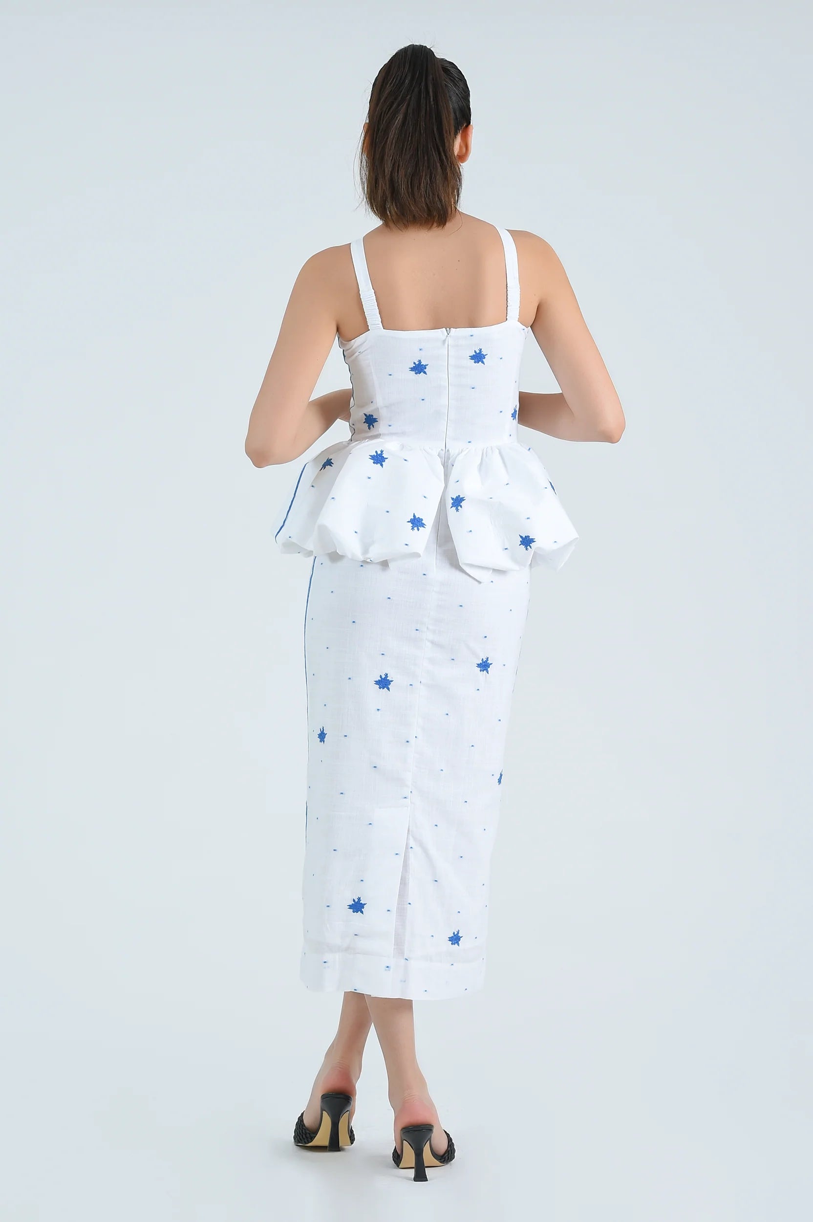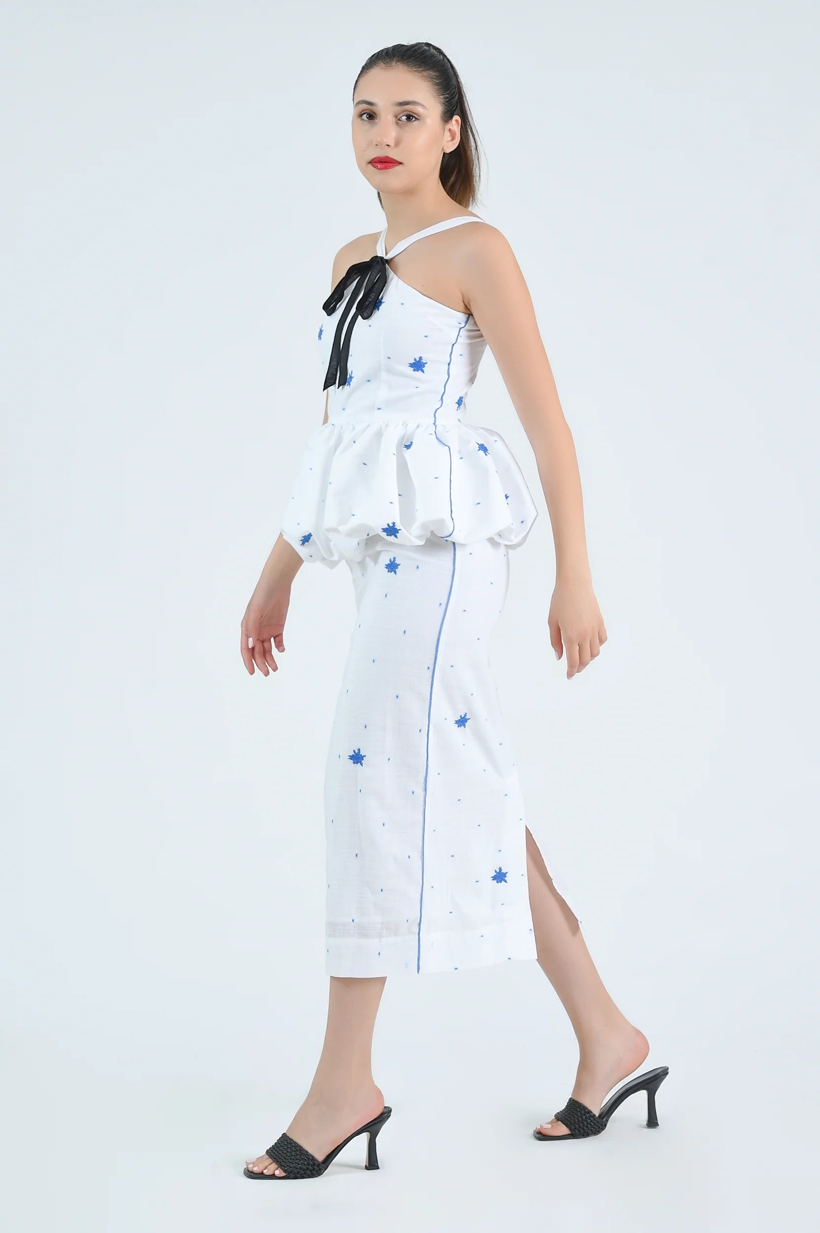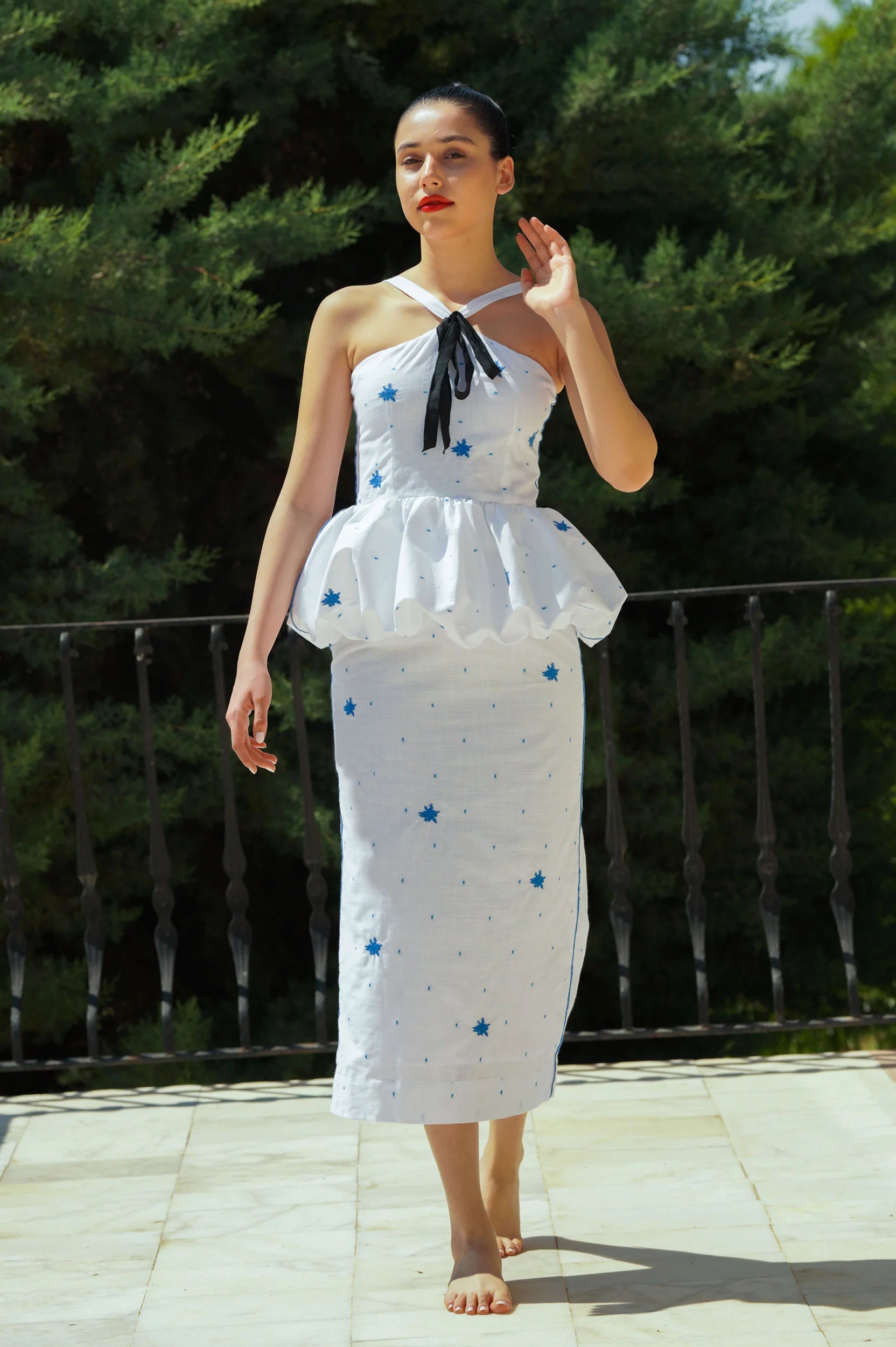Haltered Peplum Dress, featuring floral embroidery and bow details, for a touch of sophistication and glamour.
