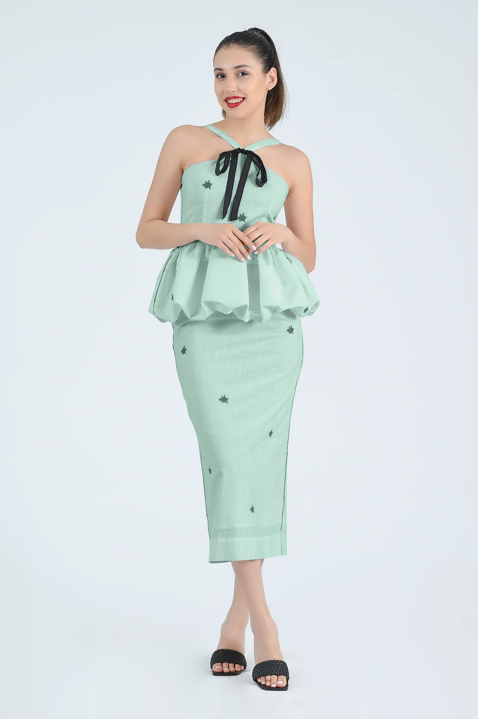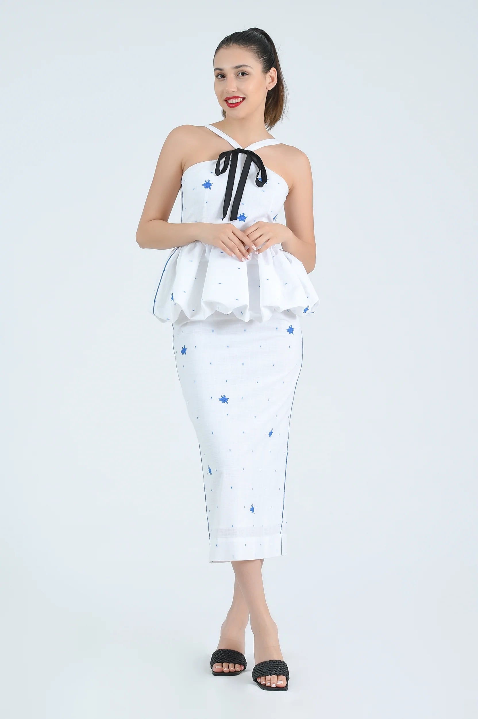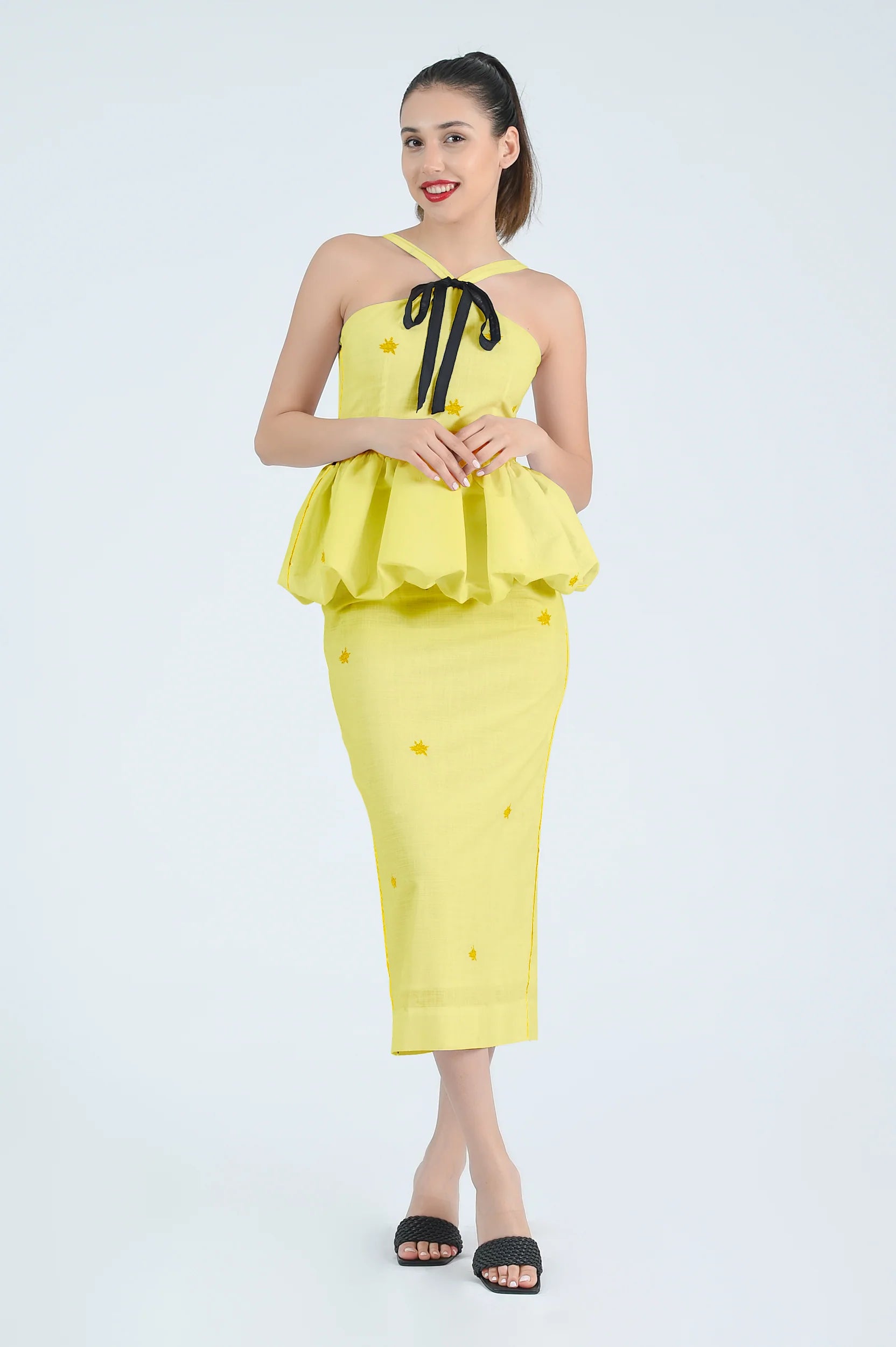 Haltered Peplum Dress, featuring floral embroidery and bow details, for a touch of sophistication and glamour.