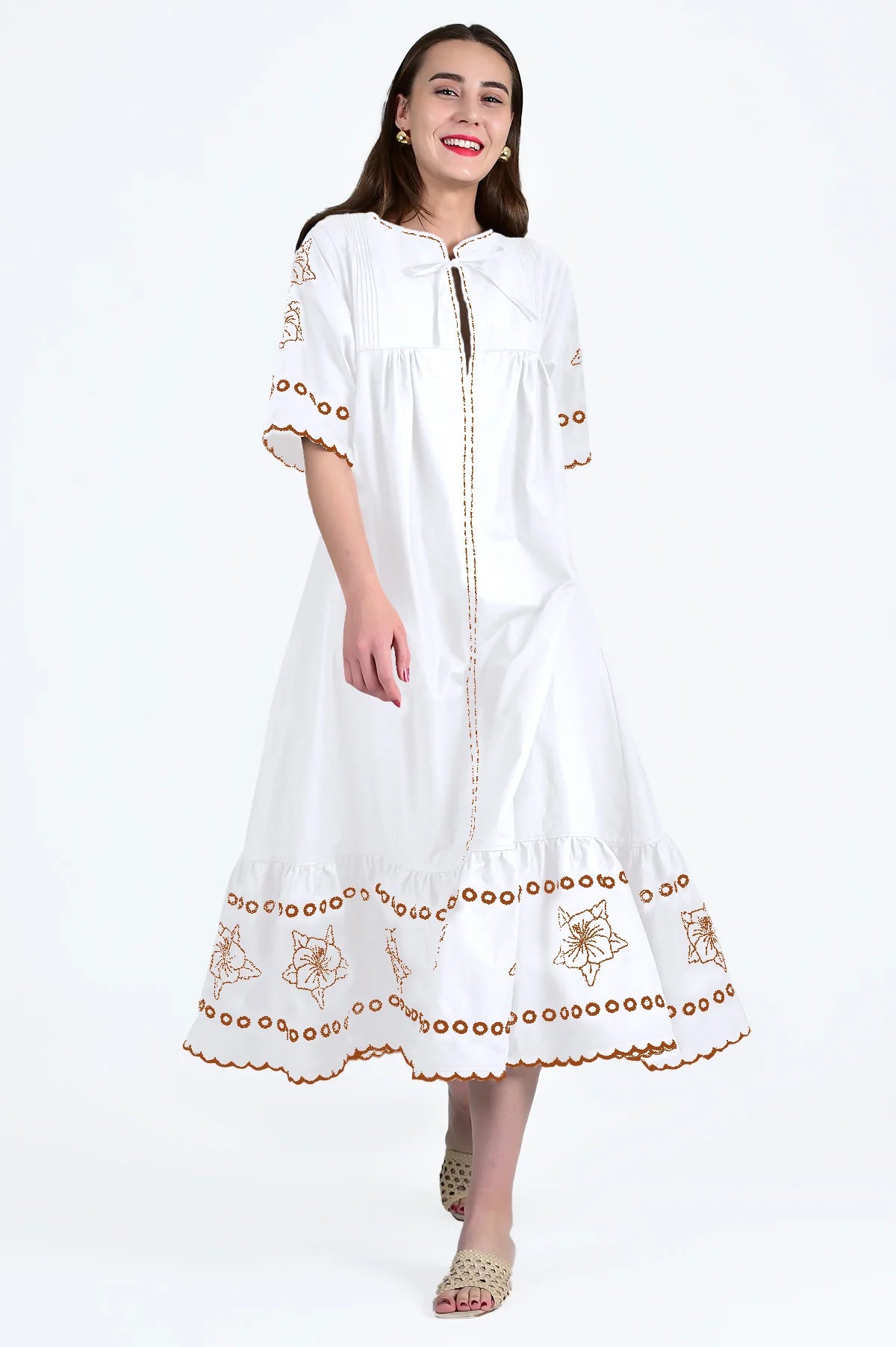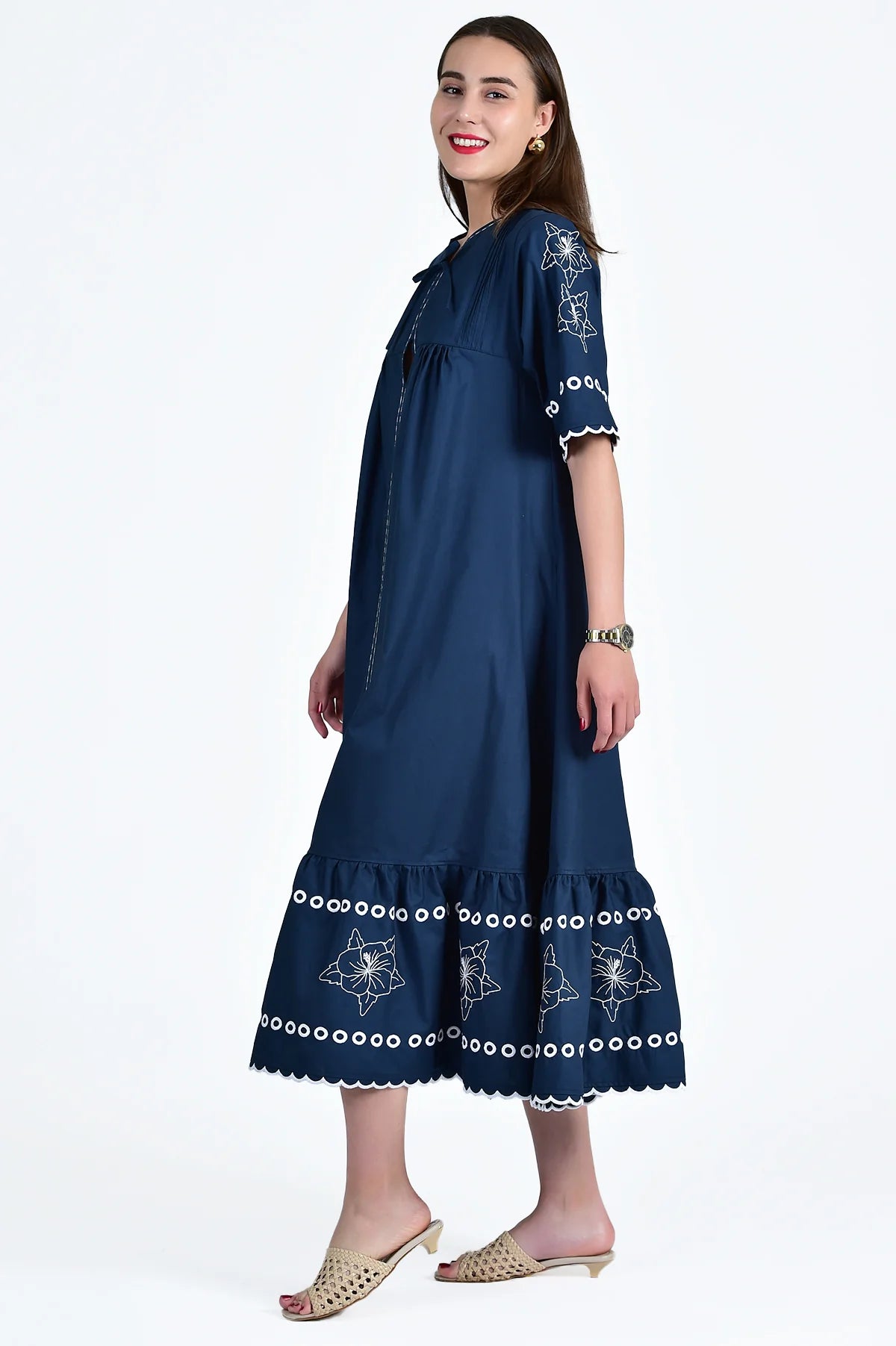 This midi dress celebrates timeless design and exquisite detailing. Delicate embroidery and eyelet accents lend a playful yet sophisticated aesthetic. Scalloped edges and a soft A-line shirt dress silhouette create a flattering fit, while the charming tie neckline adds a feminine touch.