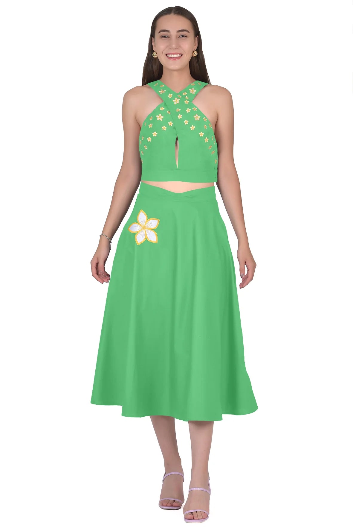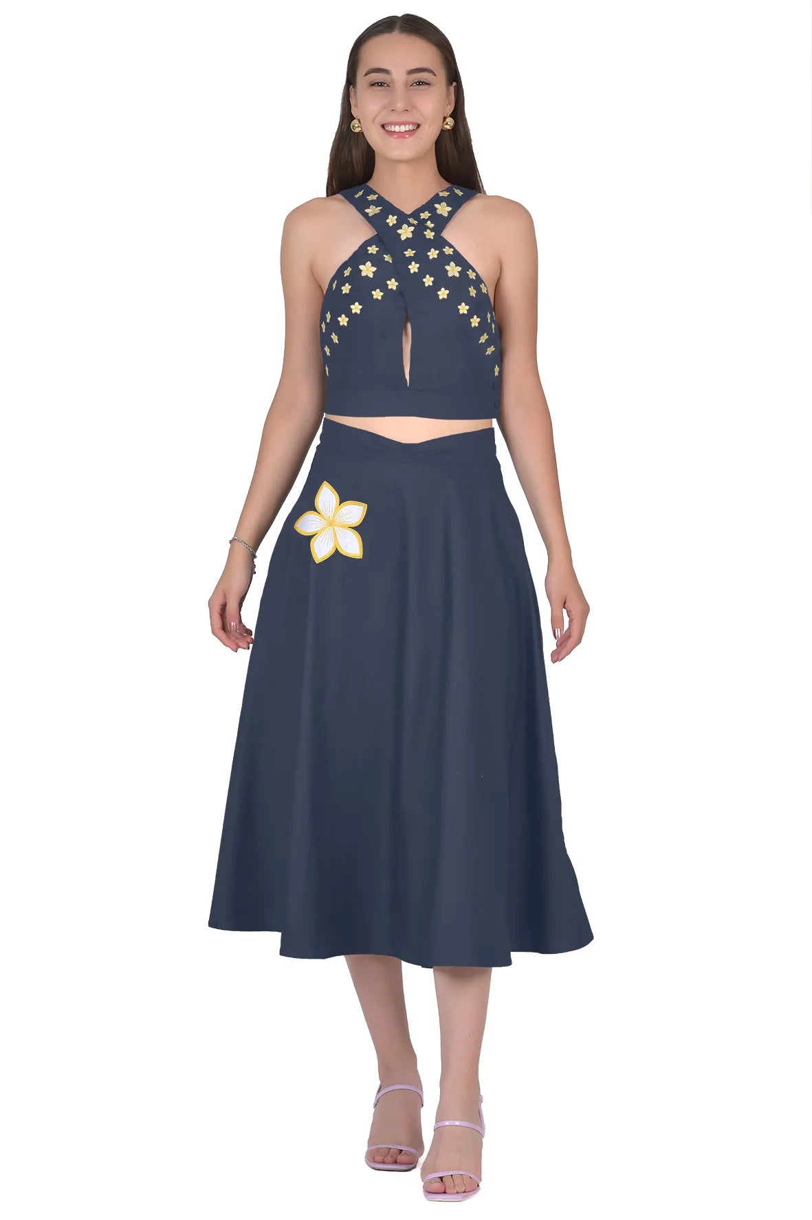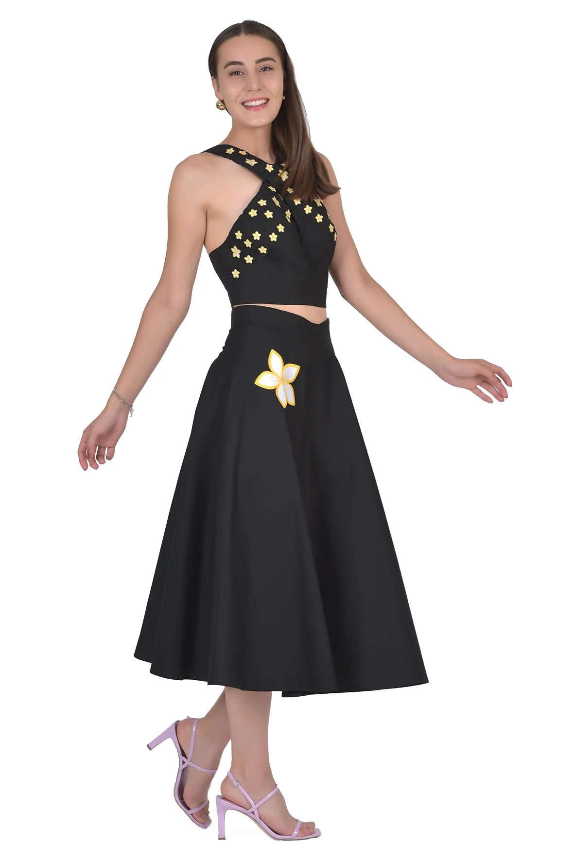Created in collaboration with Kristen Tirney, this stunning two-piece set features a wrap halter crop top with delicate white and yellow floral clover embroidery, paired with a flowy midi skirt adorned with matching embroidery and hidden side seam pockets. Perfect for both day and night.
