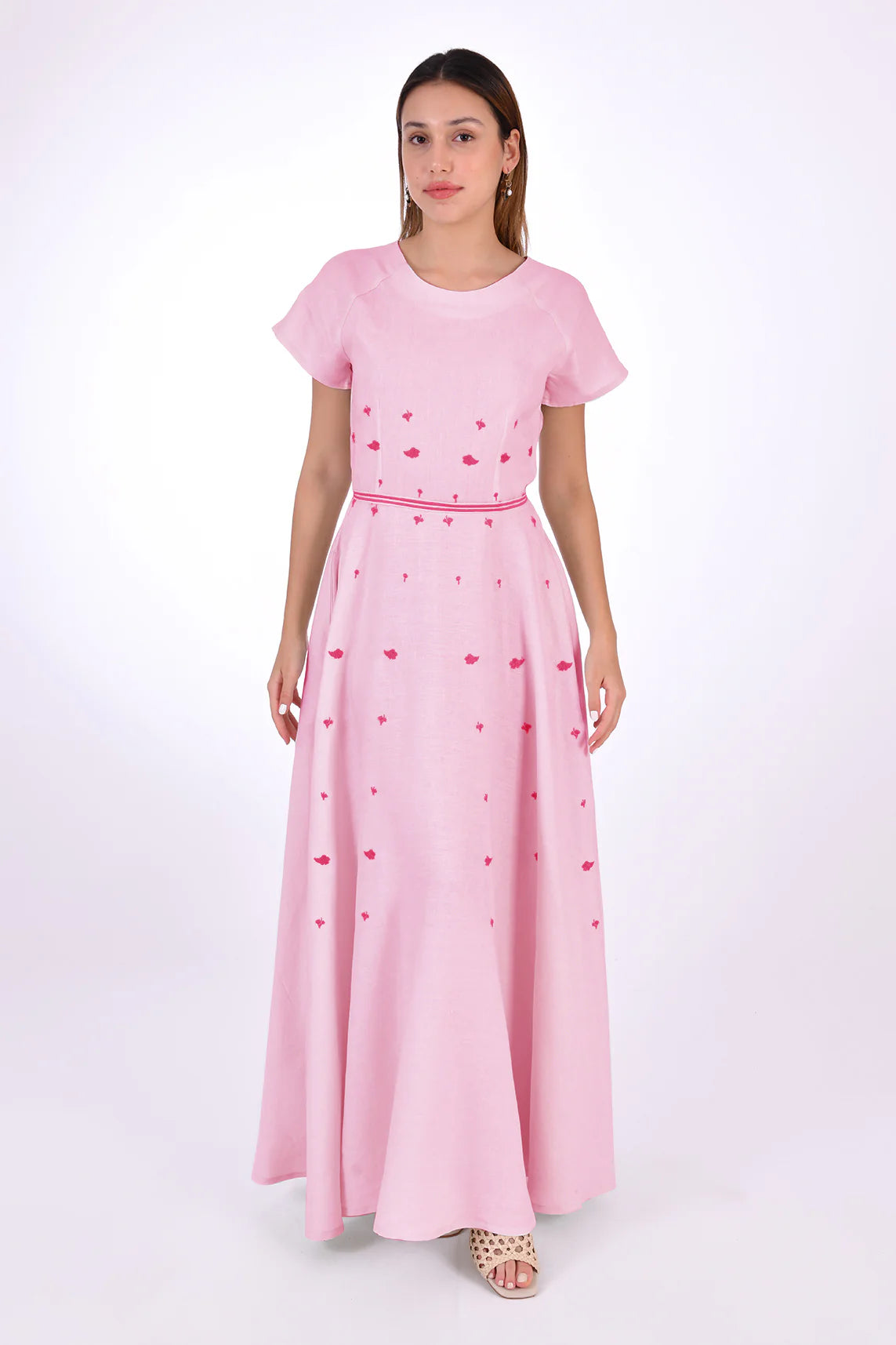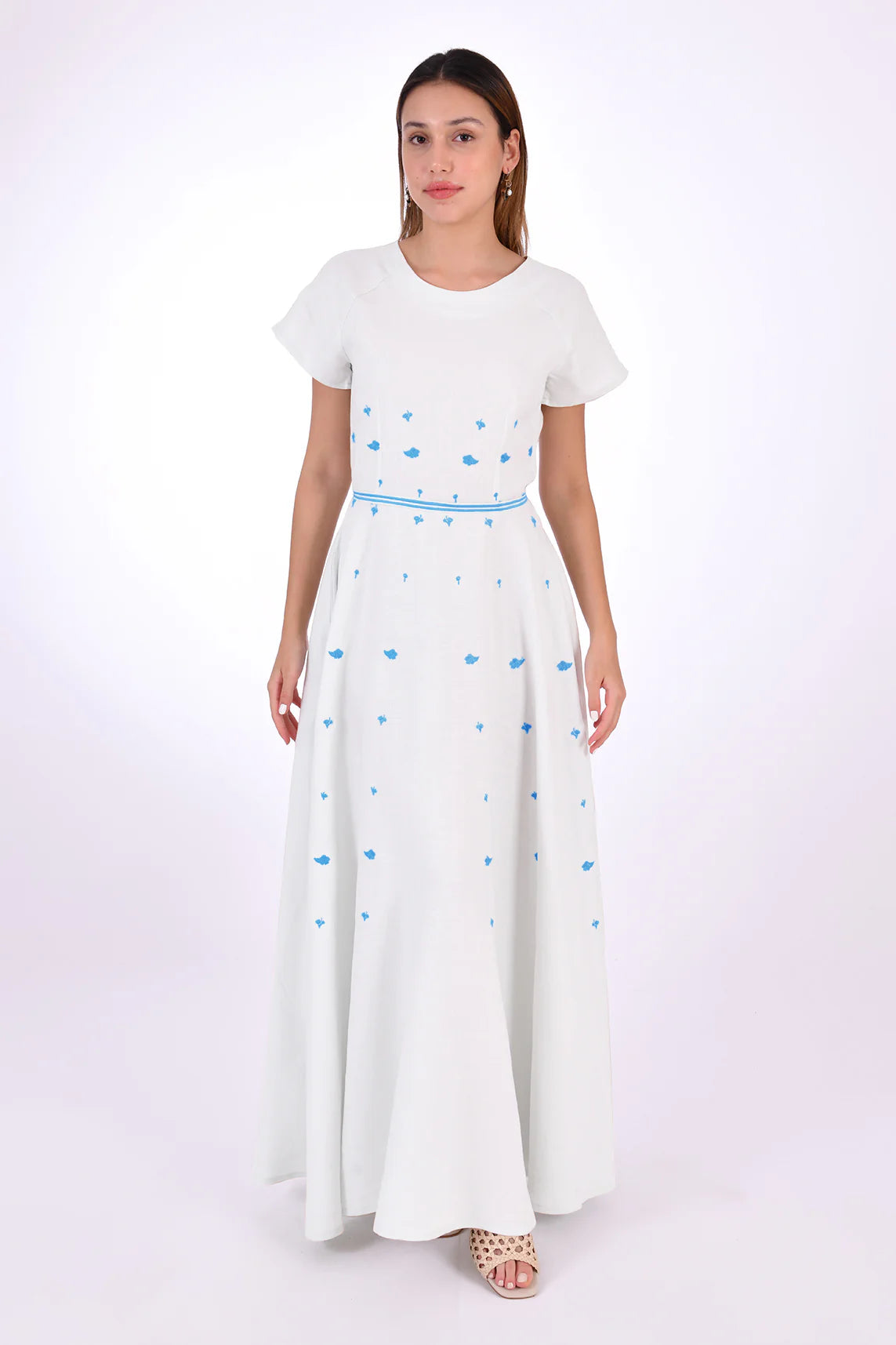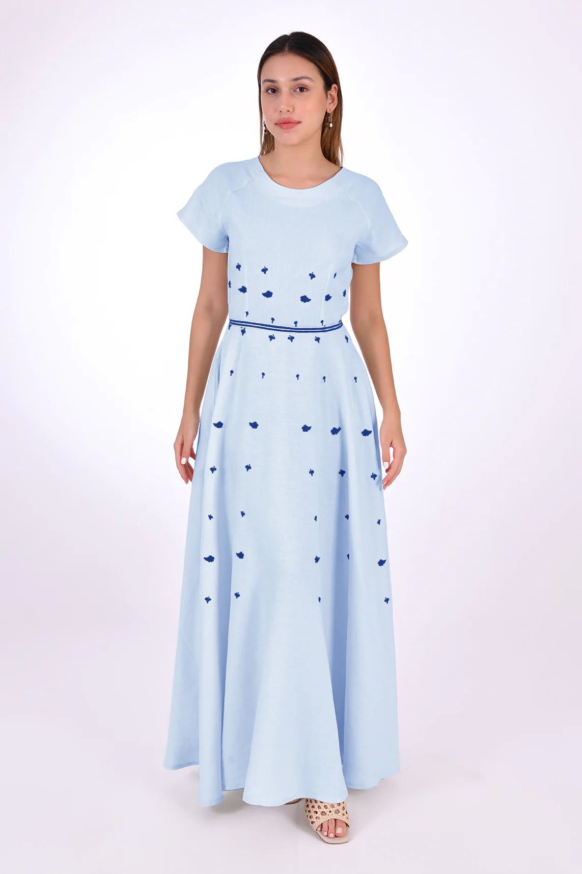 A-Line Tea Length Dress crafted with a round neck, cap sleeves, a waist-cinching belt, and intricate floral-inspired embroidery both at the front and back for an exclusive touch.