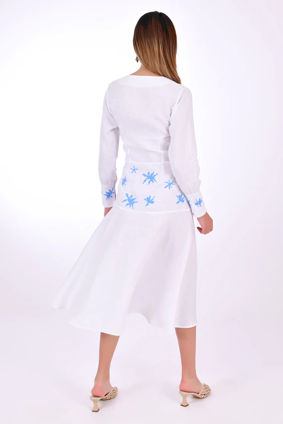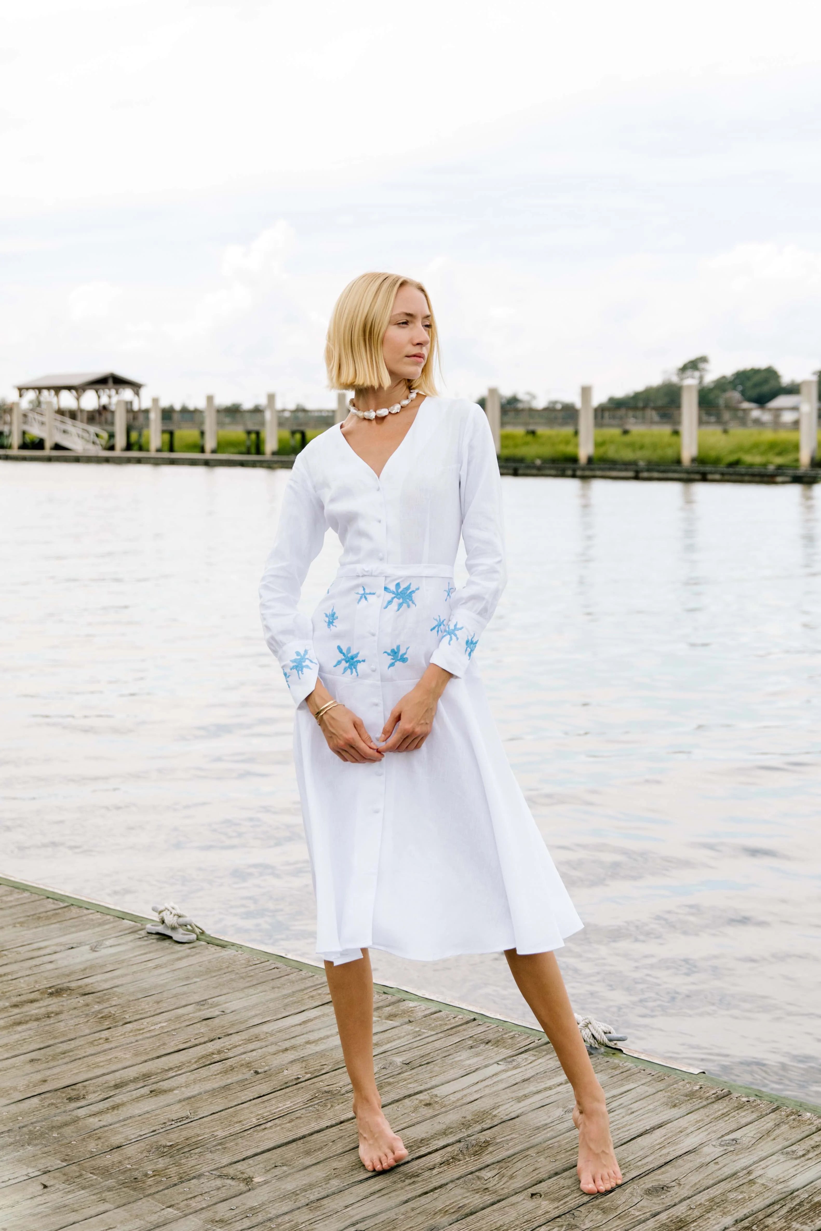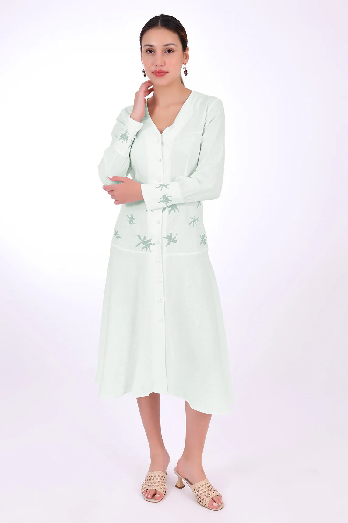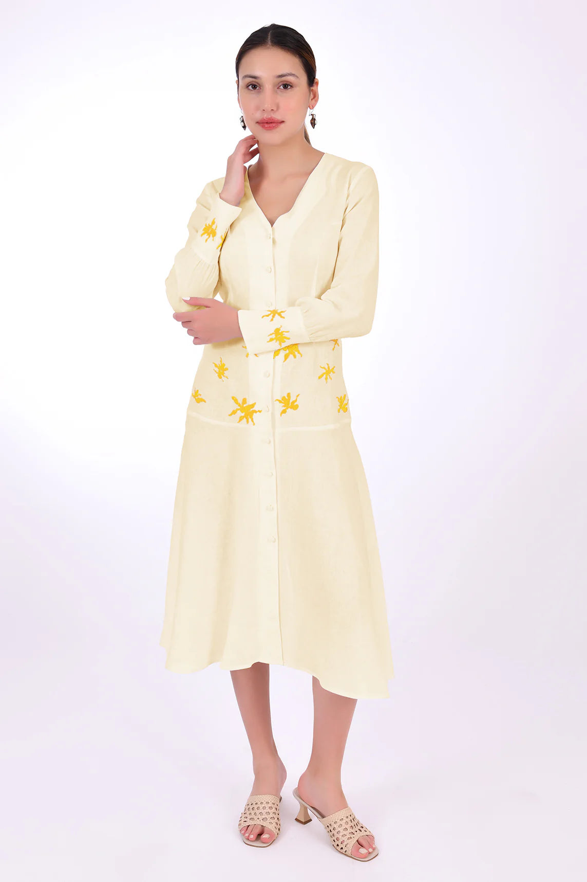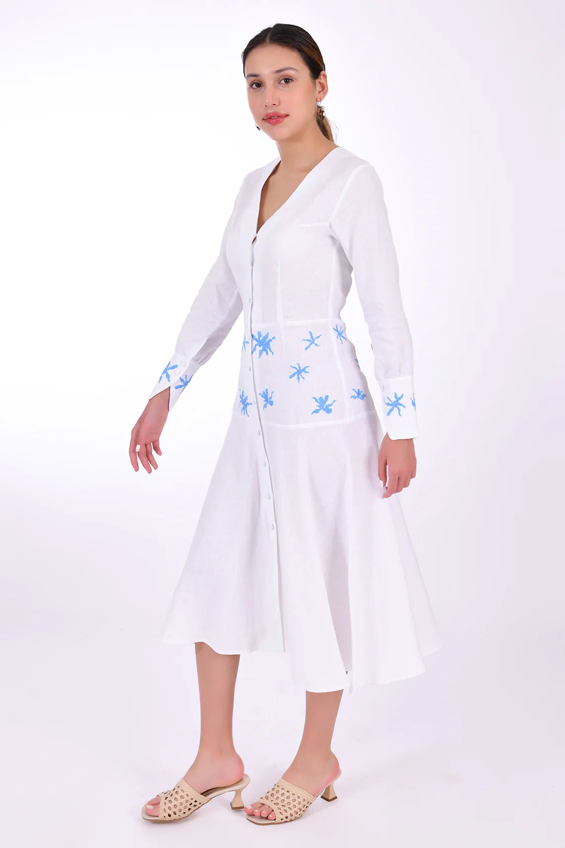 V-Neck Midi Long Sleeve Breathable Cotton Dress. Featuring a button-up front closure, cuff sleeves, drop waist, and embroidery on the waist and cuffs.