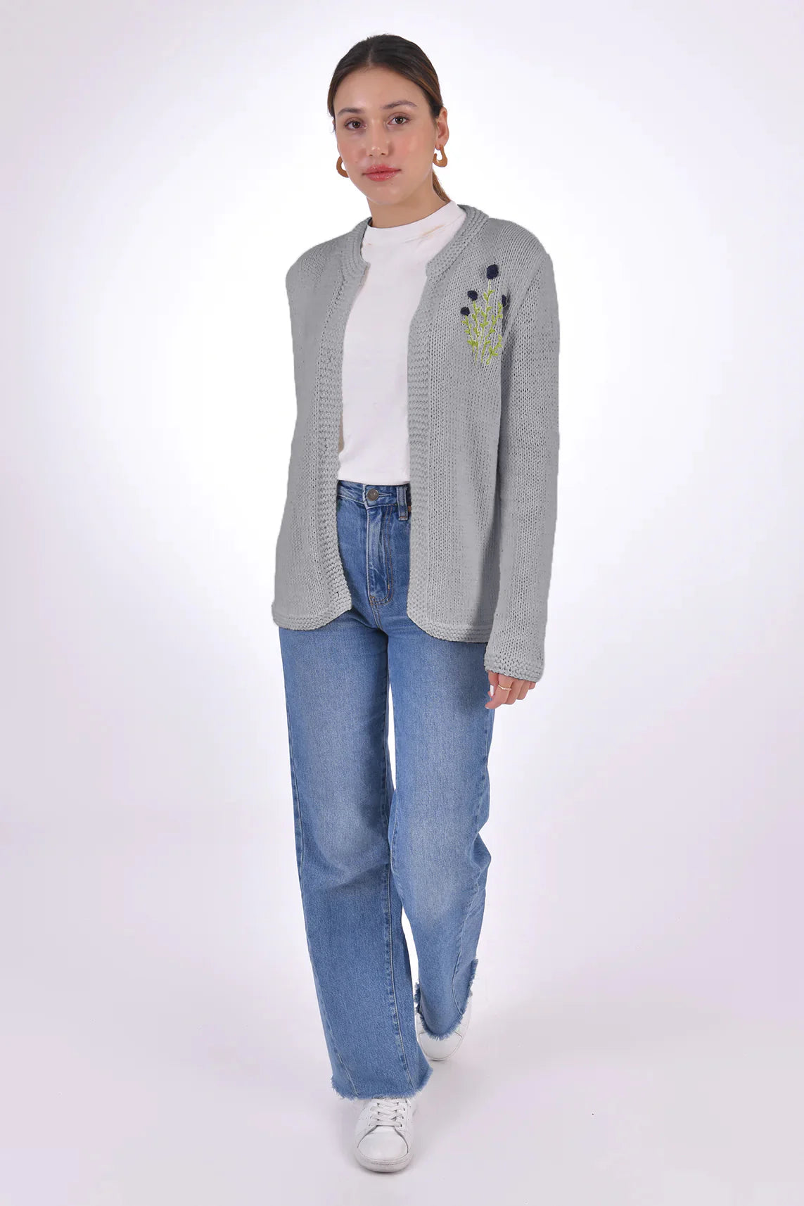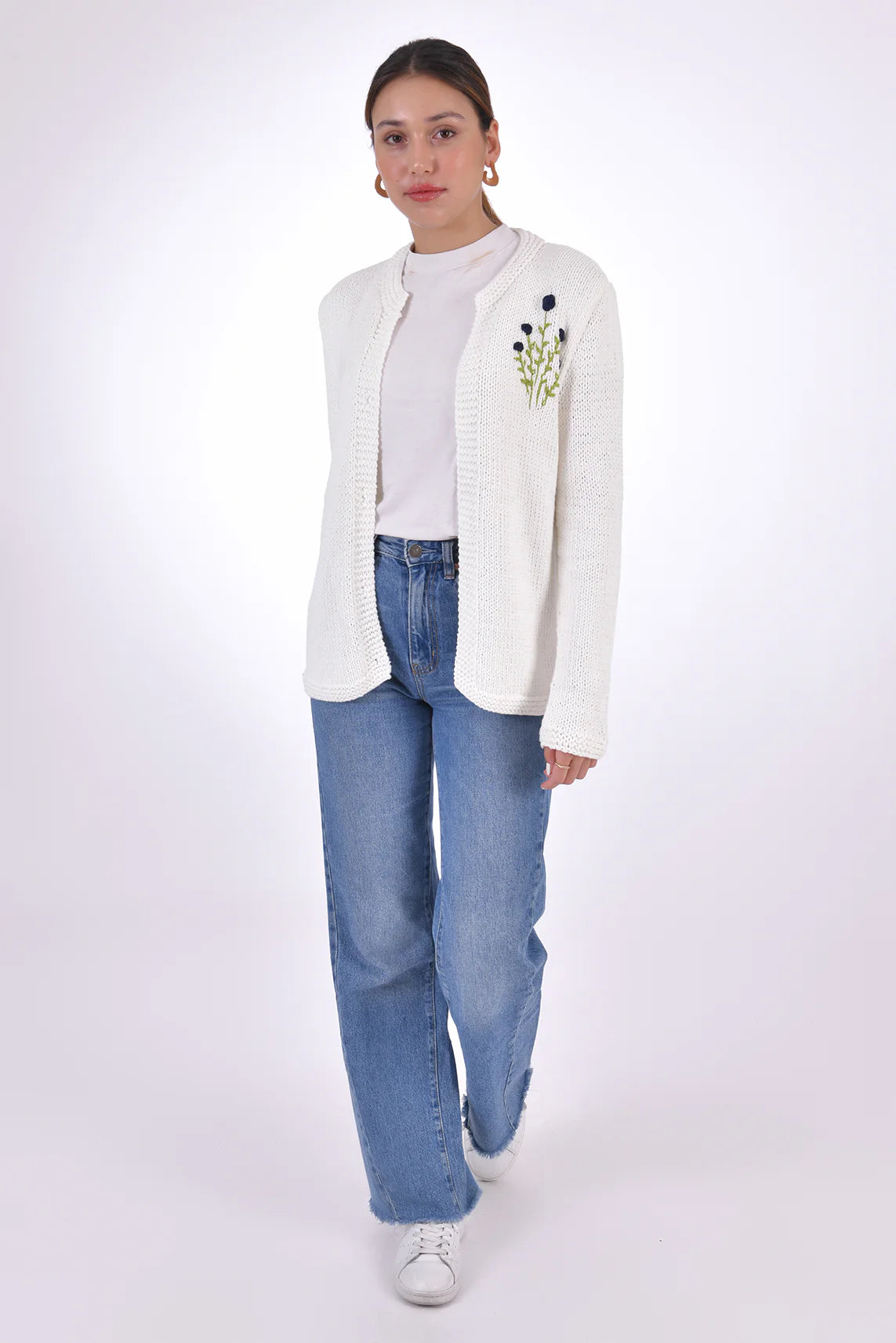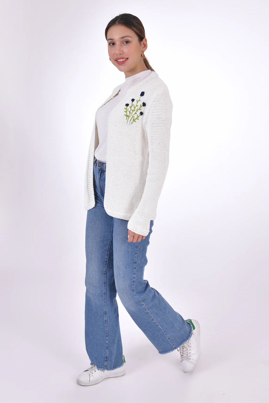 Open front hand-knit and hand-embroidered cardigan sweater from 100% organic cotton, featuring a luxurious thick knit and exquisite floral embroidery adorning the right side.