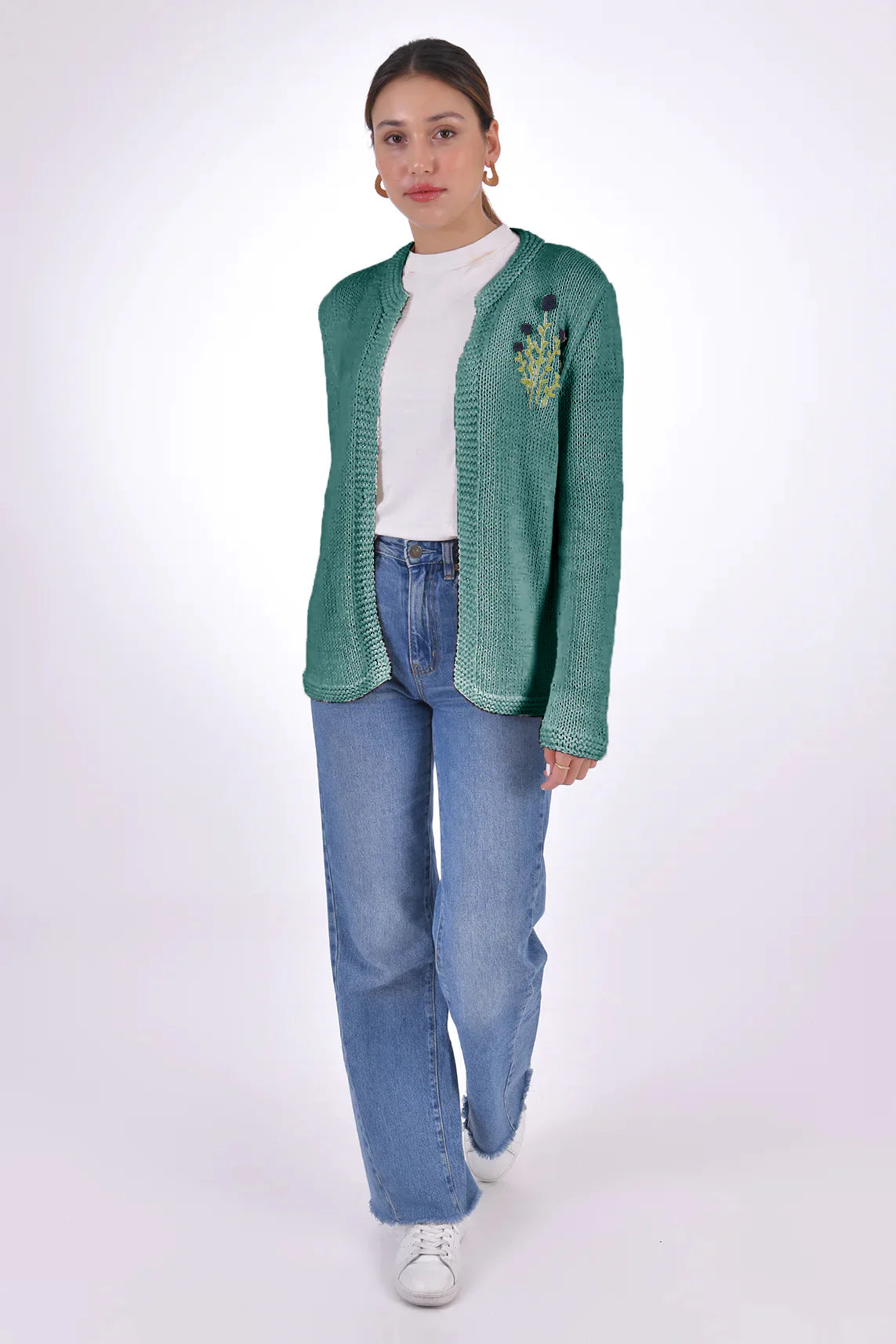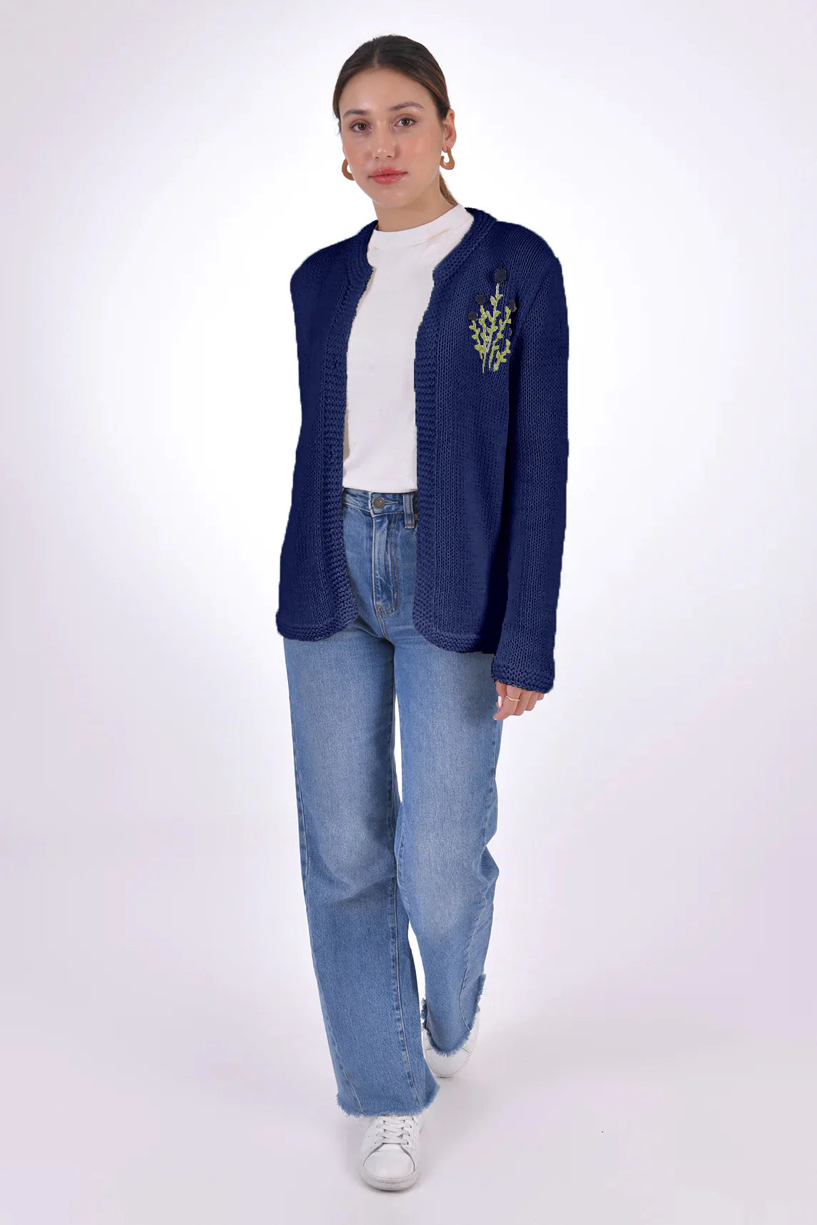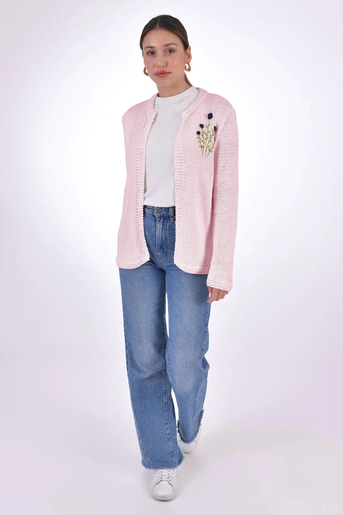 Open front hand-knit and hand-embroidered cardigan sweater from 100% organic cotton, featuring a luxurious thick knit and exquisite floral embroidery adorning the right side.