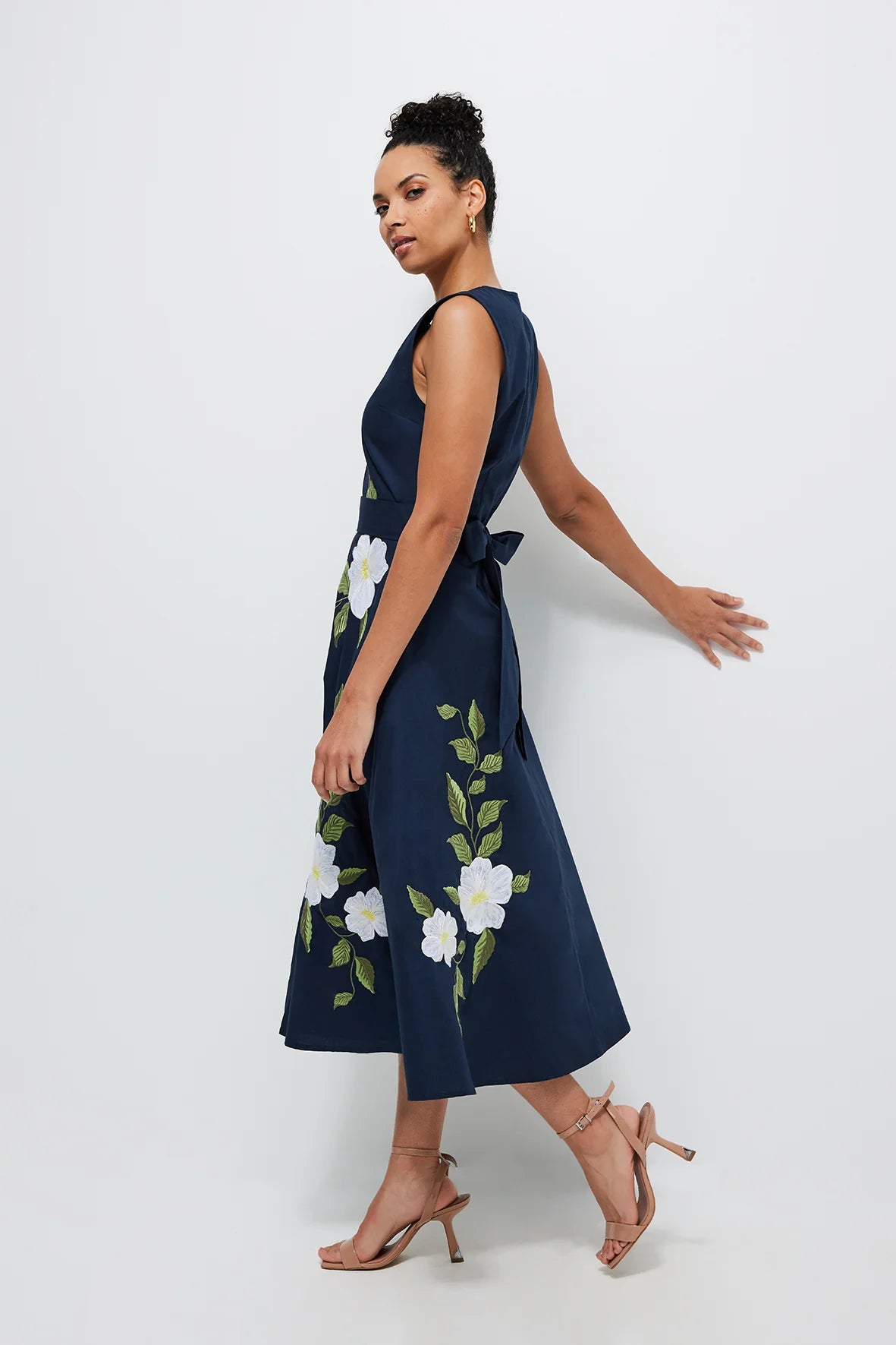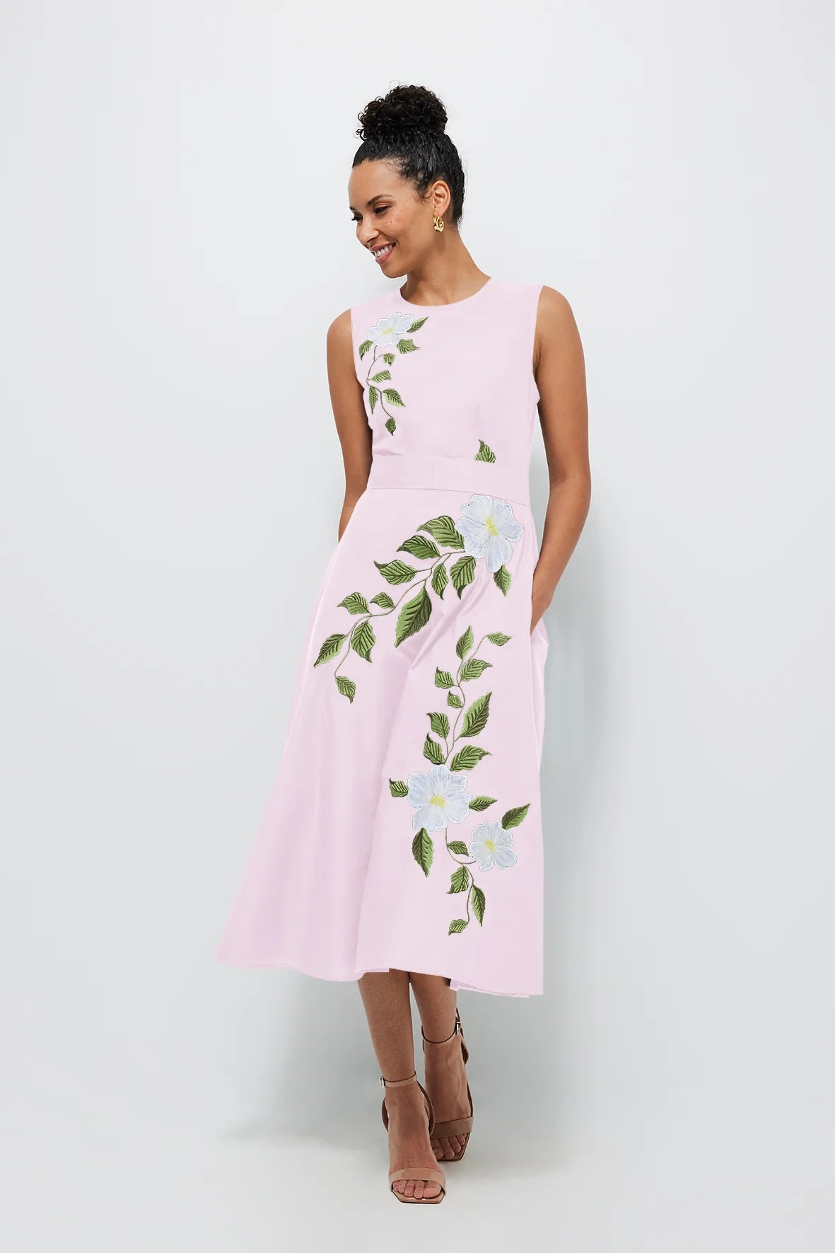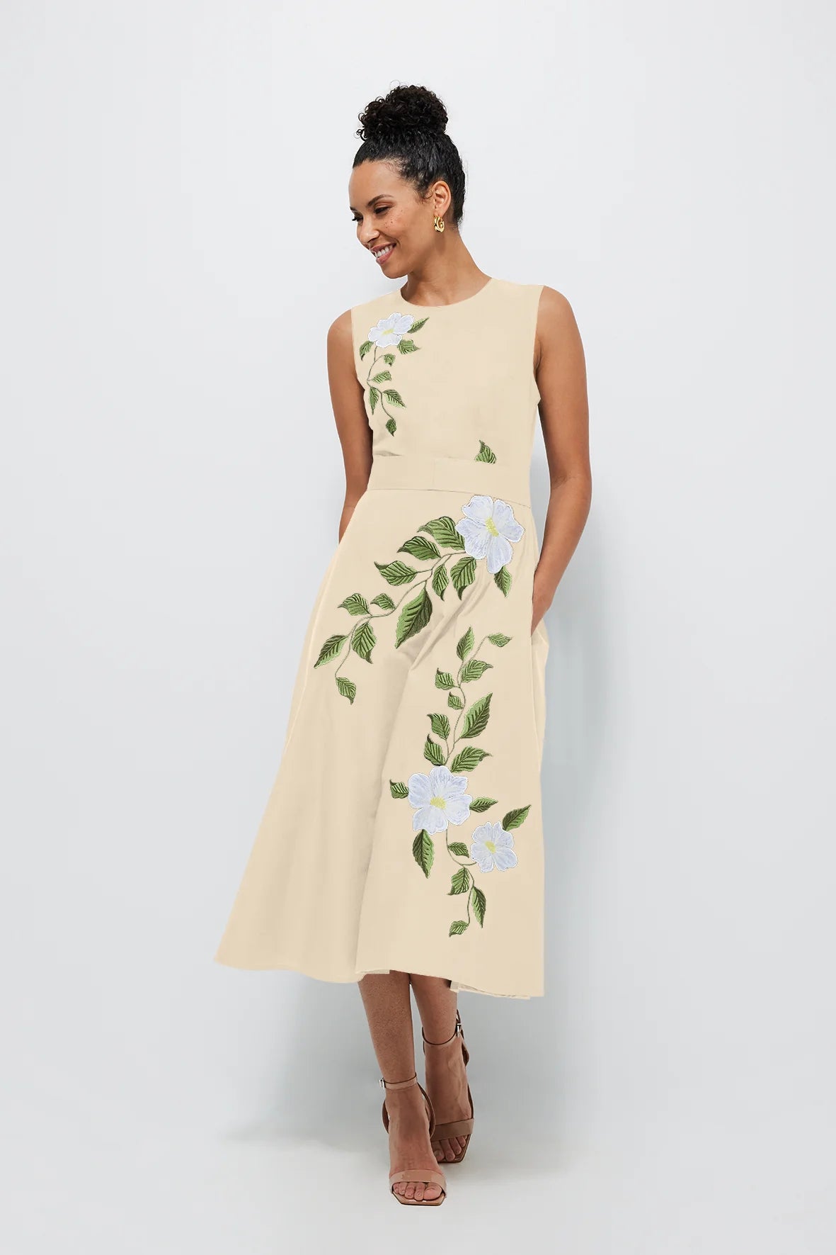 Adorned with intricate white magnolia embroidery, this midi dress blends effortless style with thoughtful details like a removable tie-front belt and hidden side pockets. Crafted from 100% cotton, its flattering A-line silhouette makes it a versatile staple for any occasion.