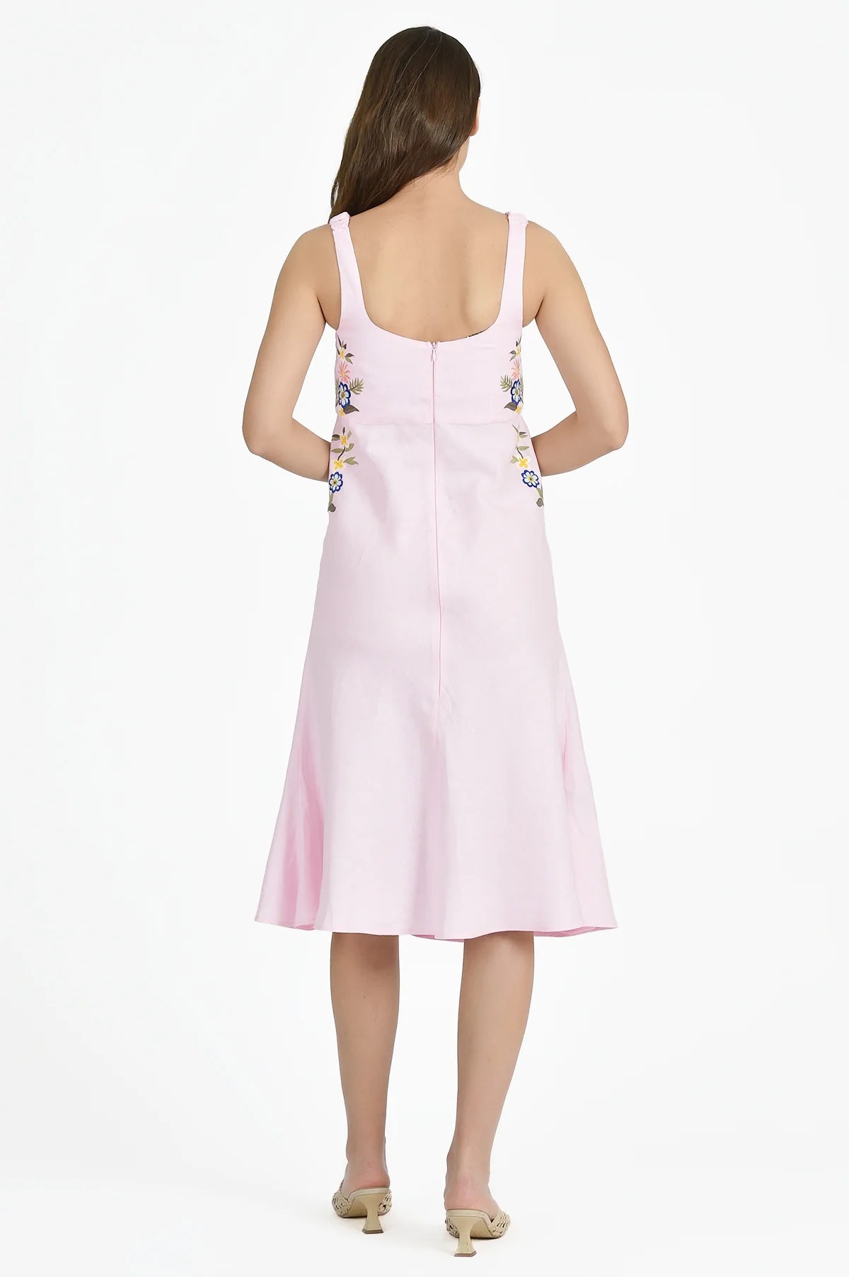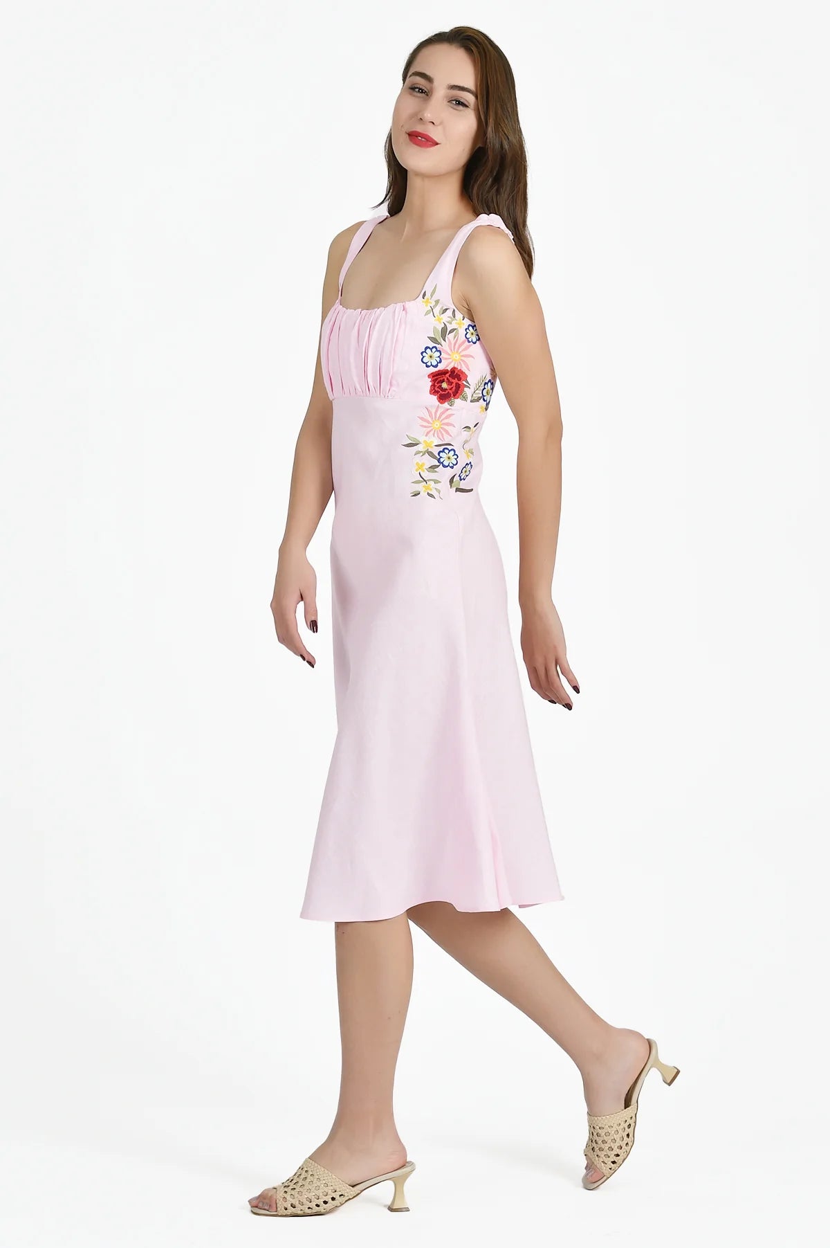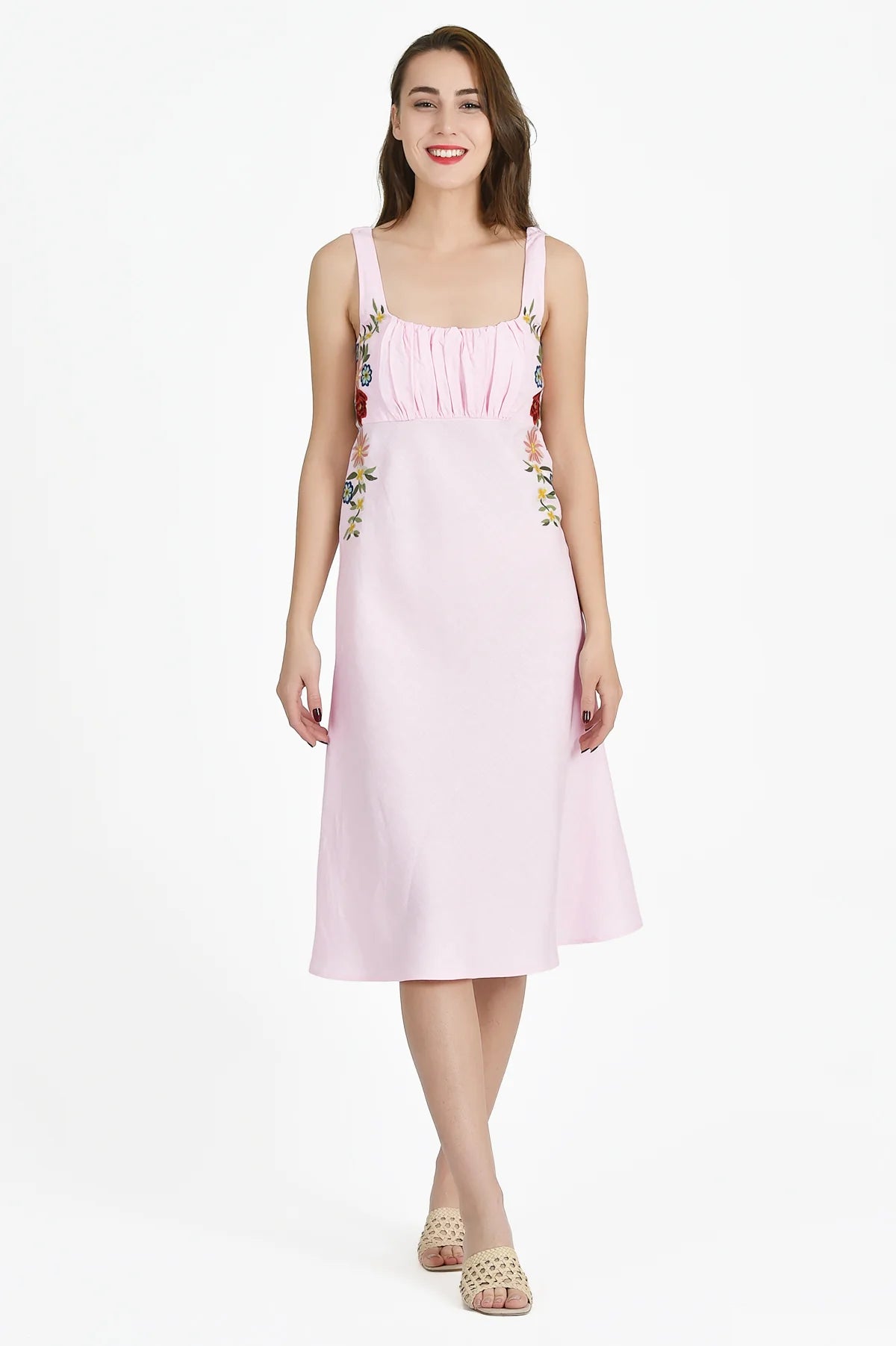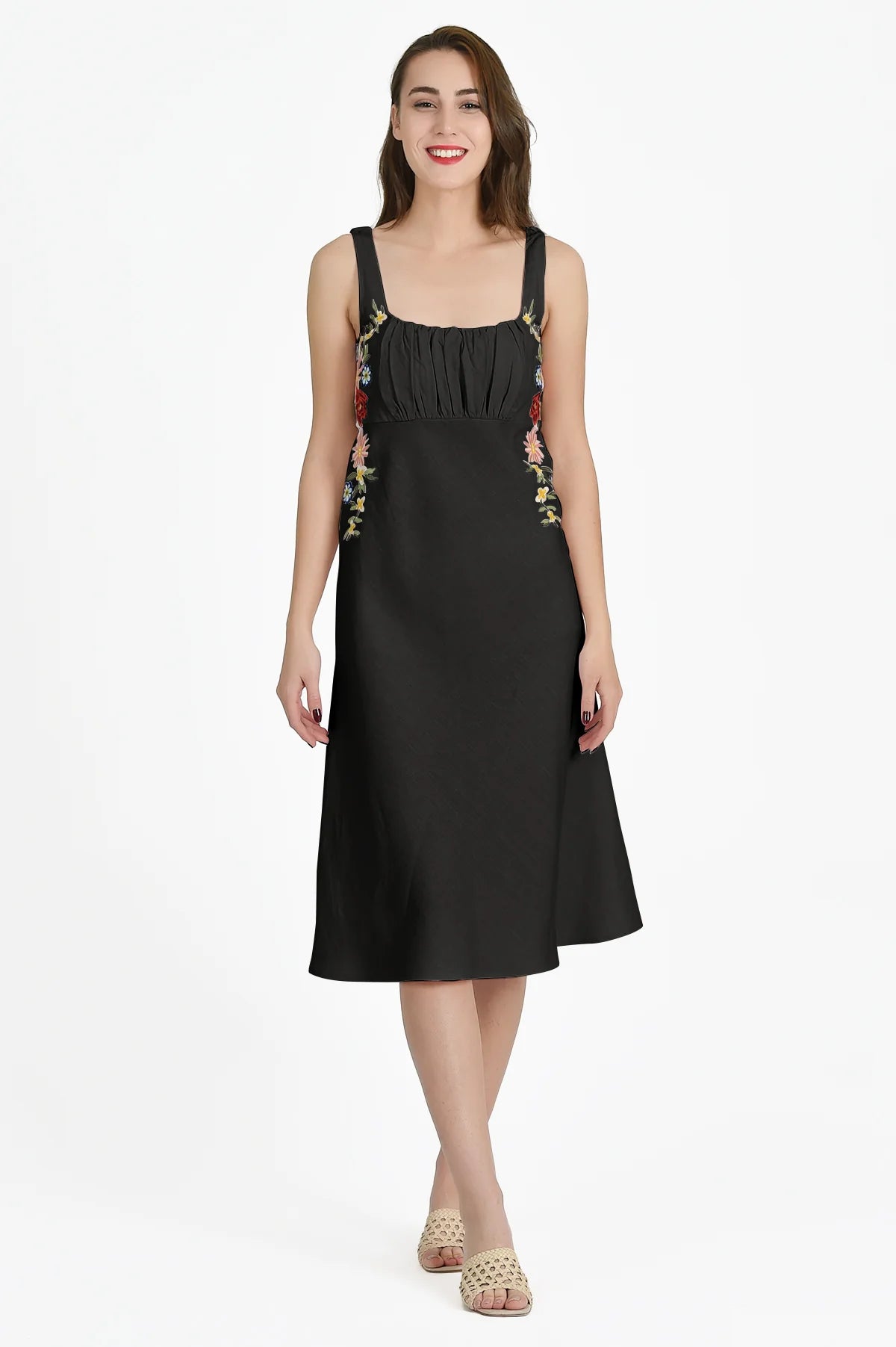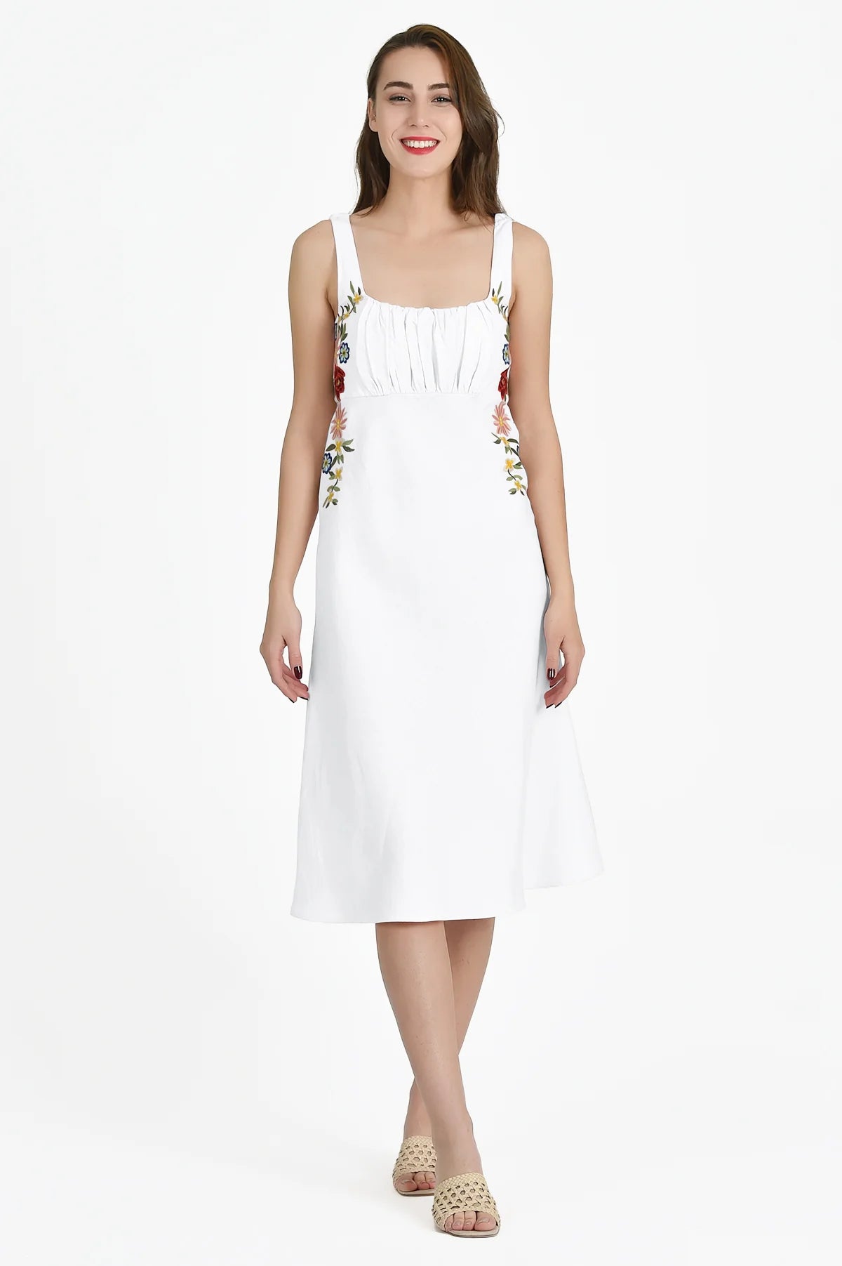 This 100% cotton midi dress is a summer staple that combines a comfortable, figure-flattering silhouette with a touch of sophisticated charm.