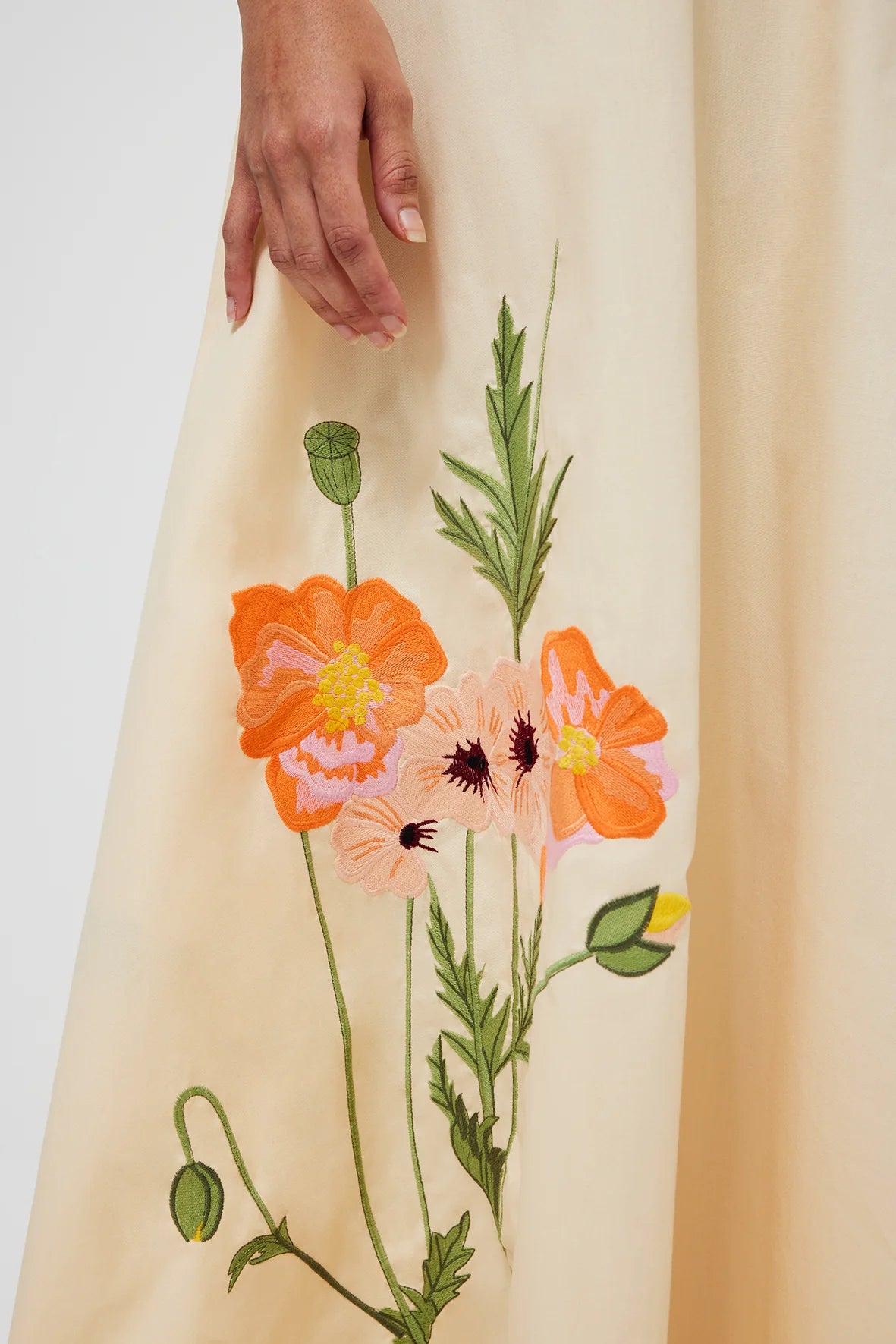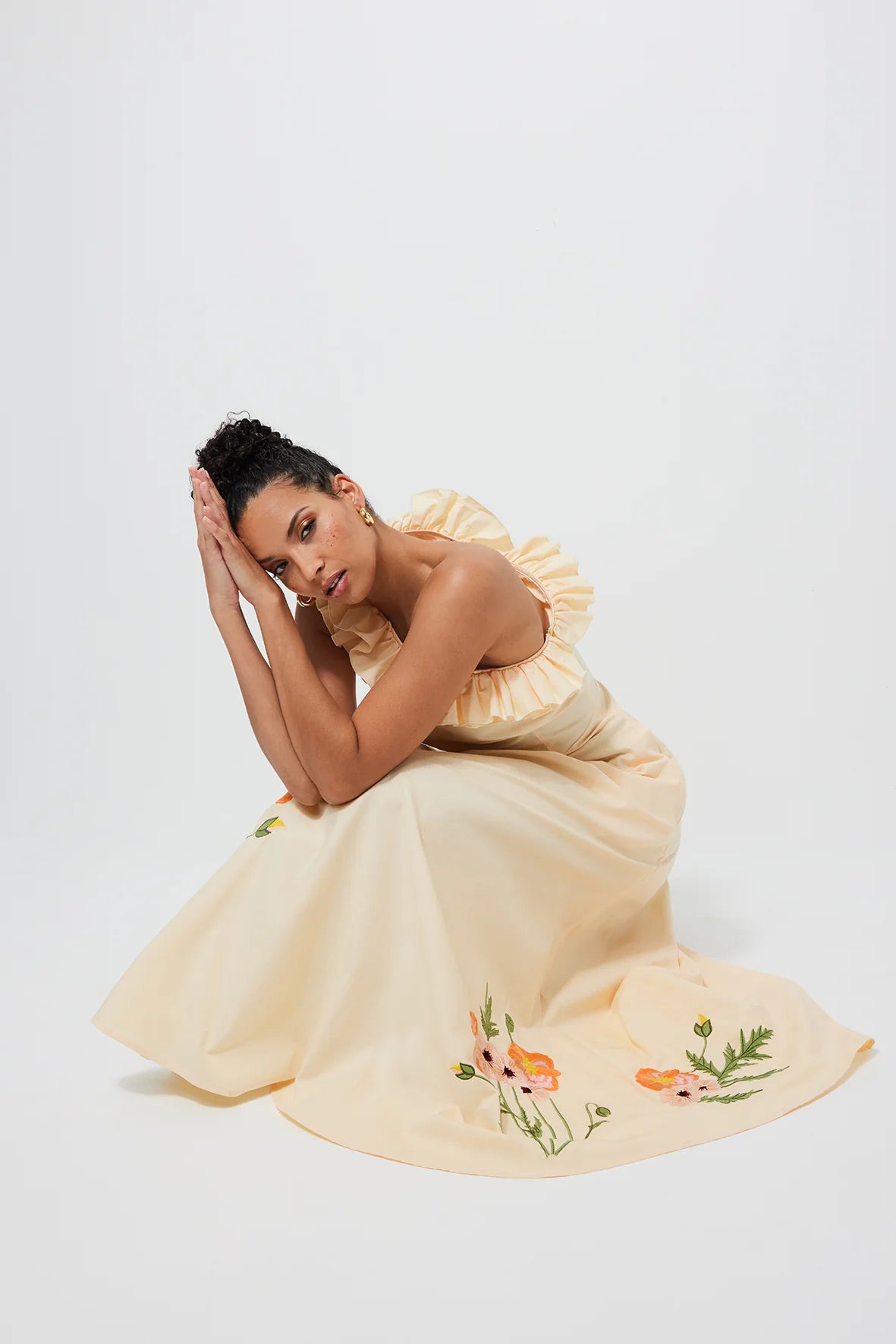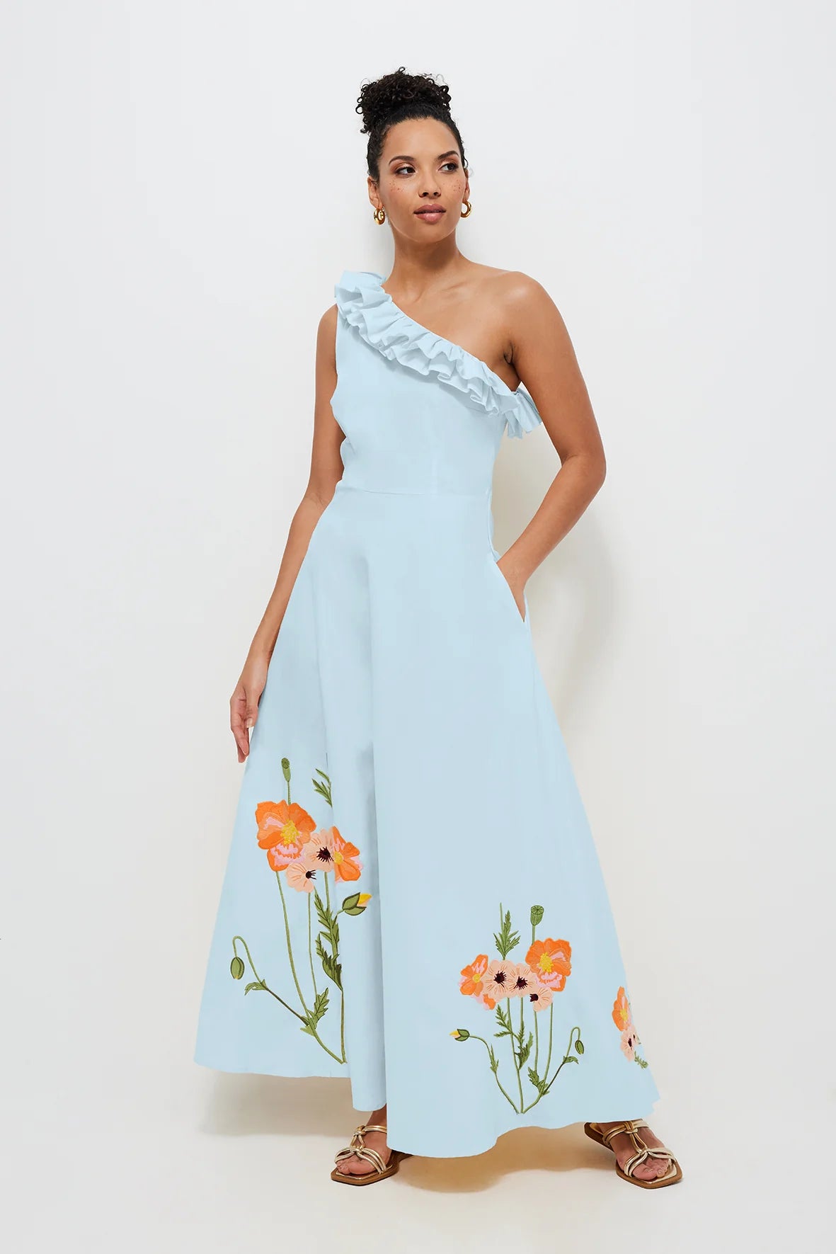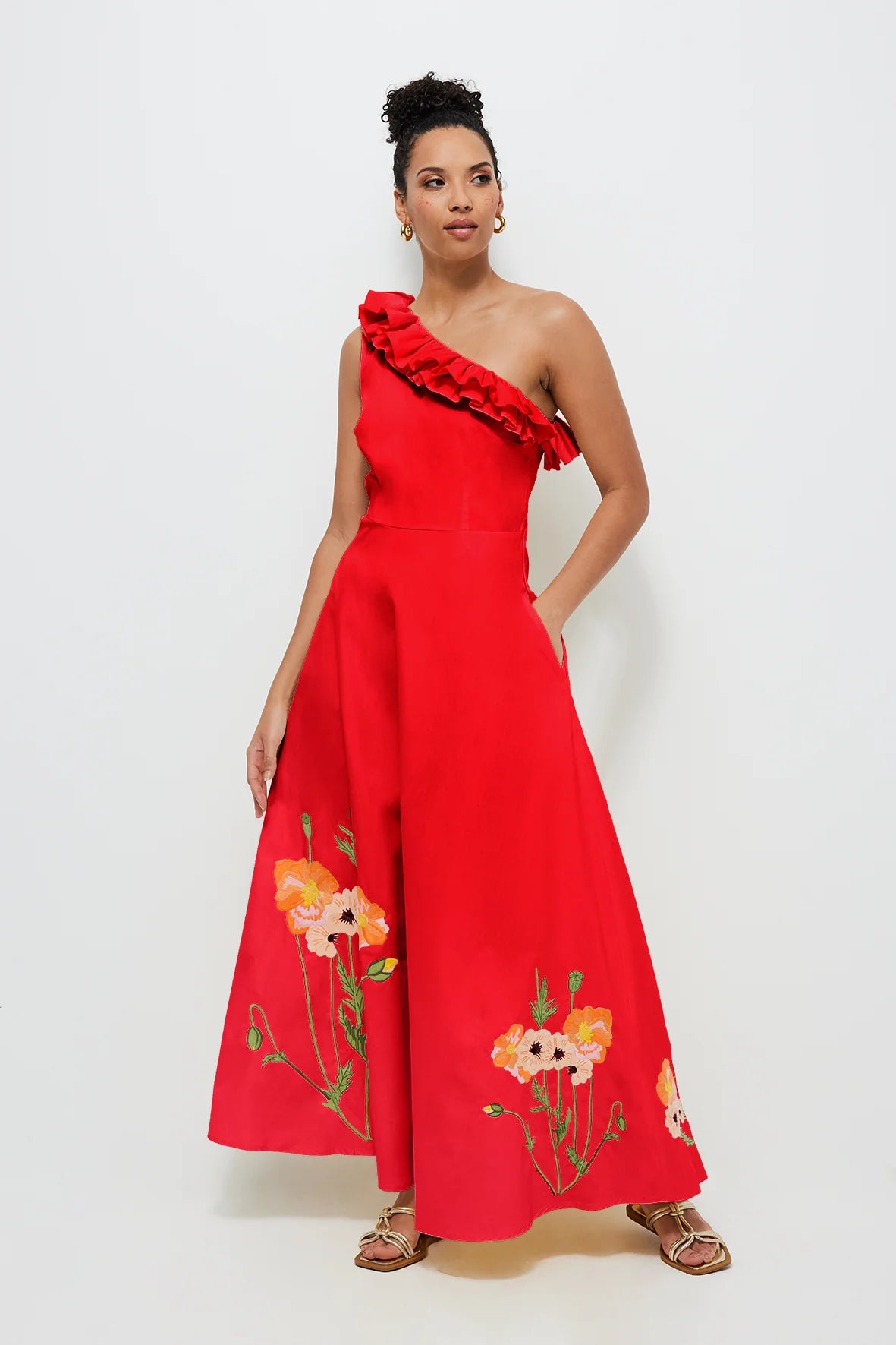 A statement piece with effortless charm, this one-shoulder maxi dress features a flowing silhouette and exquisite floral embroidery. The ruffled shoulder detail creates a subtle yet striking accent.