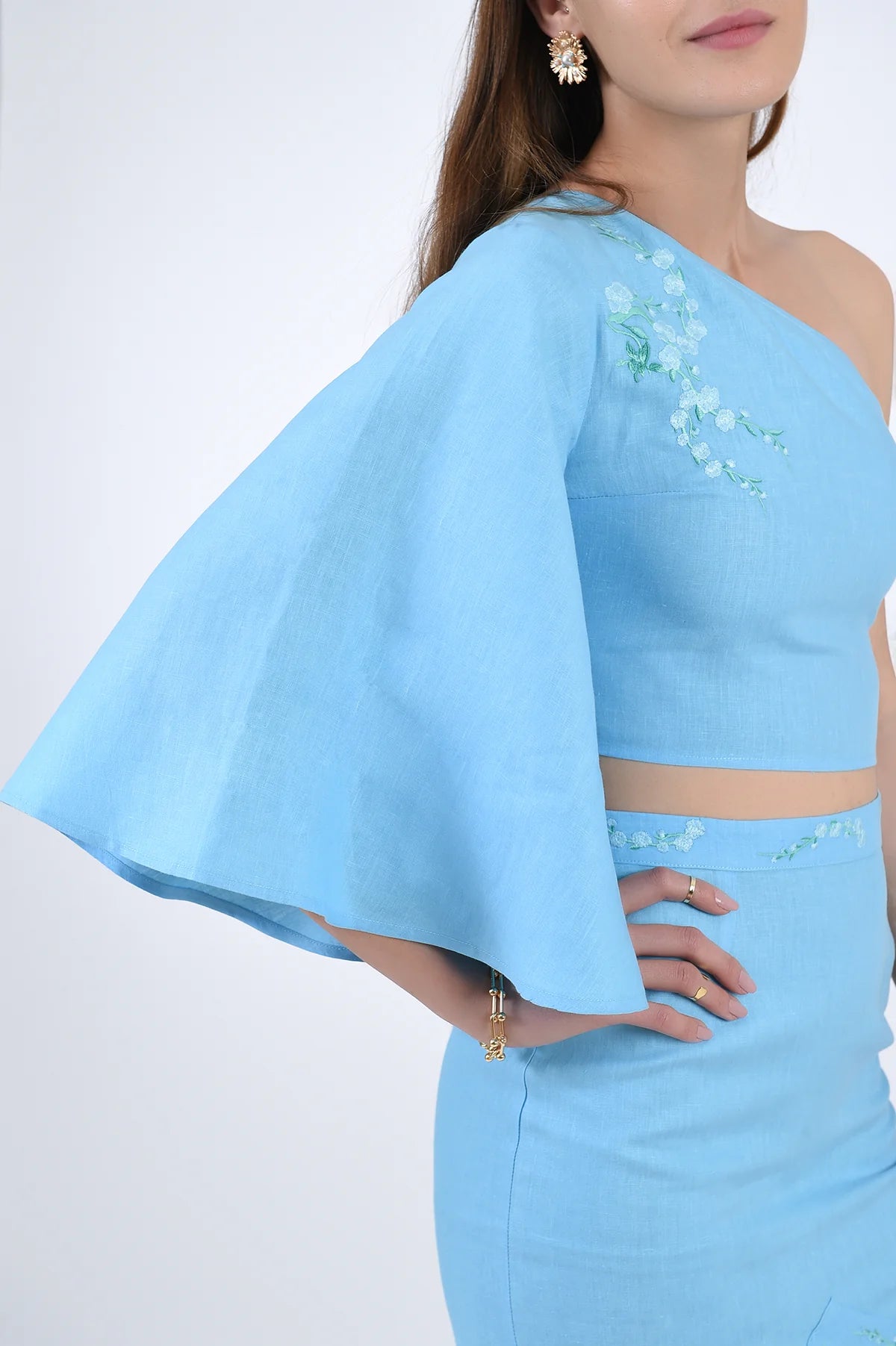 Our lightweight cotton blouse and mini skirt set features a one-shoulder, short-waisted top with a bell sleeve and intricate floral embroidery. The asymmetrical mini skirt allows for easy movement, accented by an embroidered hem and waistband that perfectly complement the top for a chic look.
