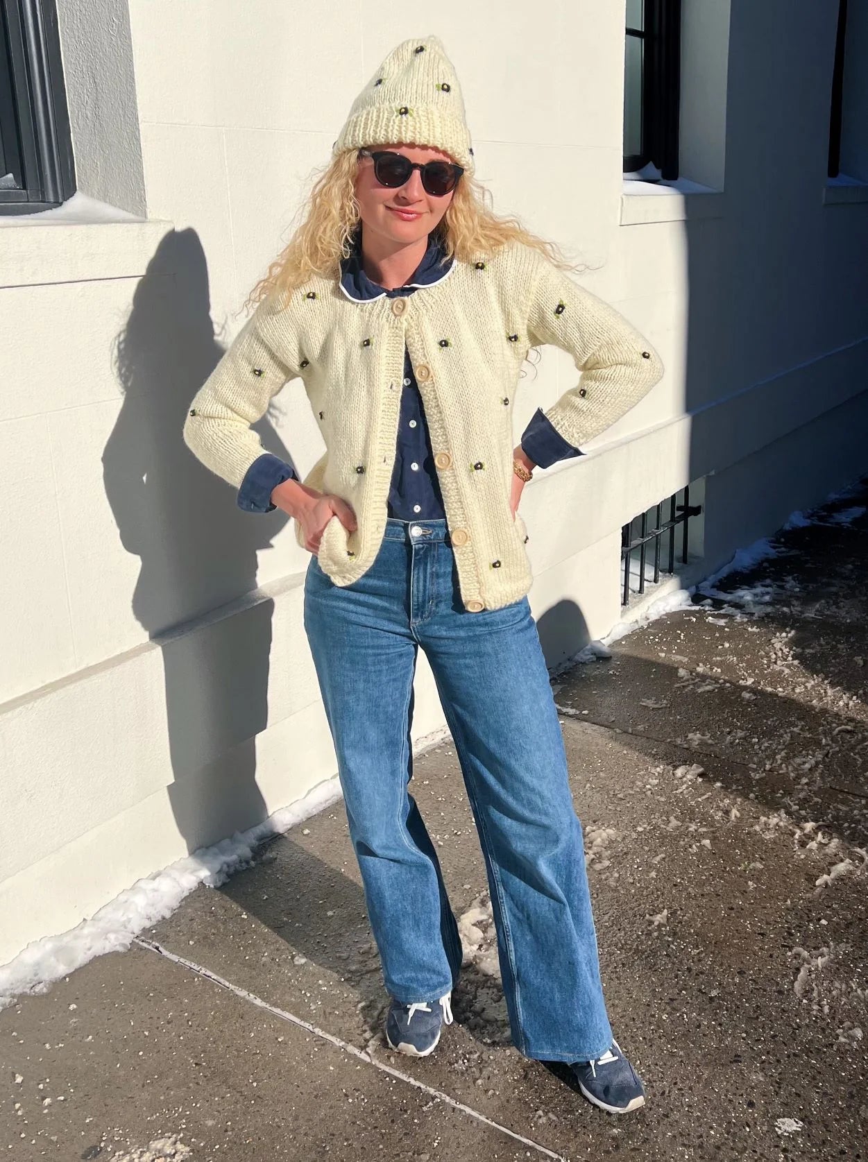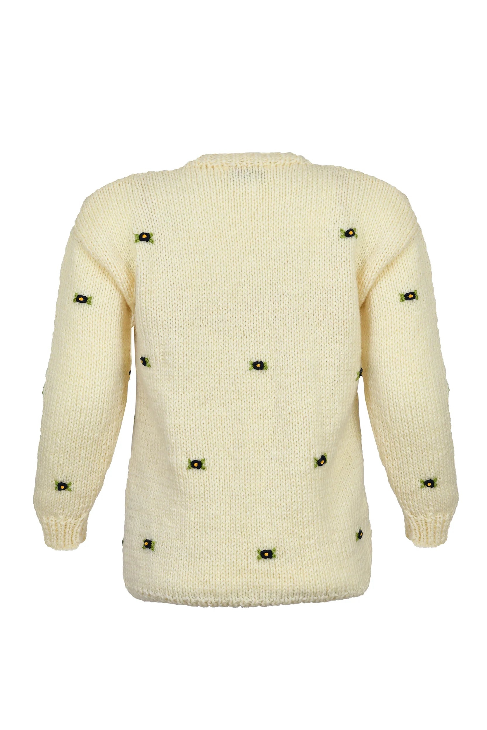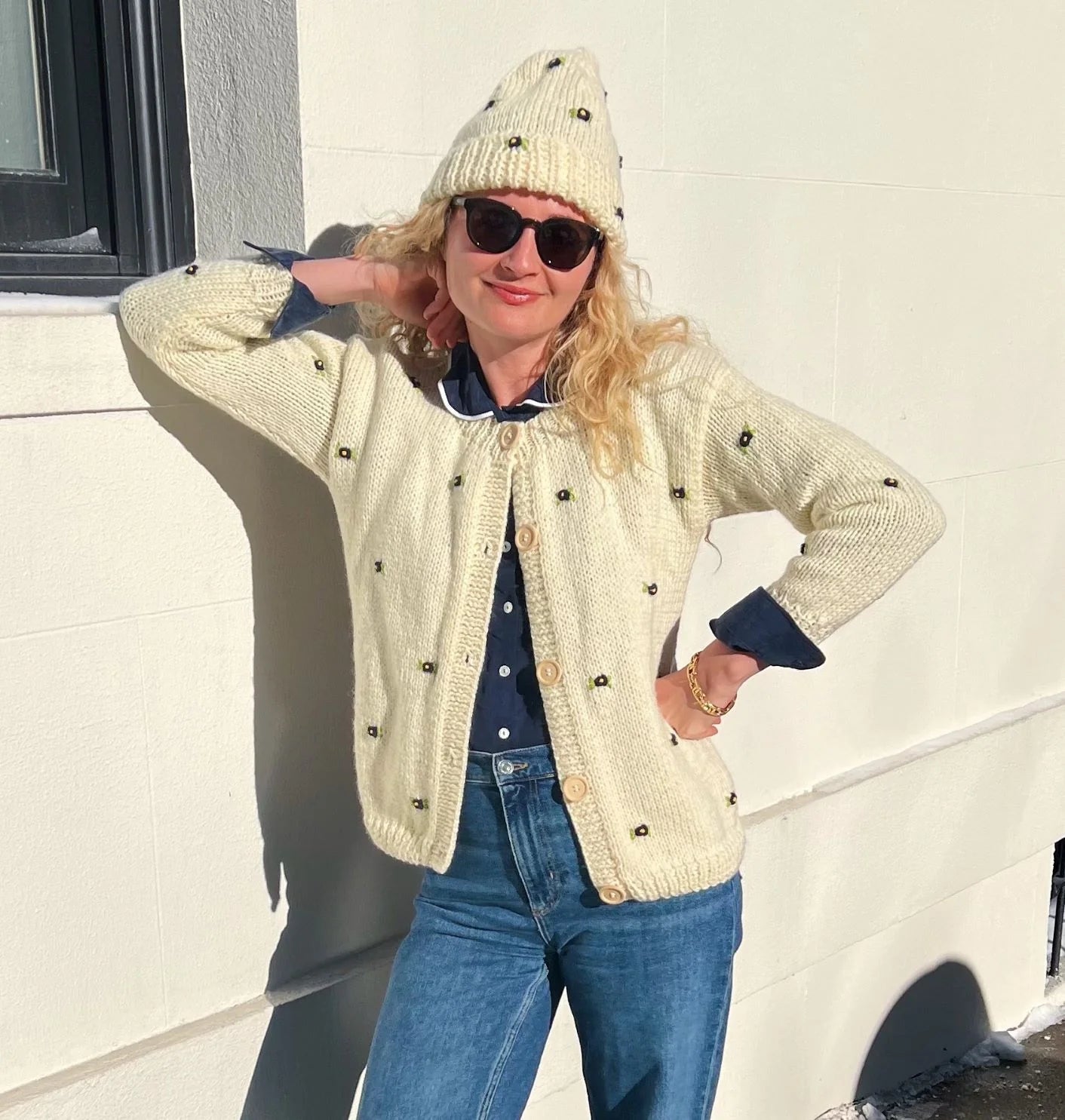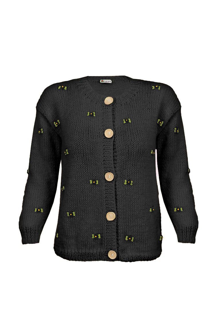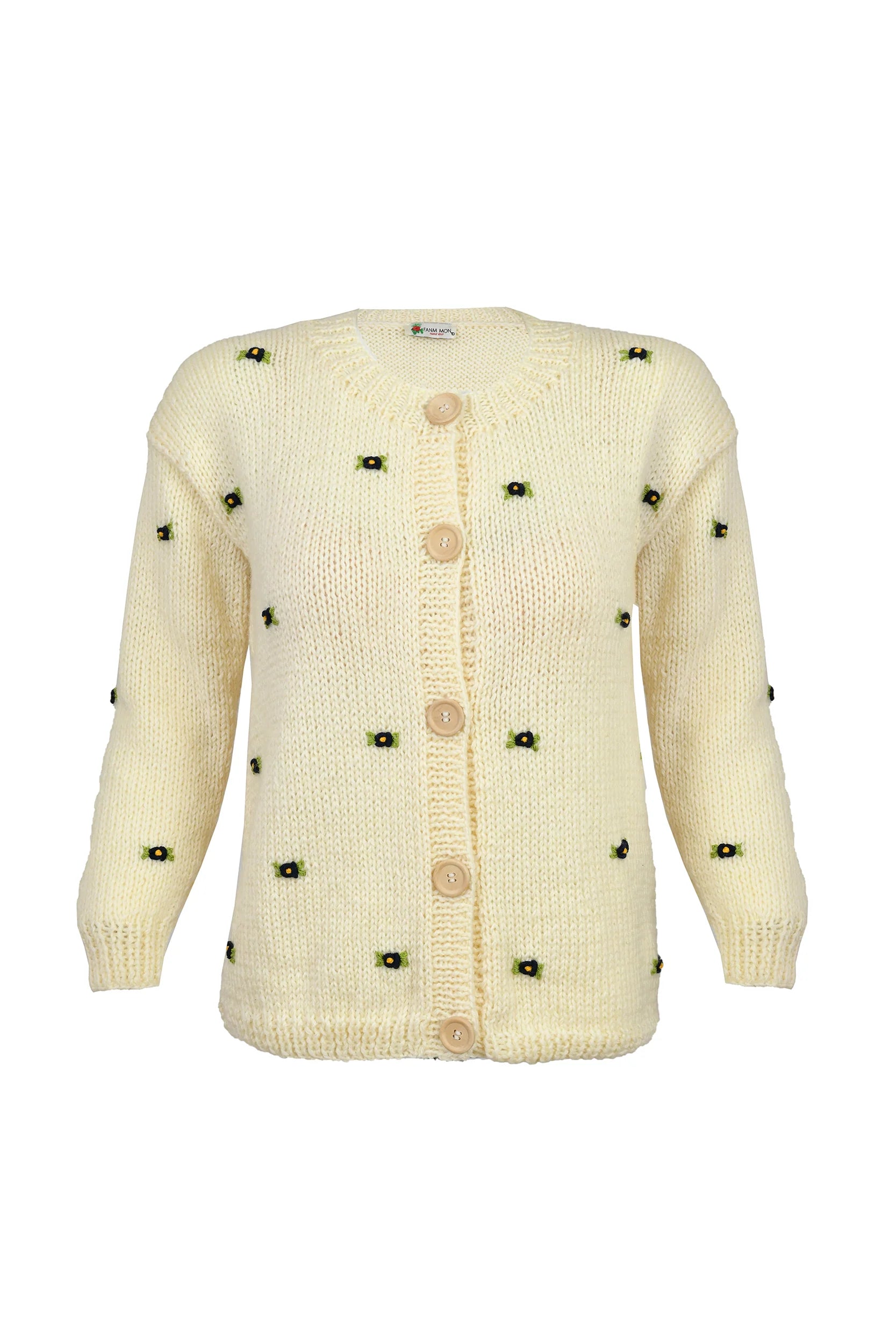 Immerse yourself in the indulgent coziness of this wool button-front cardigan, featuring intricate hand-embroidered floral details.