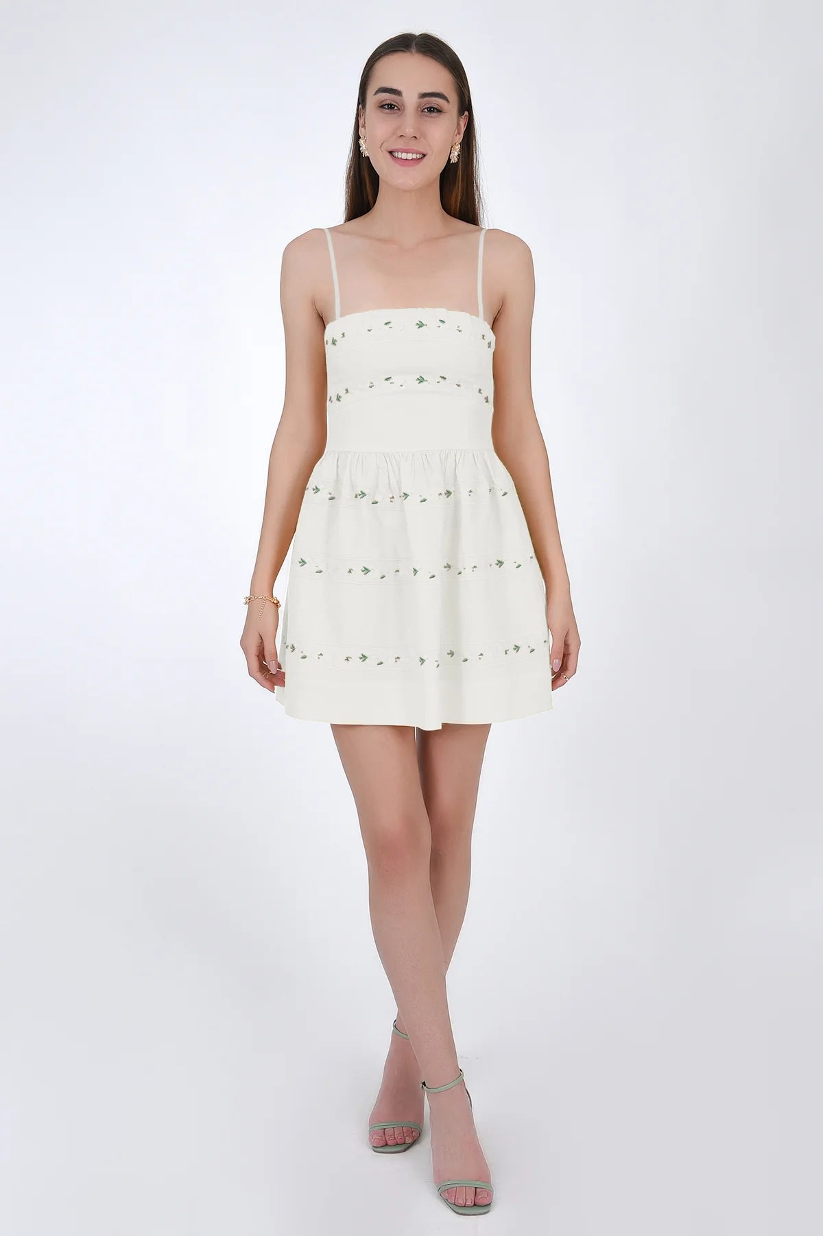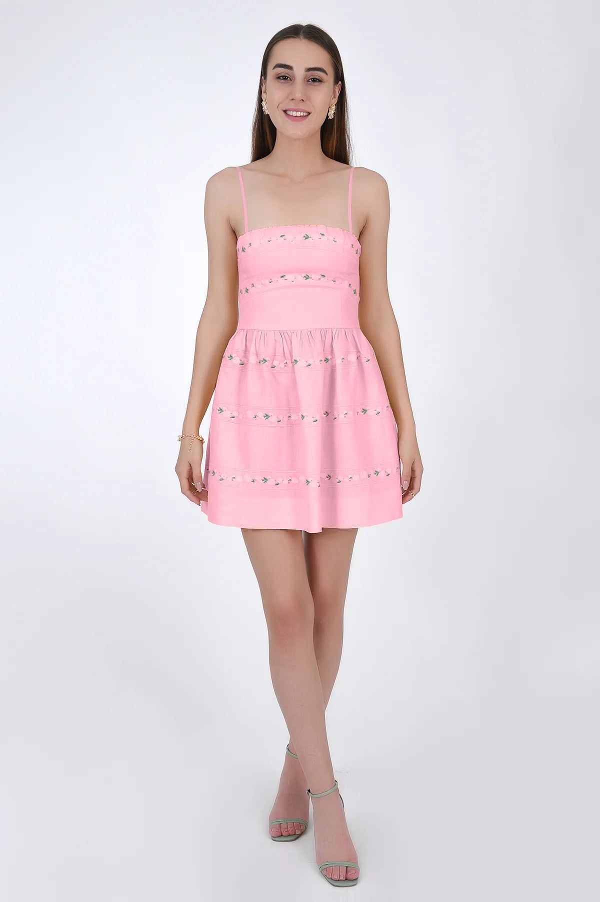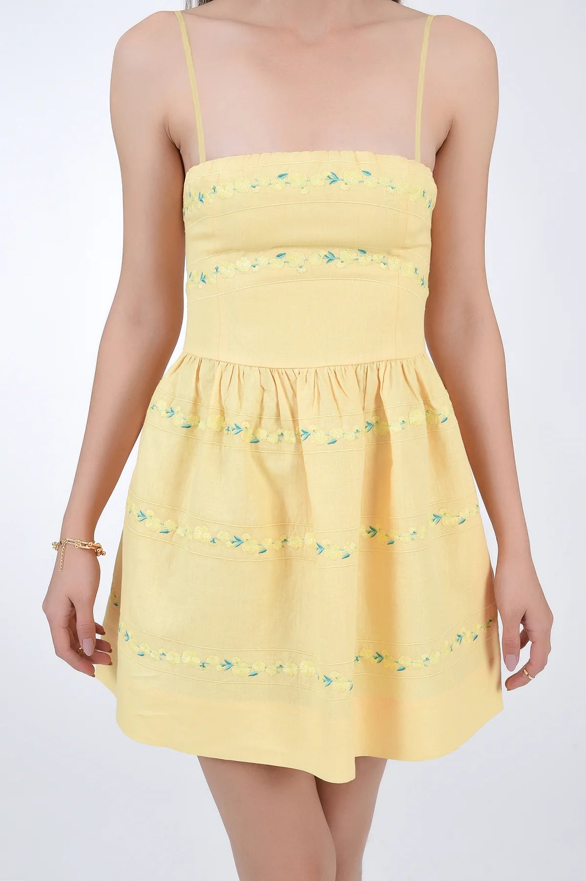 This luxurious Strapless Mini Dress boasts an all-over embroidery of floral stripe motifs. Expertly crafted from linen for comfort and breathability, this dress is the ideal choice for any special occasion.