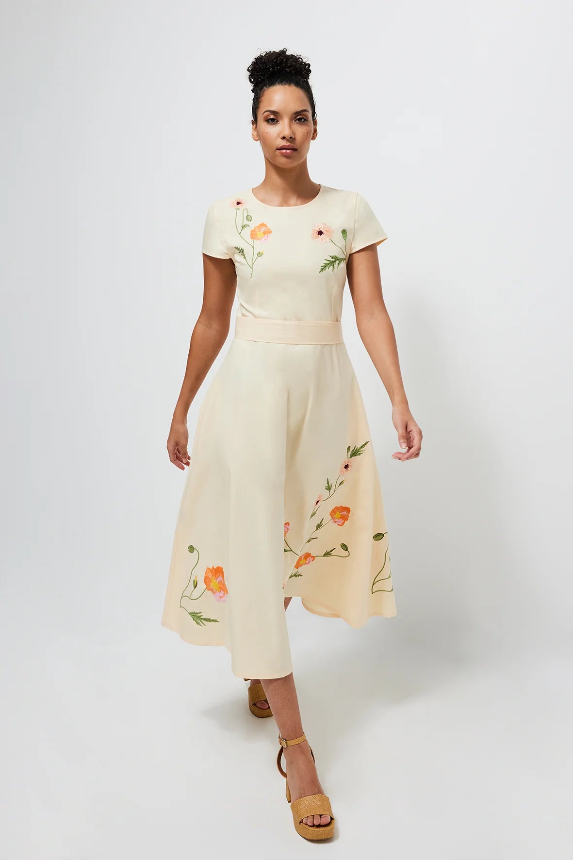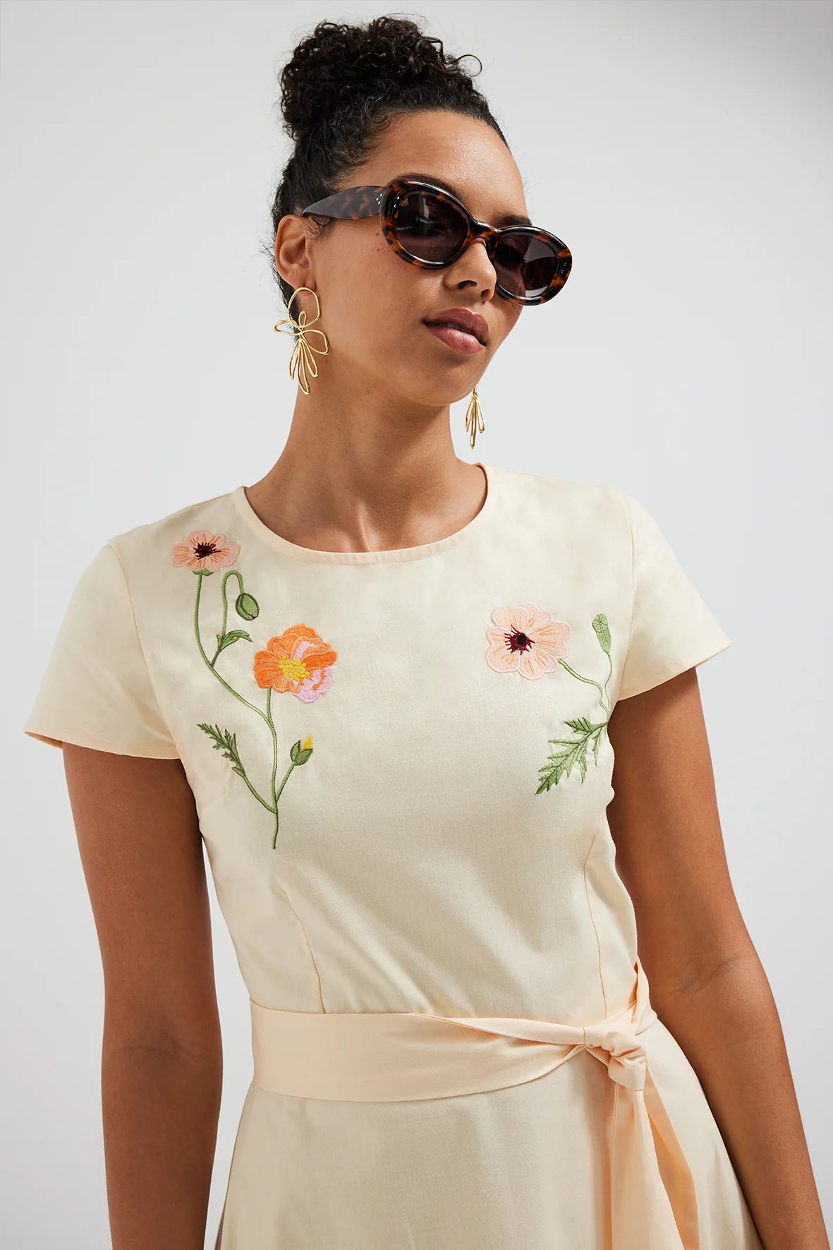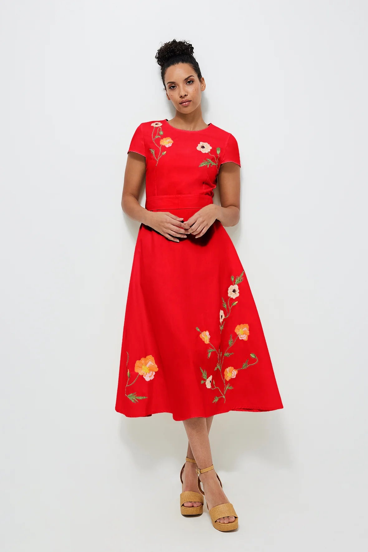 This midi dress is pure elegance. The delicate floral embroidery adds a touch of romance, while the structured bodice and flowing skirt create a flattering silhouette. A removable tie belt allows for a customizable fit, making it ideal for special occasions.