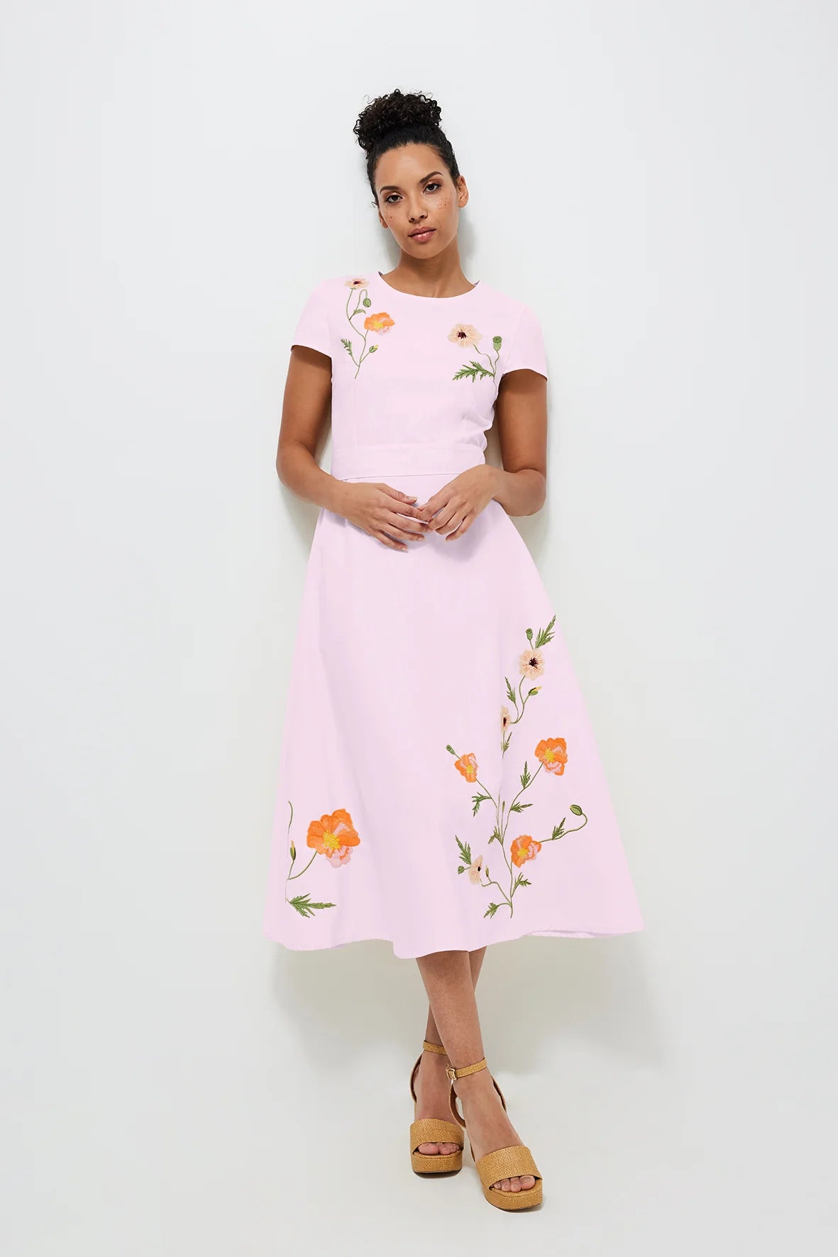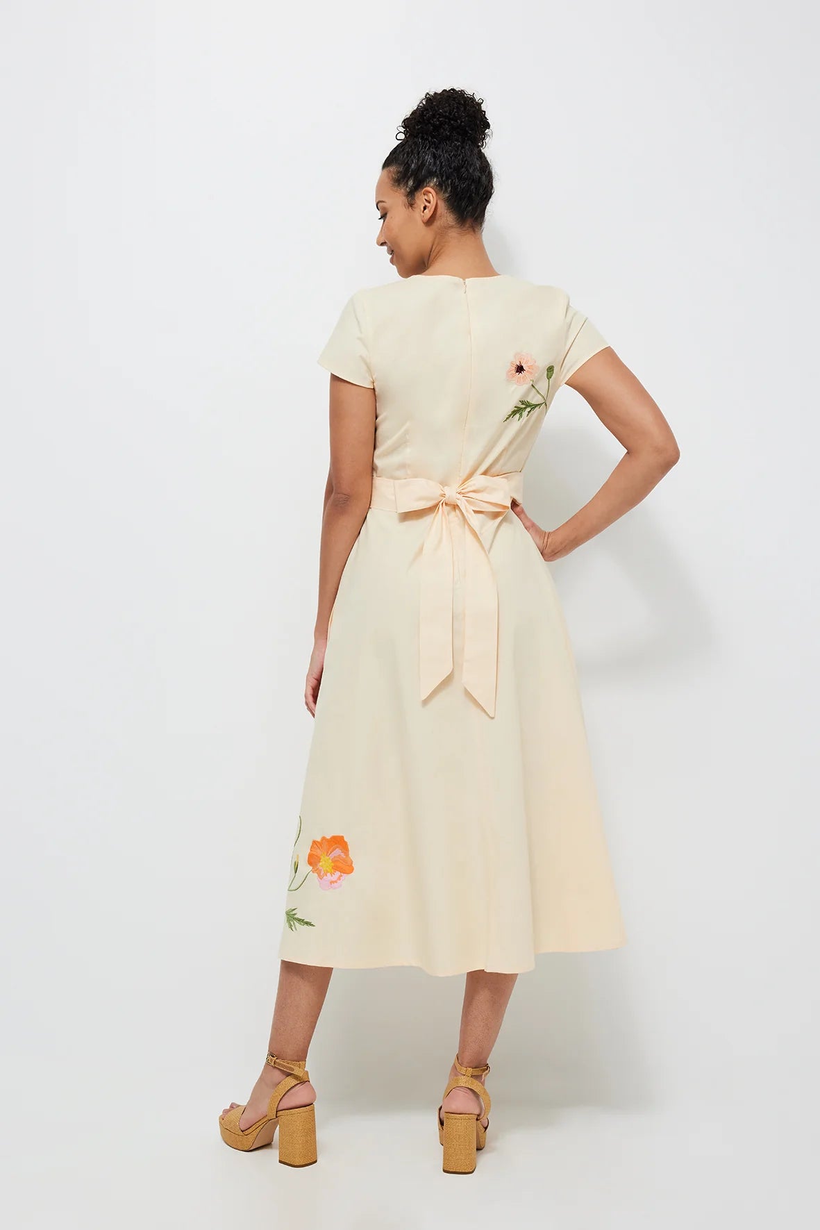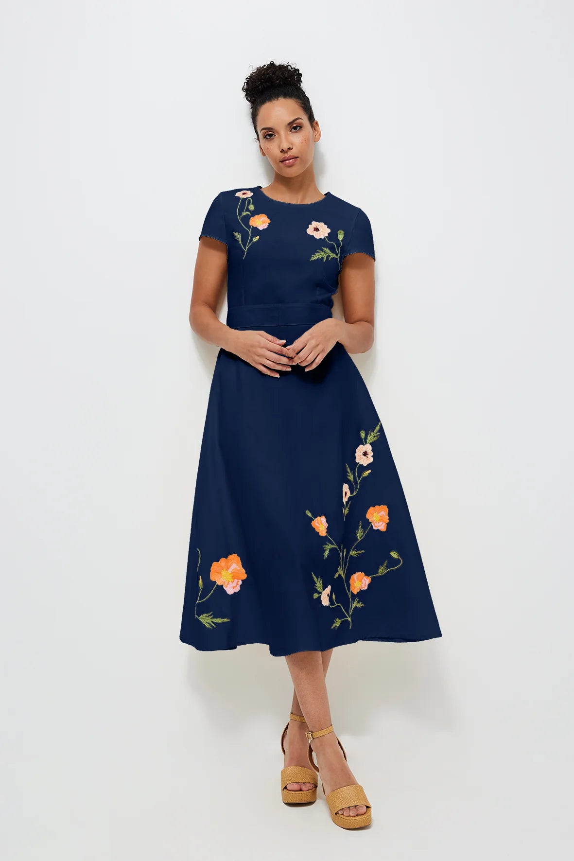 This midi dress is pure elegance. The delicate floral embroidery adds a touch of romance, while the structured bodice and flowing skirt create a flattering silhouette. A removable tie belt allows for a customizable fit, making it ideal for special occasions.