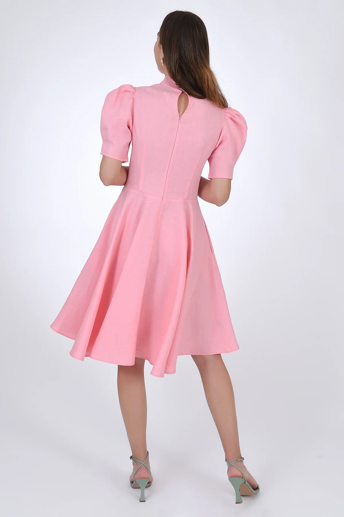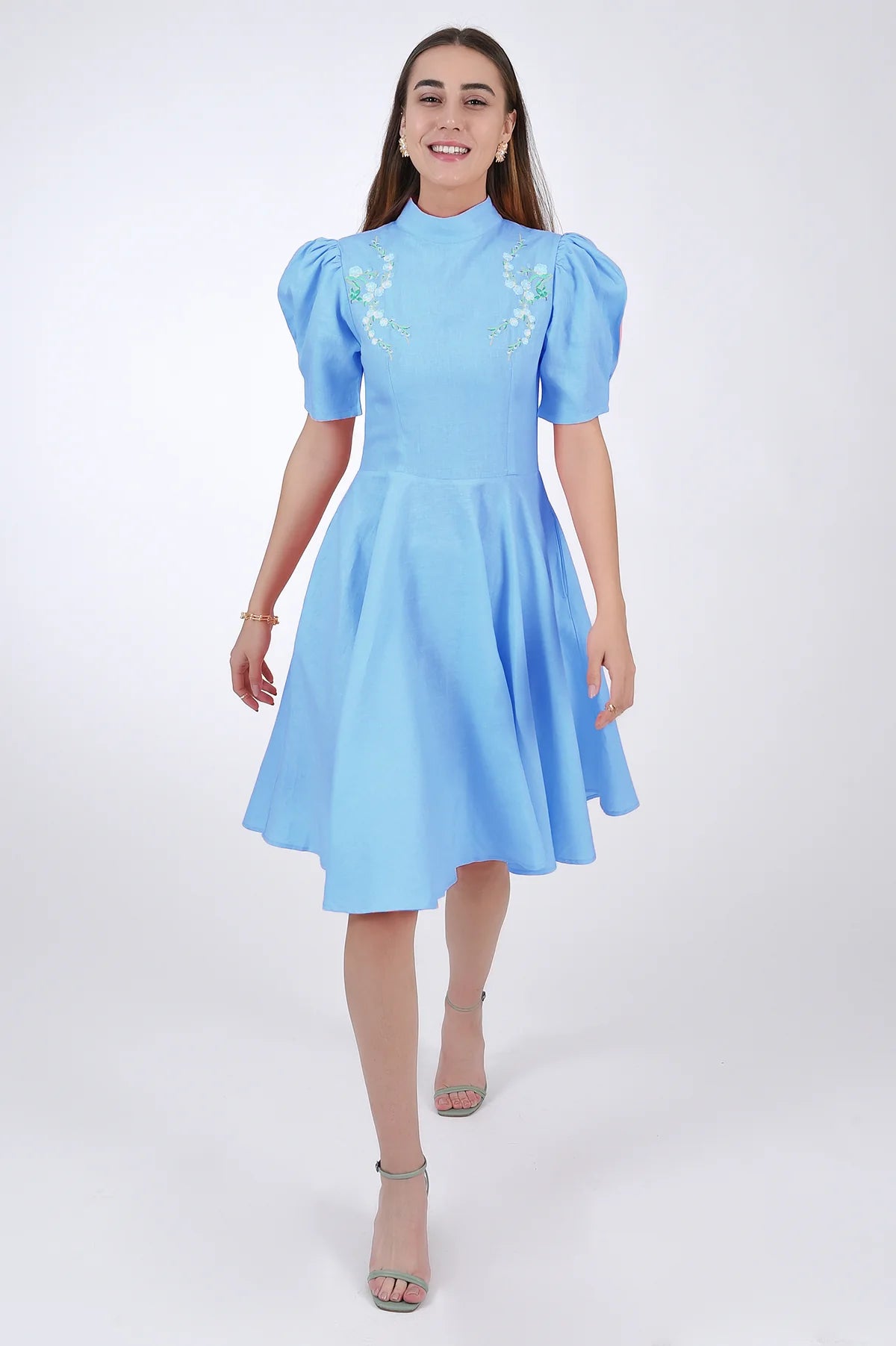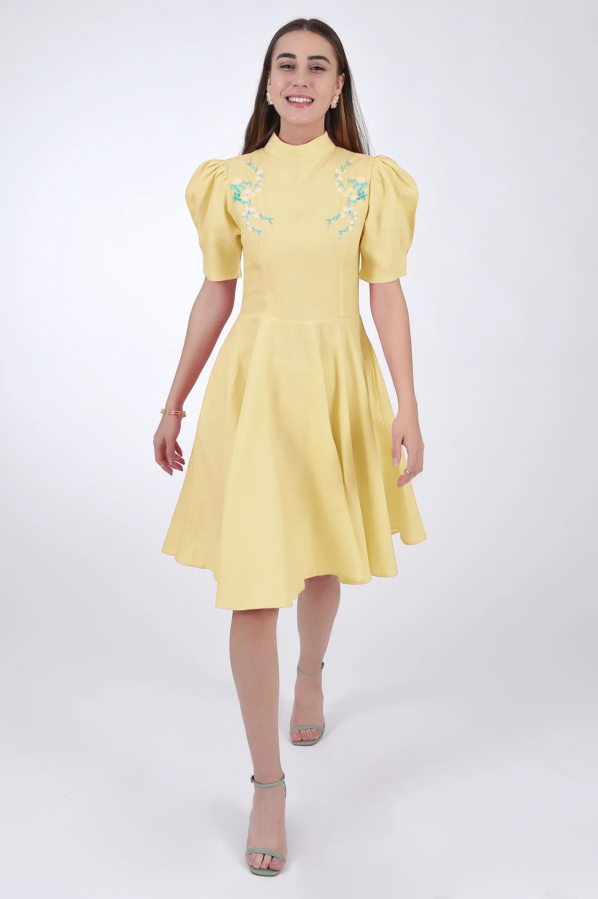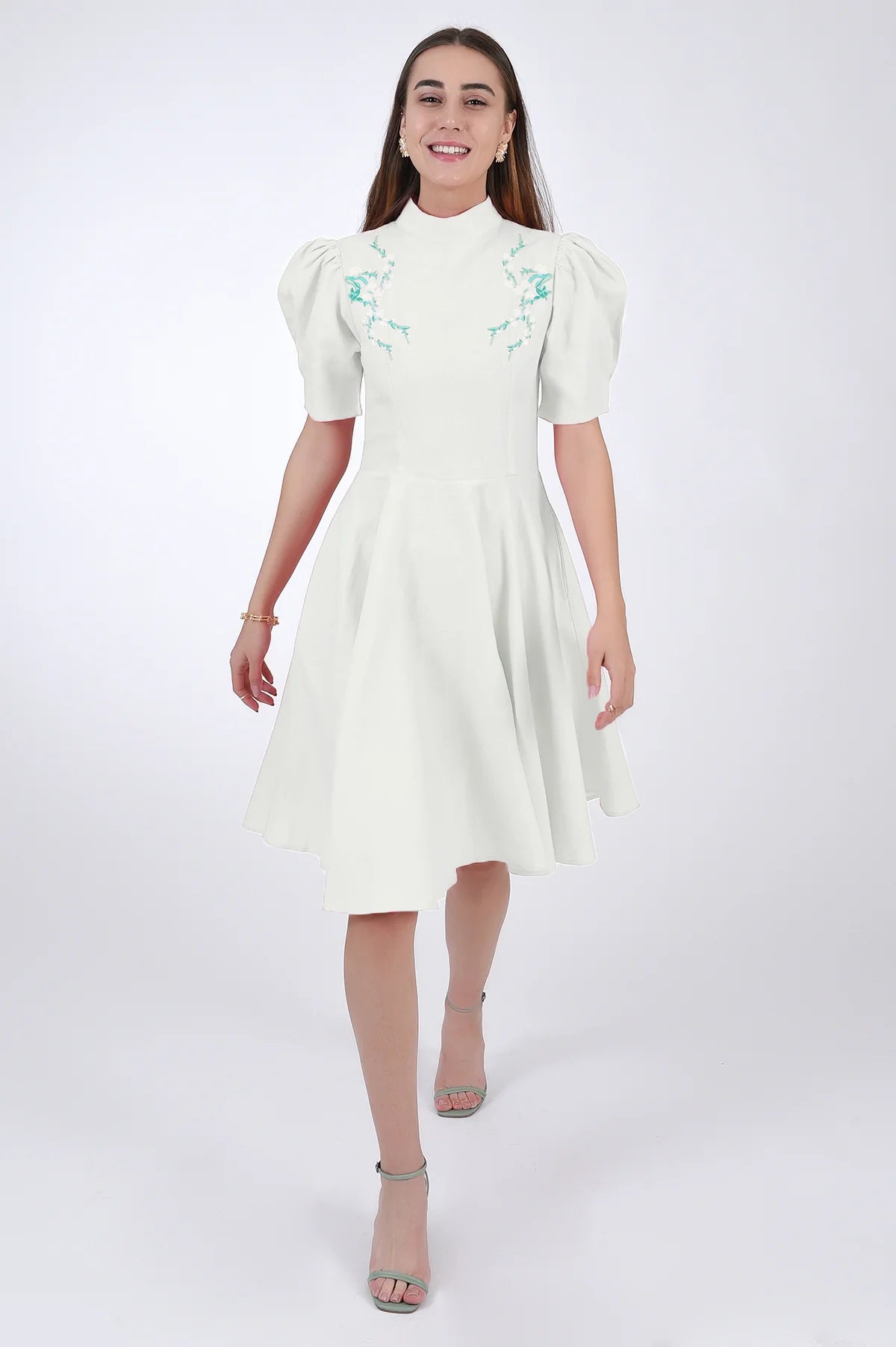 Short-sleeve dress featuring a high Nehru neckline, puffed sleeves, delicate floral embroidery, and a pleated skirt that falls gracefully to the knee—a perfect expression of classic elegance.