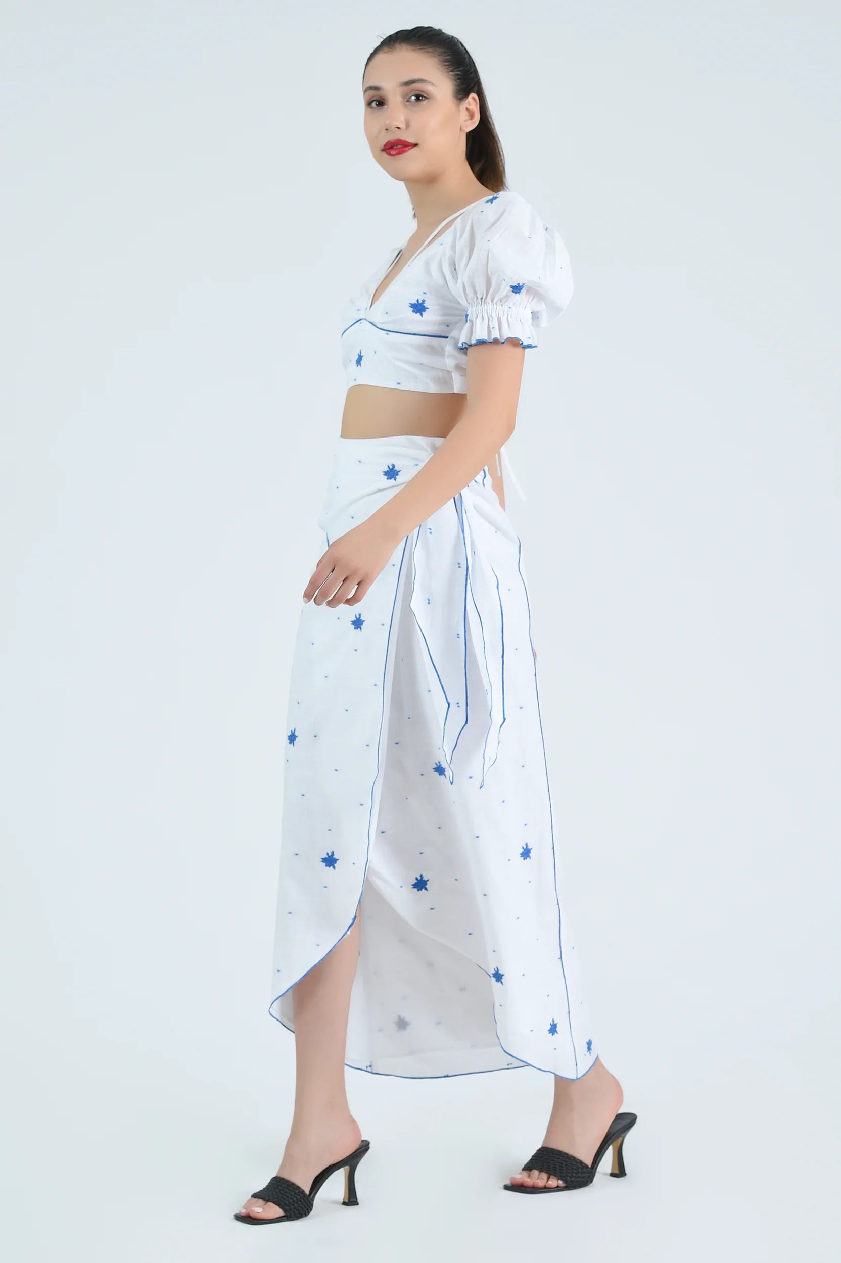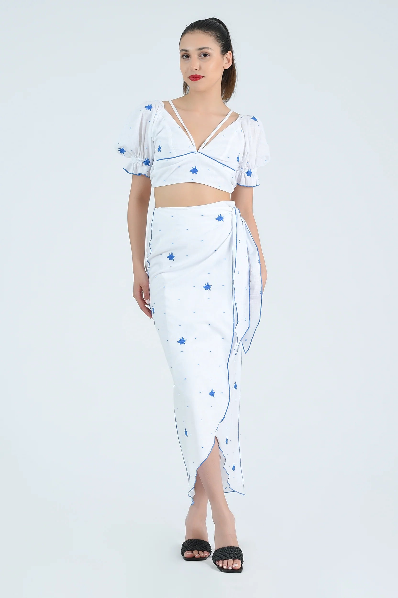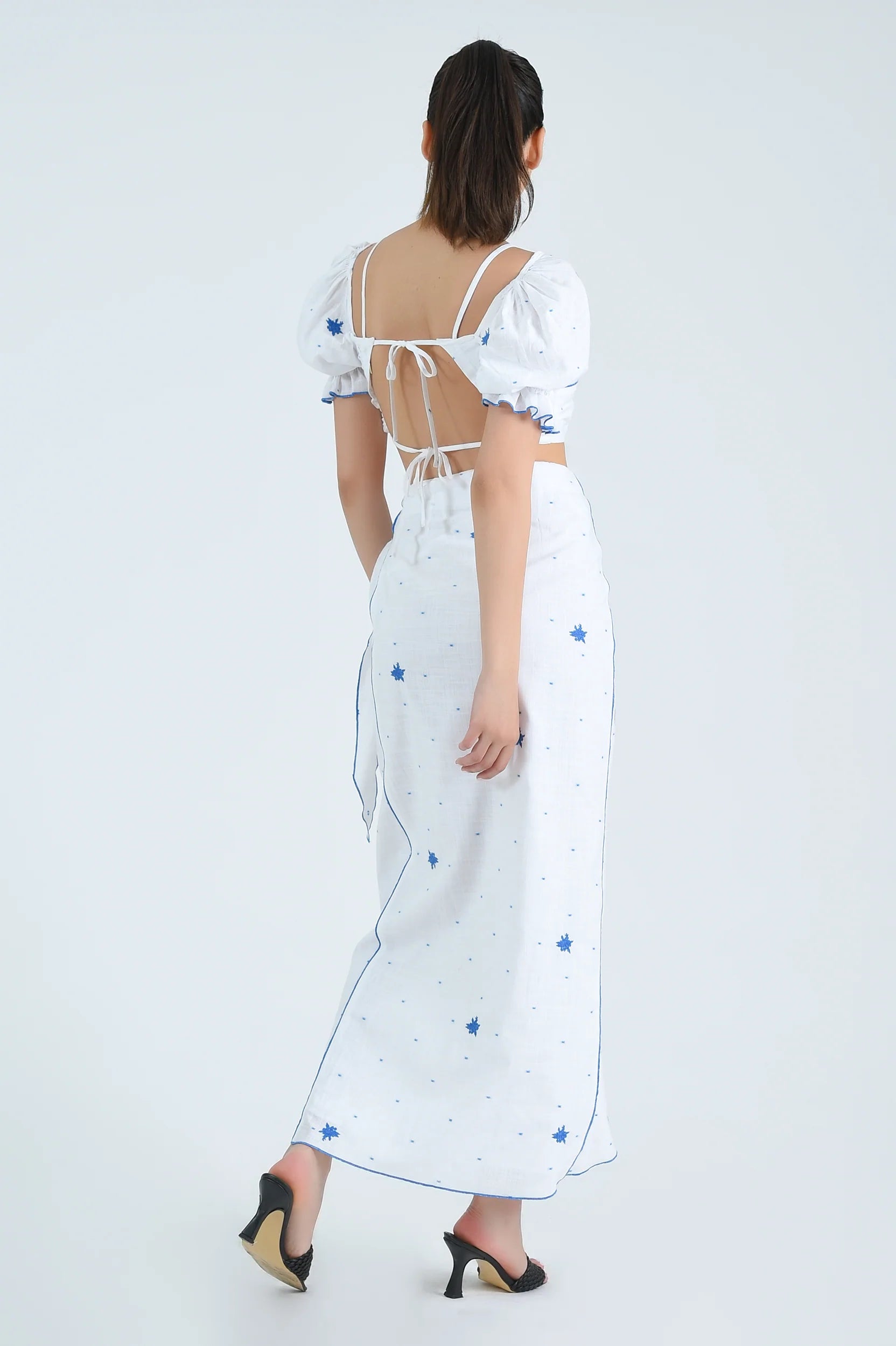 2-piece set featuring a crop puff-sleeve top and wrap midi skirt. Floral-embroidery adds charm, while a V-neck and back tie enhance the style.
