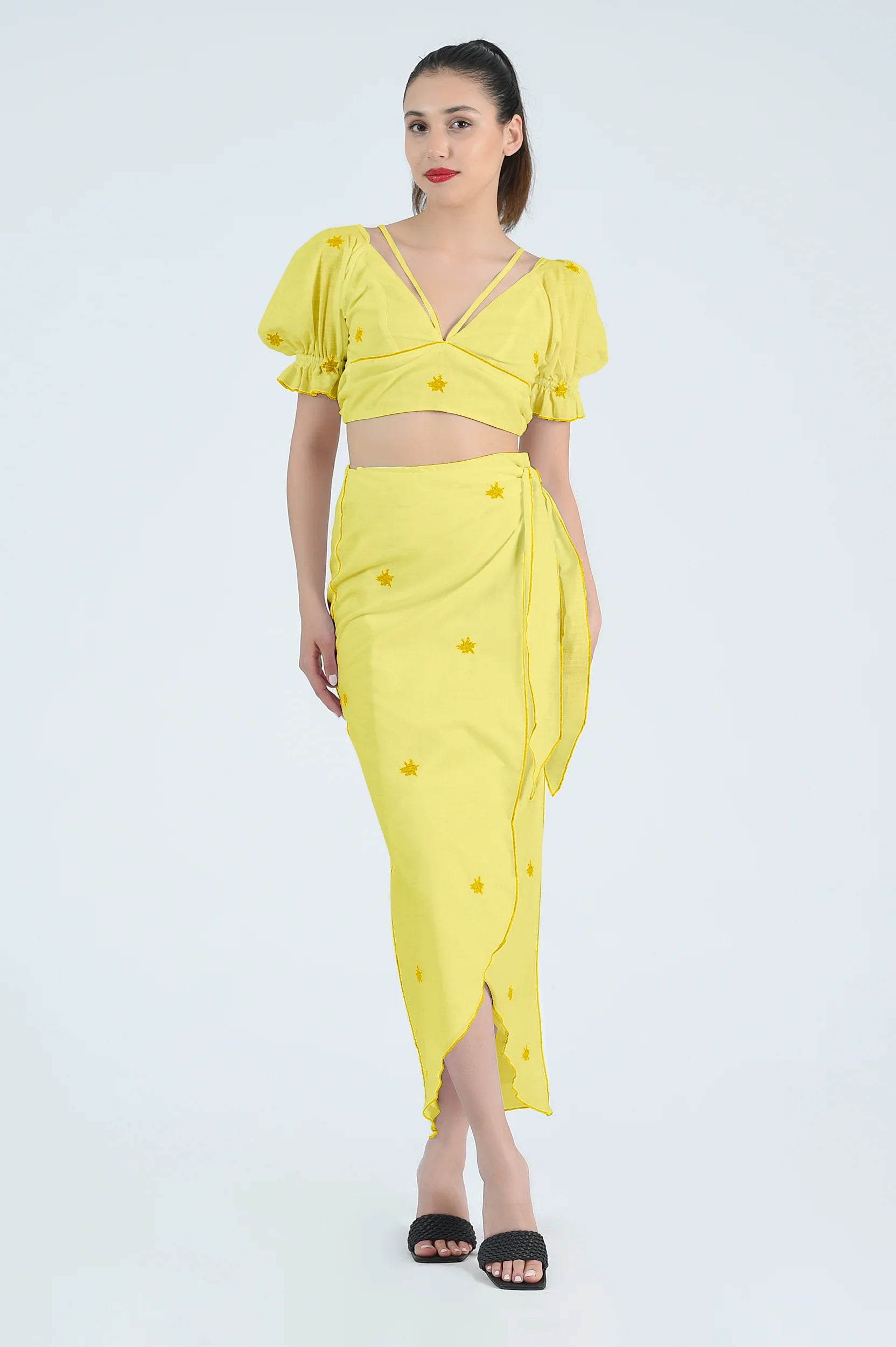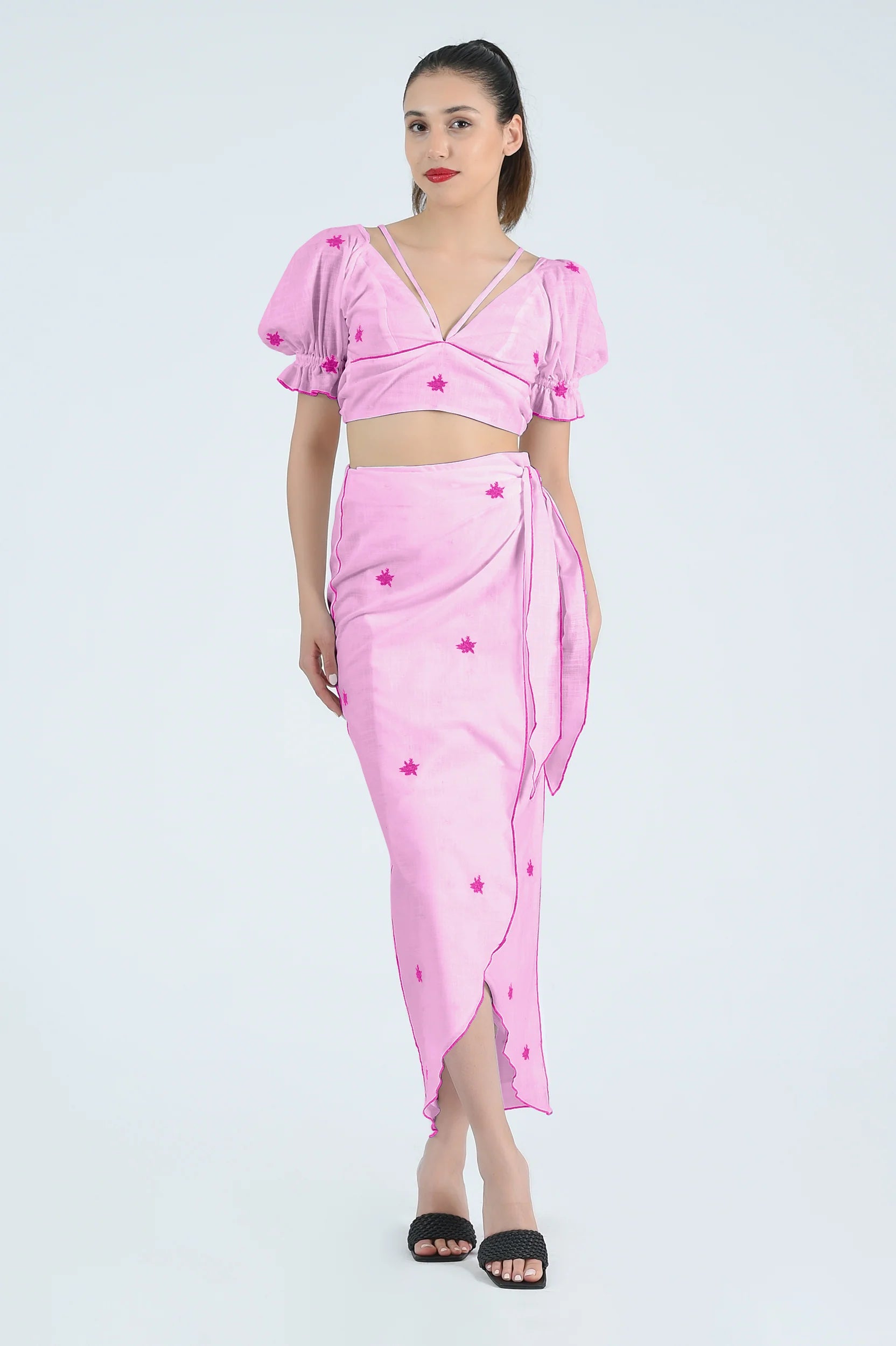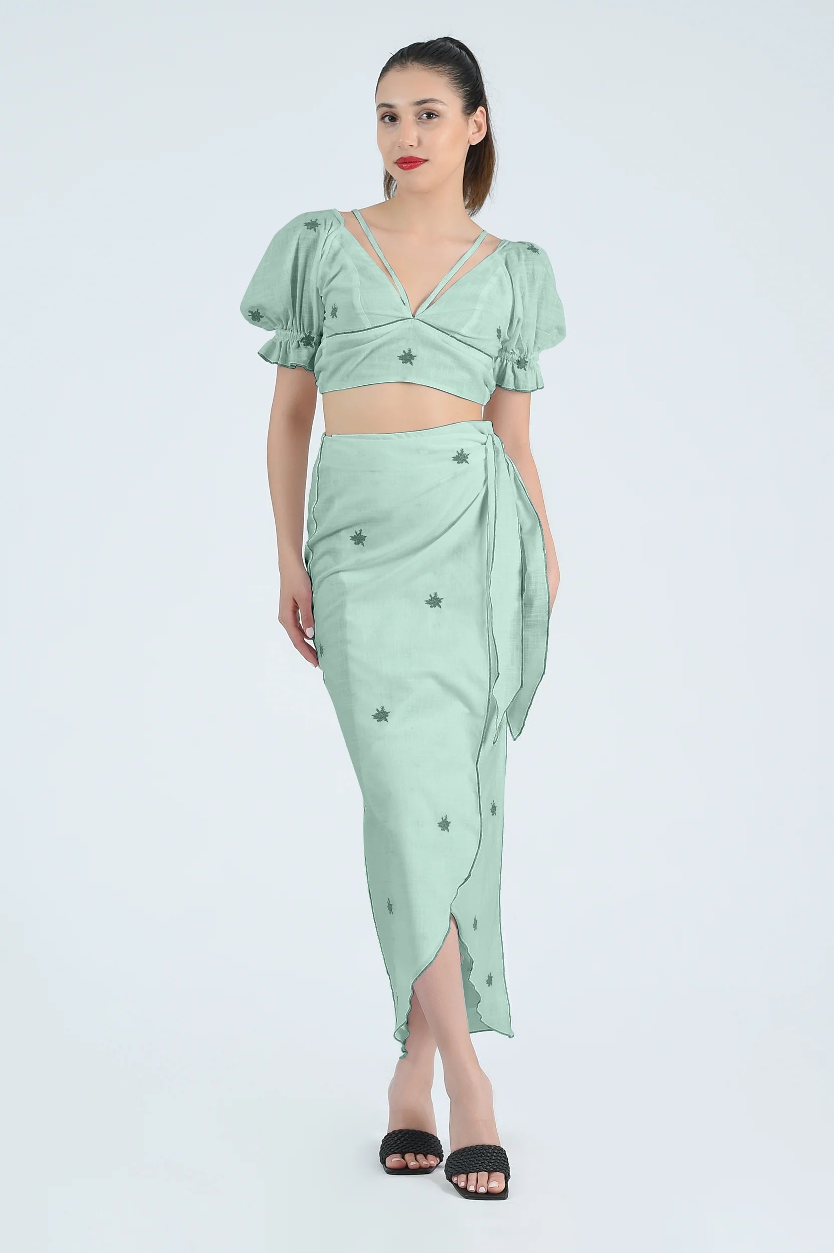 2-piece set featuring a crop puff-sleeve top and wrap midi skirt. Floral-embroidery adds charm, while a V-neck and back tie enhance the style.