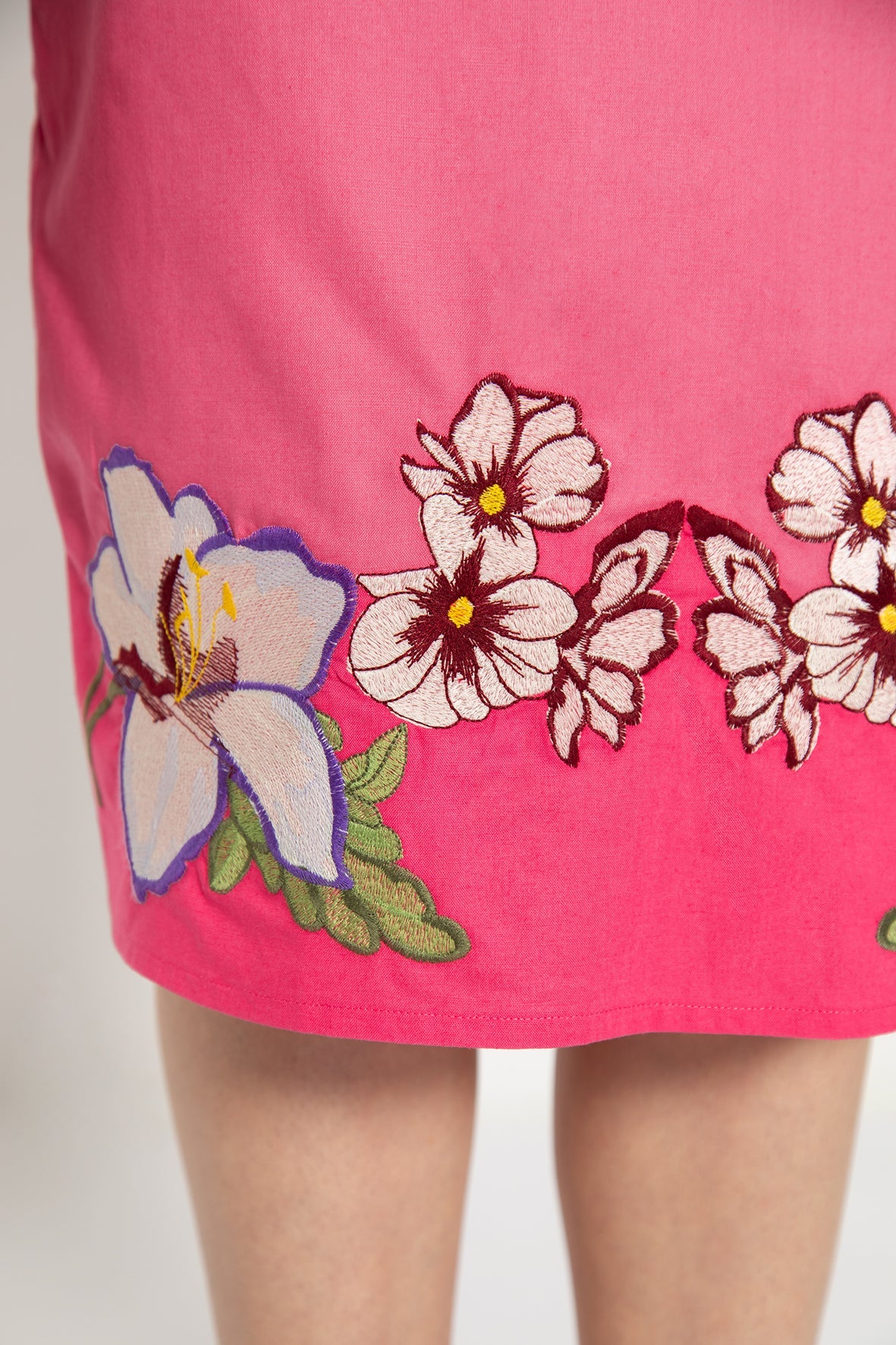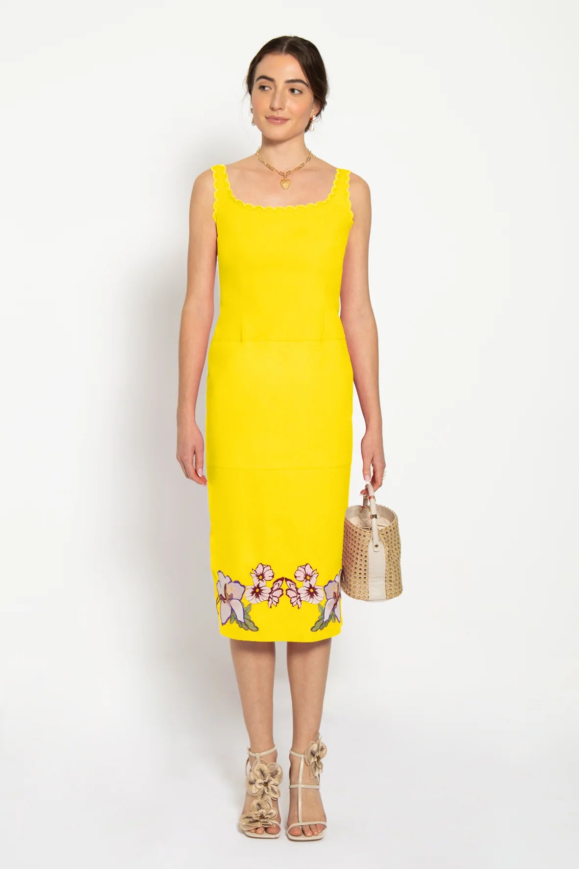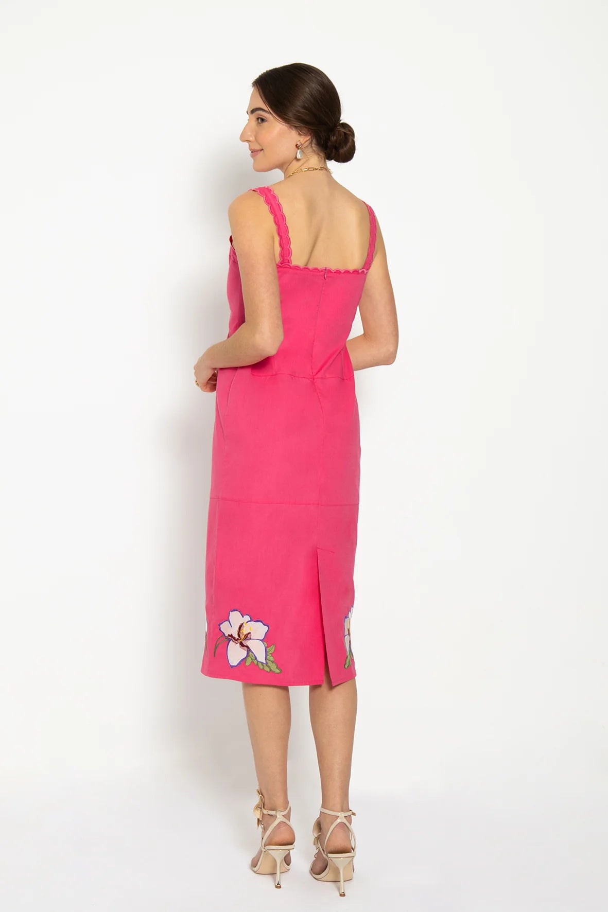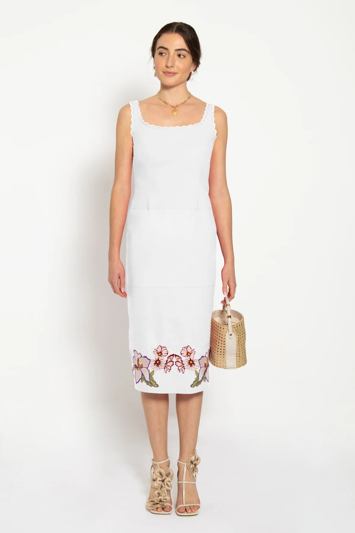 Elevate your style with this midi dress, featuring a refined silhouette and charming details. Delicate floral embroidery of hibiscus, orchid, and cherry blossom motifs adorns the hemline, perfectly complemented by a scalloped neckline and straps.