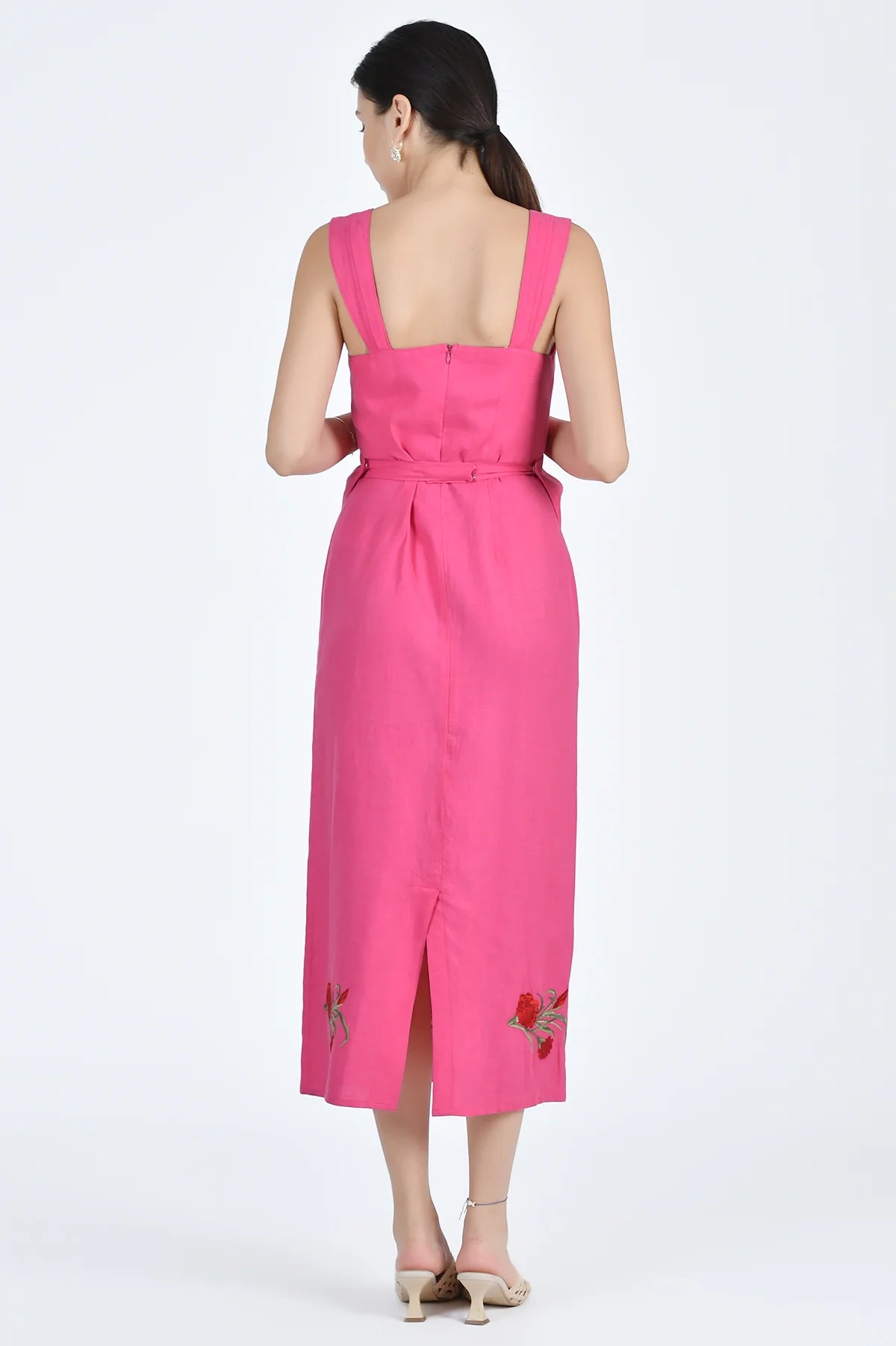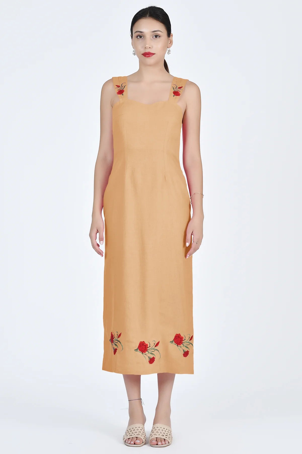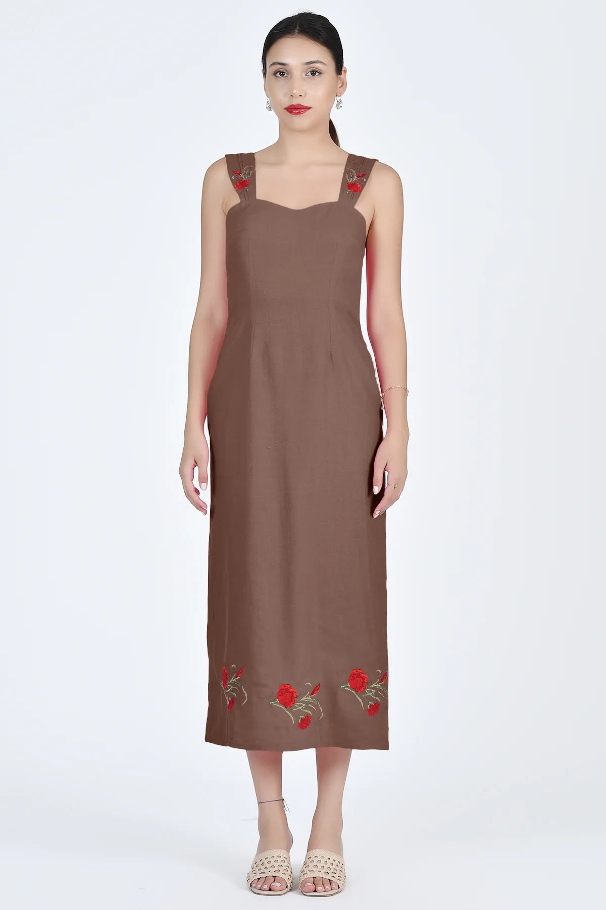 Drape yourself in effortless sophistication with this midi cotton dress. Crafted from breathable, linen-like cotton, it features a straight silhouette with a detachable bow detail, while floral embroidery adds a hint of elegance.