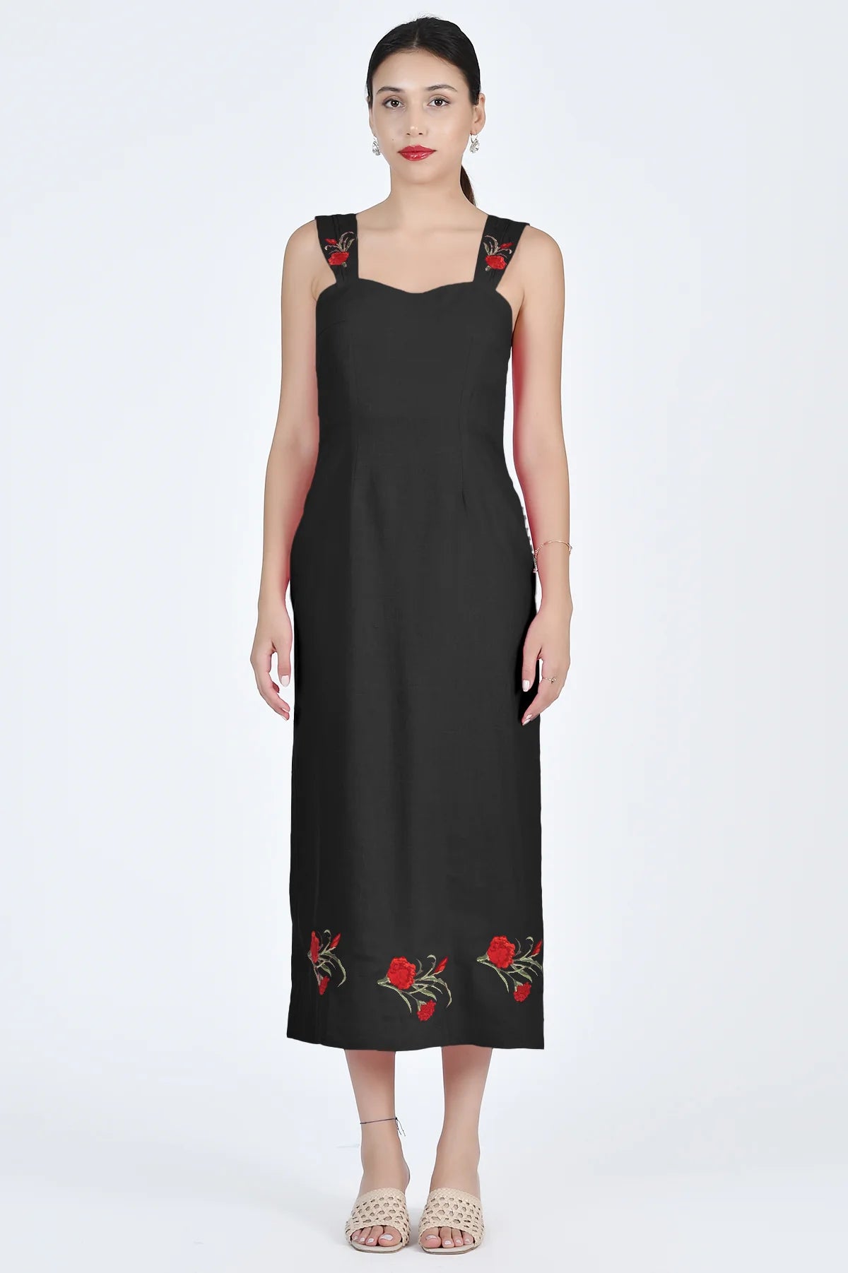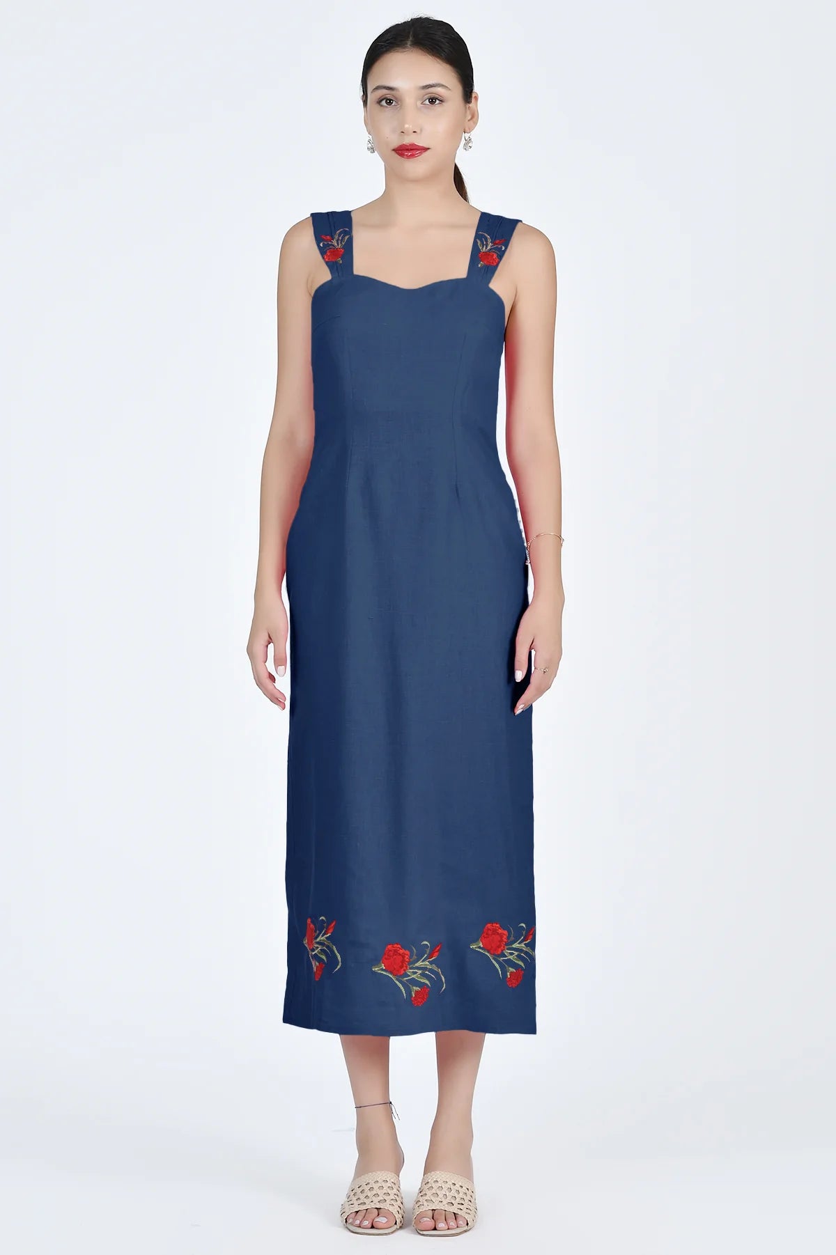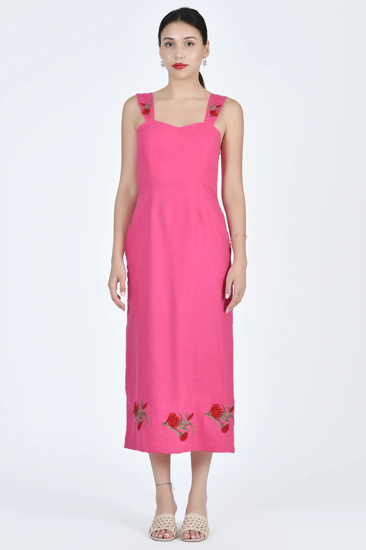 Drape yourself in effortless sophistication with this midi cotton dress. Crafted from breathable, linen-like cotton, it features a straight silhouette with a detachable bow detail, while floral embroidery adds a hint of elegance.